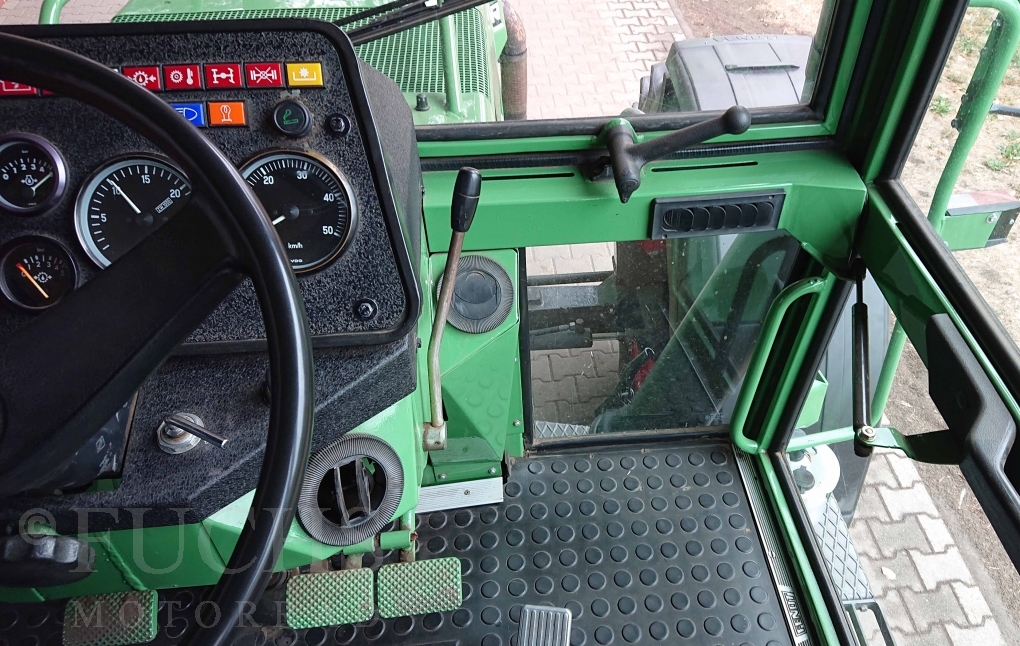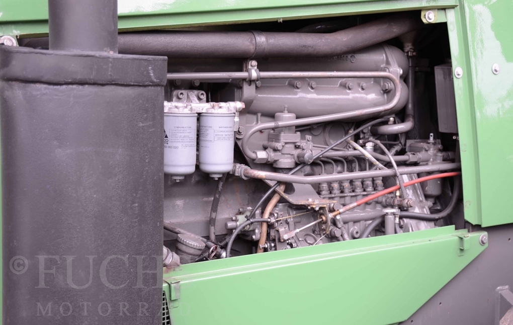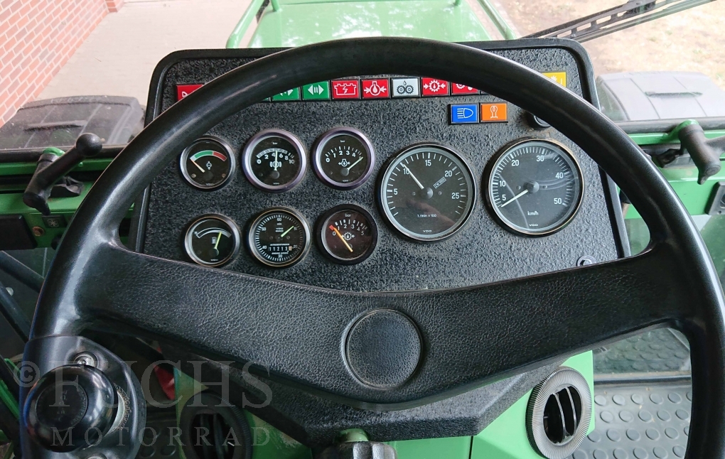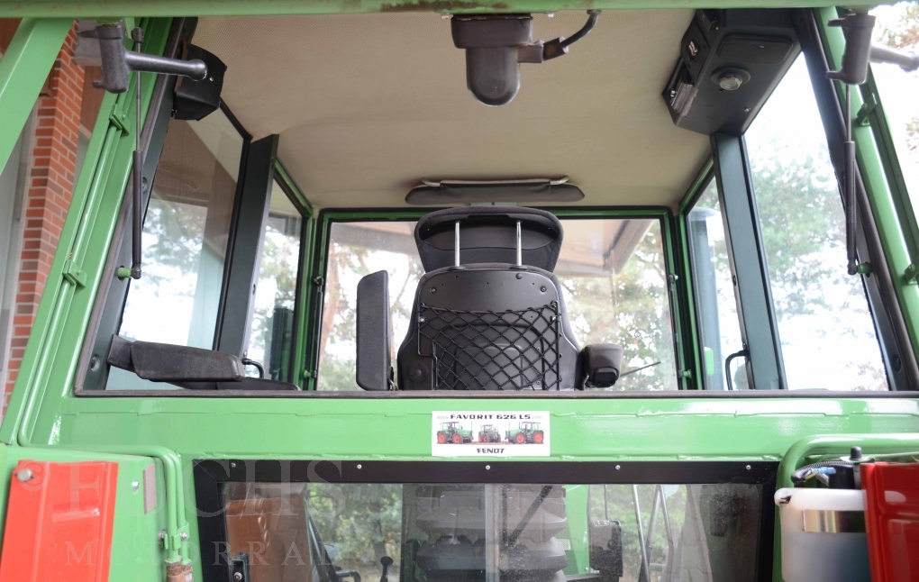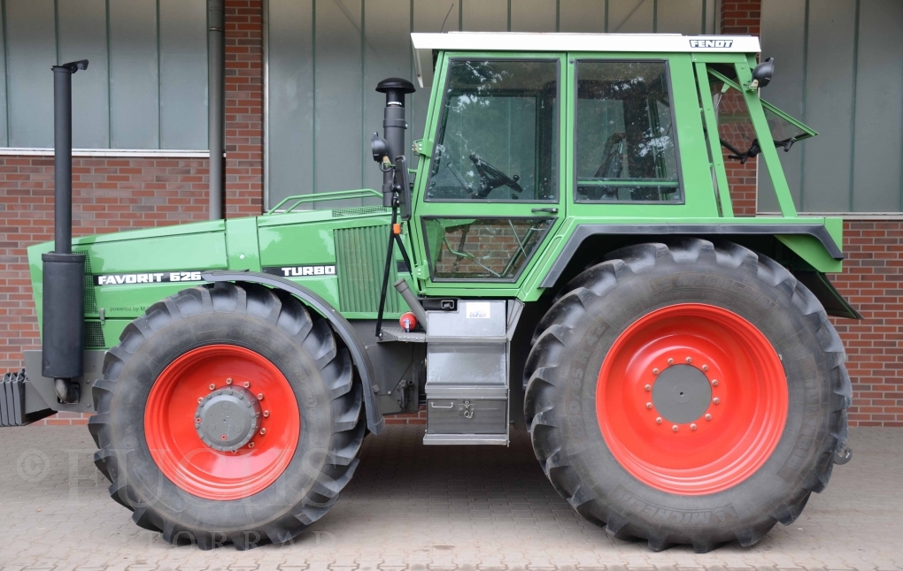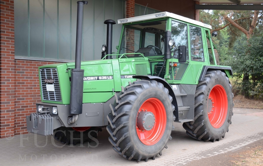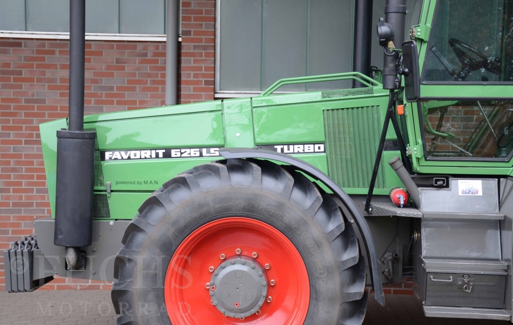 Unser Nasenbär wurde 1984 produziert. Die Erstzulassung erfolgte 1985 in Italien. Im Jahr 2012 wurde die Restaurierung in Deutschland abgeschlossen. Zur umfangreichen Restaurierung liegt eine Fotodokumentation und diverse Unterlagen vor. Mit der geringen Produktionsmenge von 61 Fahrzeuge zählt der Fendt Favorit 626 LS schon seit Jahren zu den gesuchten Traktoren weltweit. Ein Großteil der damaligen Produktion wurde nach Saudi Arabien exportiert. Die anspruchsvolle, komplizierte Konstruktion einschließlich der Transaxle Bauweise hat zu dieser Sonderstellung der Oldtimer Traktoren geführt. Der Motor wurde vor der Vorderachse angeordnet und in einem stabilen Plattenrahmen aufgehängt. Noch heute überzeugt der Fendt mit seiner komfortablen Bedienung und Kraftentfaltung. Unser Nasenbär war seit seiner Restaurierung immer wieder im angemessenen Einsatz, damit mögliche Standschäden verhindert wurden. Bitte stimmen Sie einen Besichtigungstermin mit uns ab, da der Nasenbär auf Grund seiner Größe ausgelagert wurde. Immerhin hat das Fahrzeug 42 Zoll am Hinterrad, ein Gewicht von rund 10 Tonnen, 3.10 m Höhe, 5.66m Länge und eine Gesamtbreite von 2.44 m bei einer Höchstgeschwindigkeit von 40 km/h