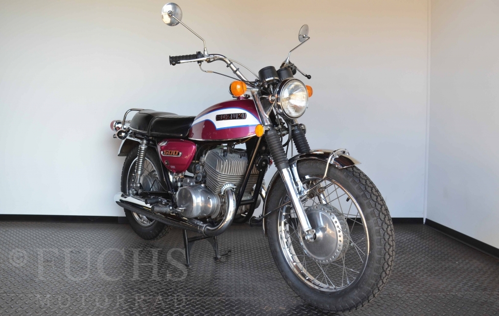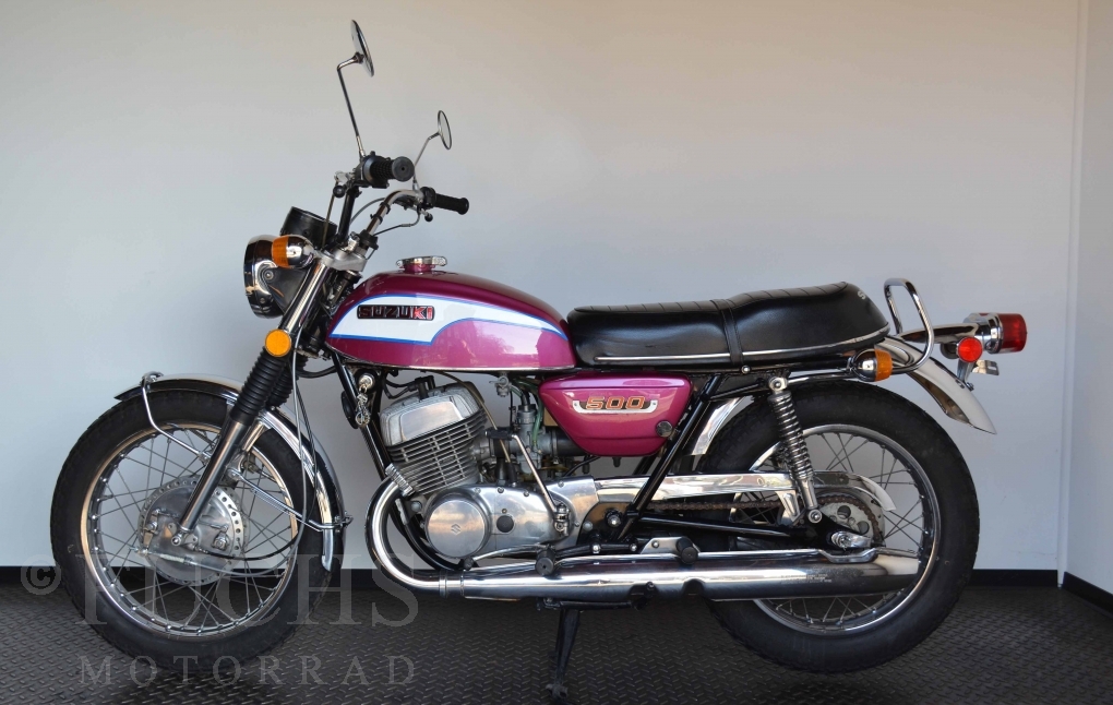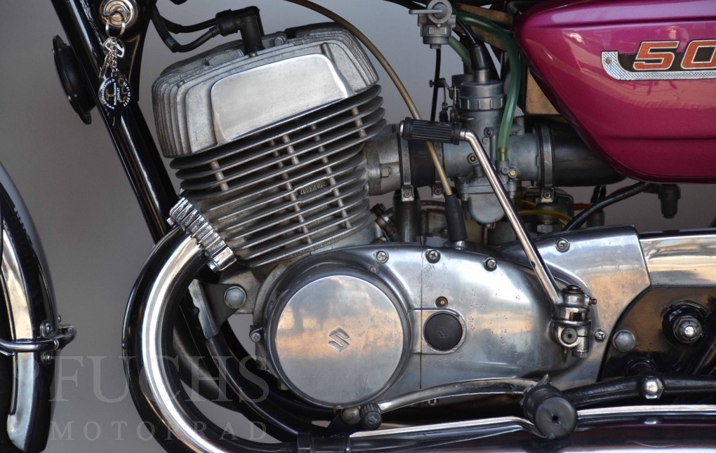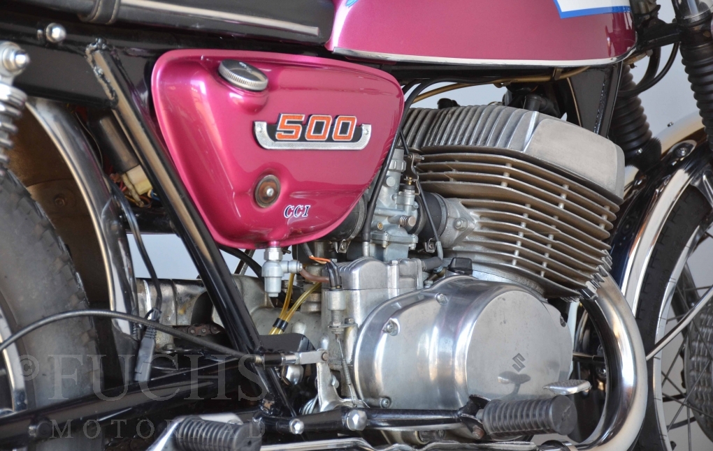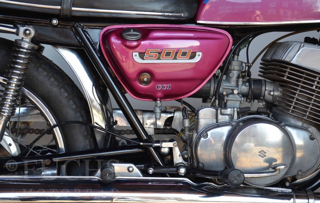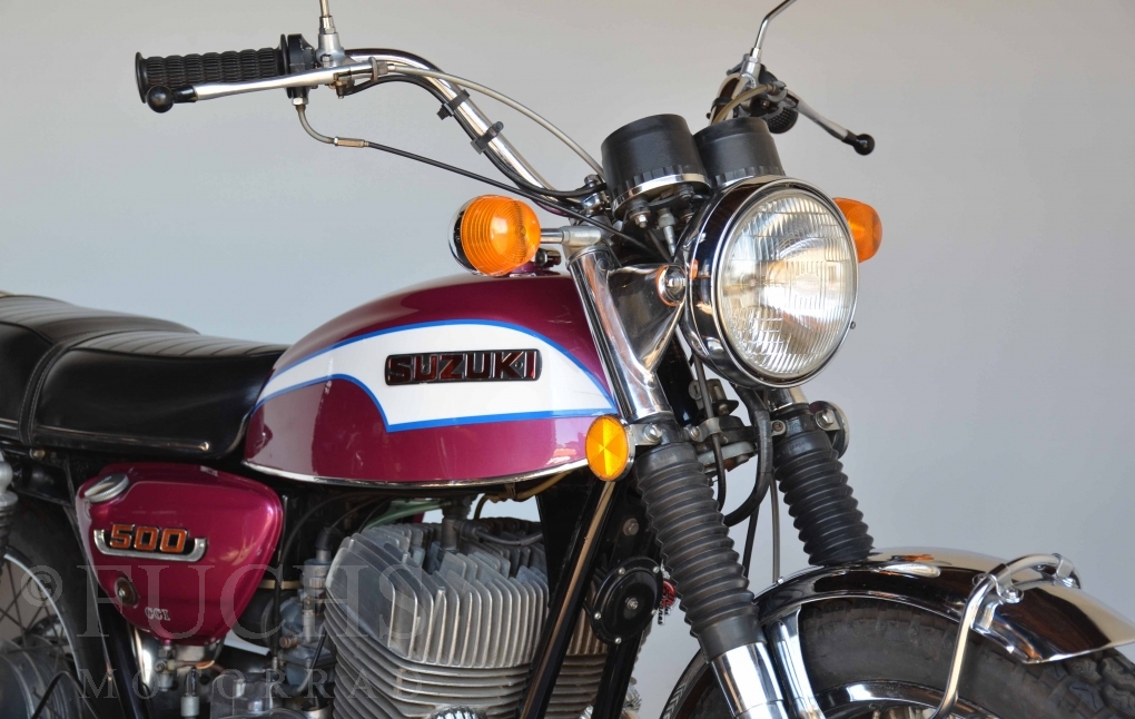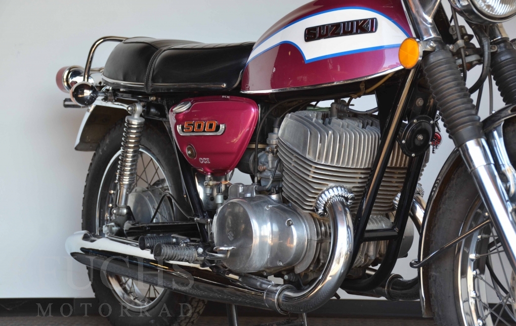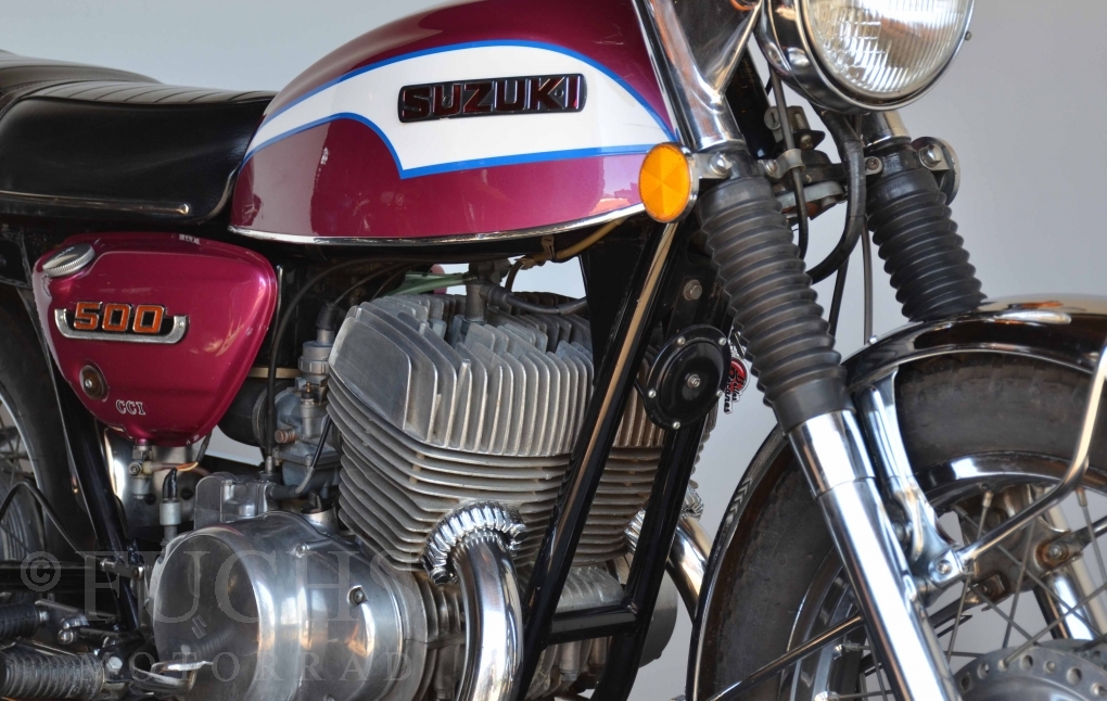 Die T 500 stammt aus Kanada und wurde vor einigen Jahren von einem Sammler in Frankreich zugelassen und auch regelmäßig bewegt. Wir haben die T 500 übernommen, weil es eine gut gepflegte originale Suzuki ist. Technisch funktioniert die leistungsstarke 2-Takt Maschine sehr gut.
