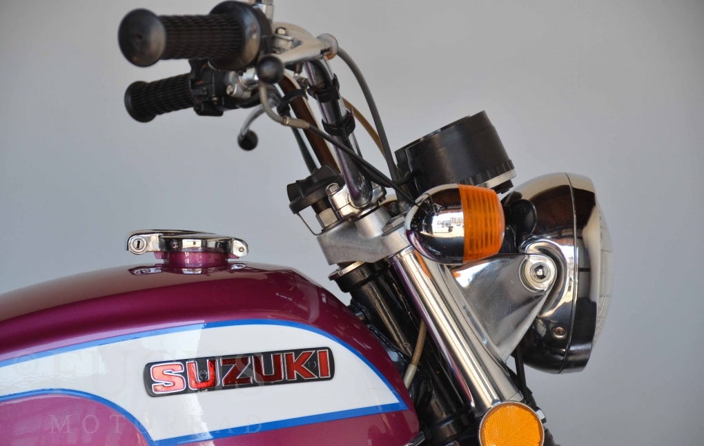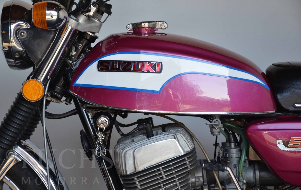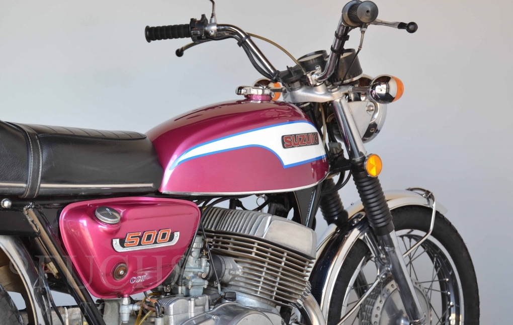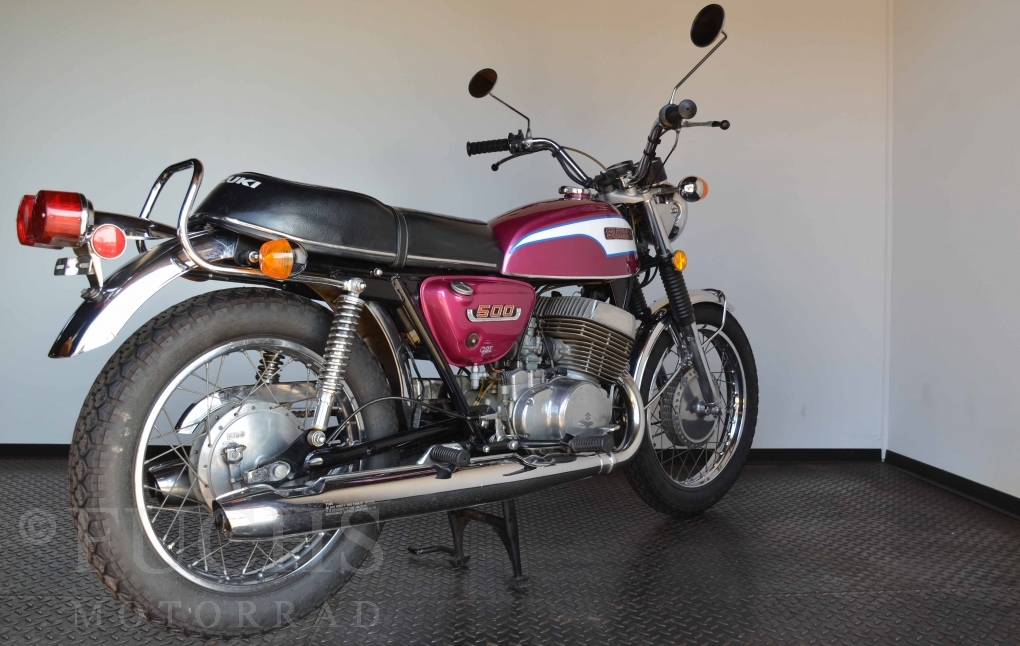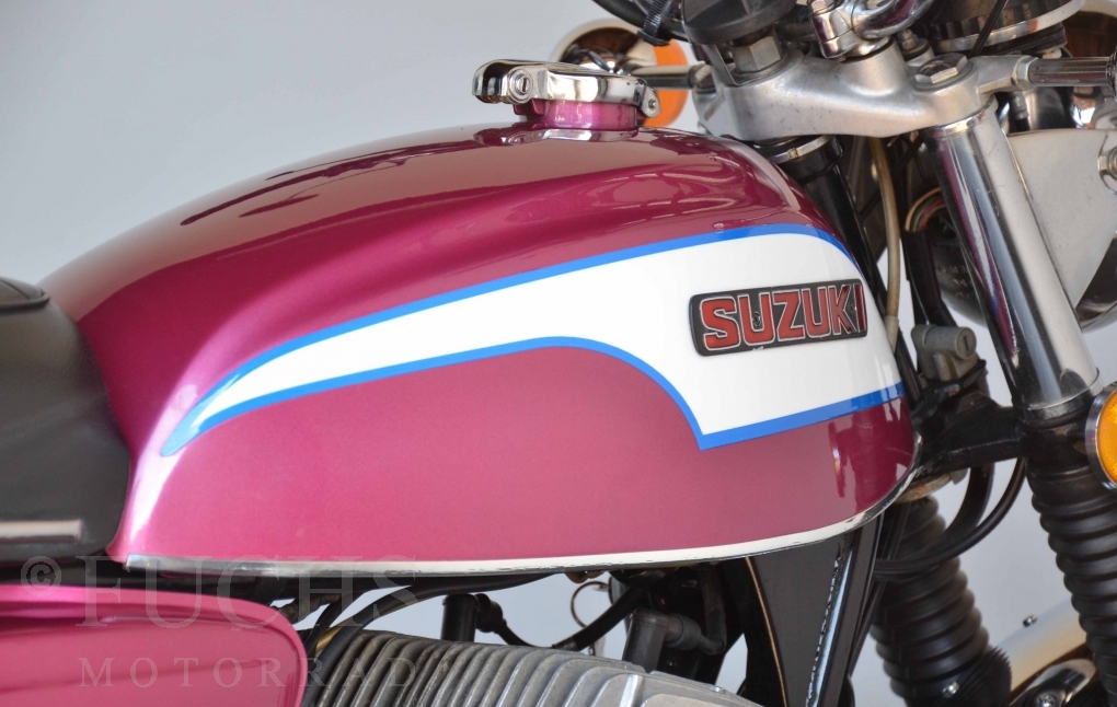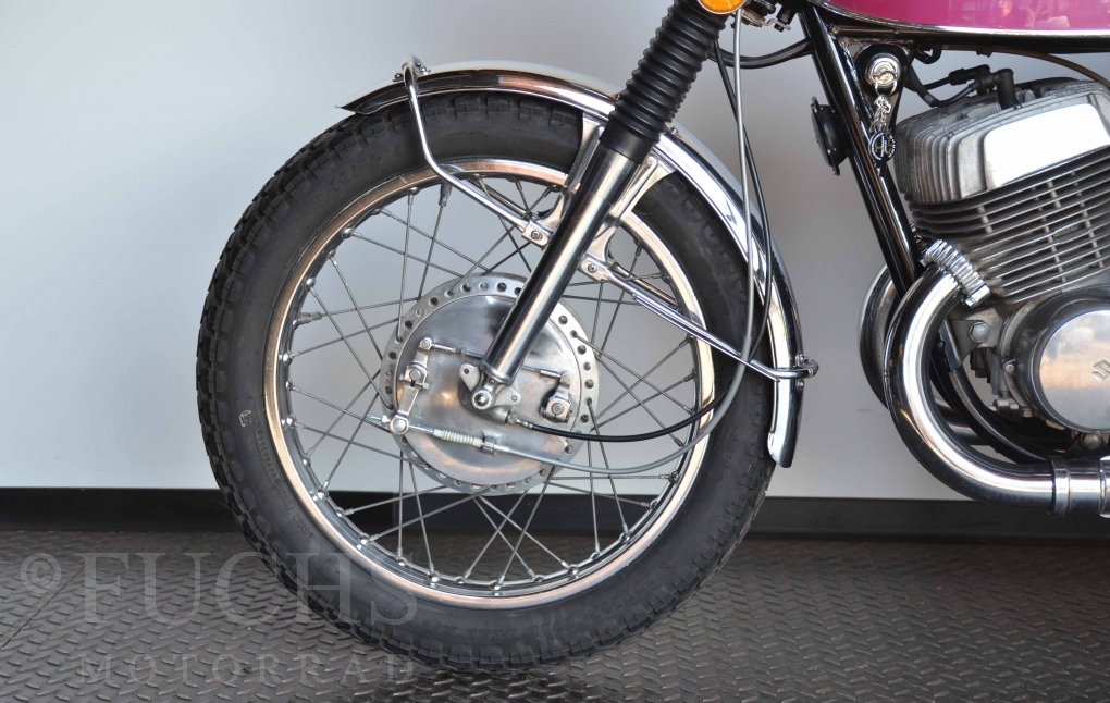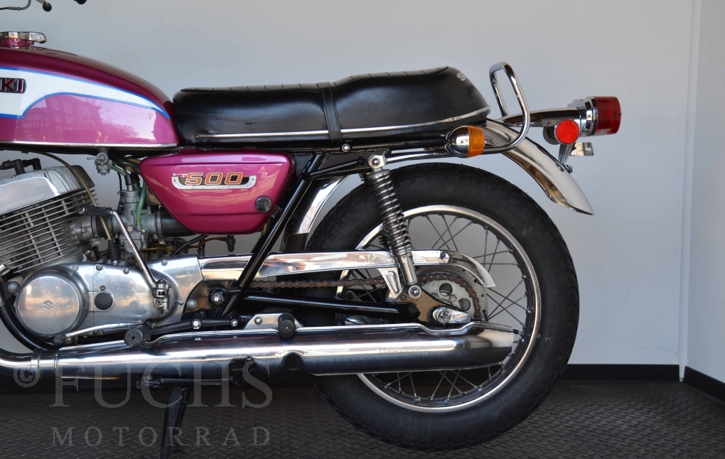 Die T 500 stammt aus Kanada und wurde vor einigen Jahren von einem Sammler in Frankreich zugelassen und auch regelmäßig bewegt. Wir haben die T 500 übernommen, weil es eine gut gepflegte originale Suzuki ist. Technisch funktioniert die leistungsstarke 2-Takt Maschine sehr gut.