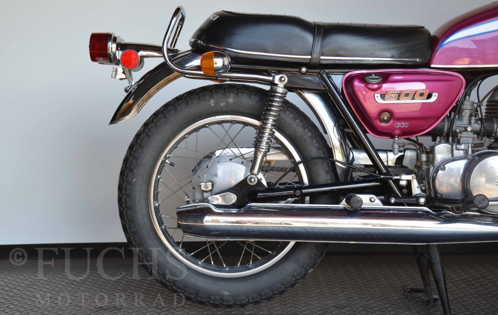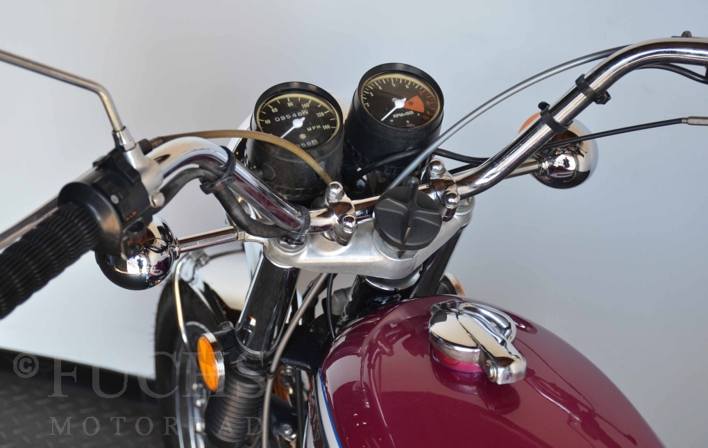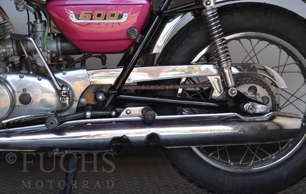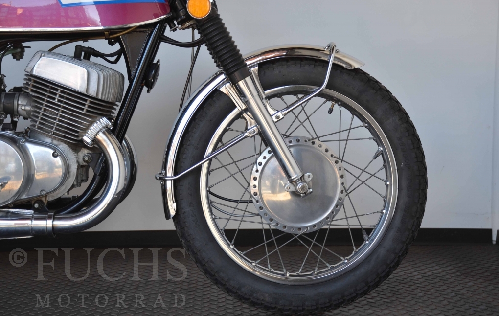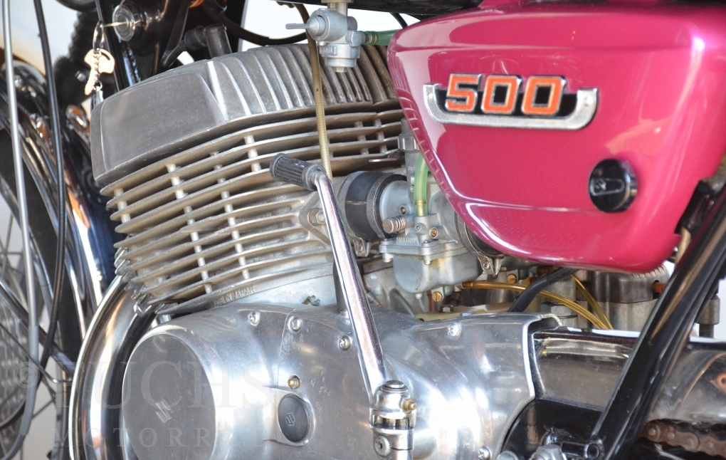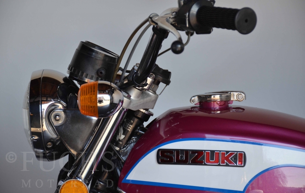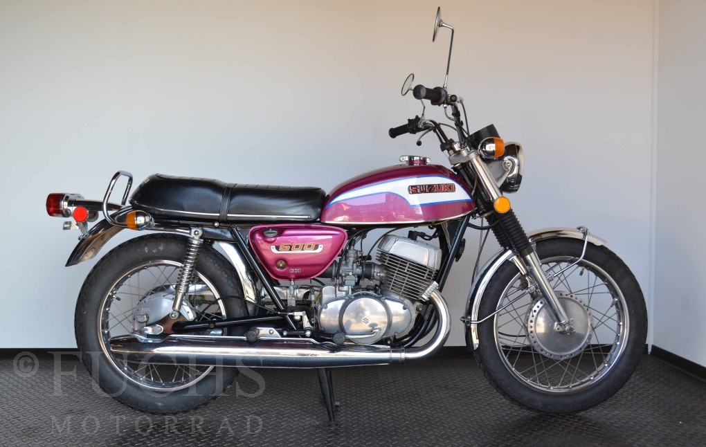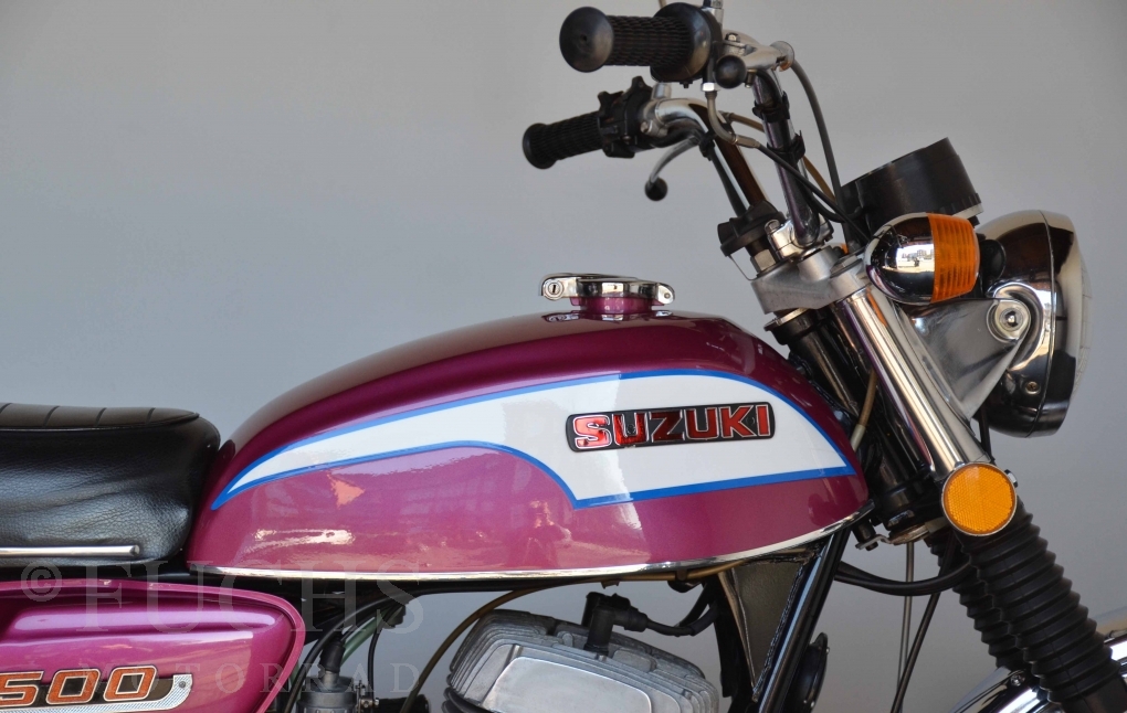 Die T 500 stammt aus Kanada und wurde vor einigen Jahren von einem Sammler in Frankreich zugelassen und auch regelmäßig bewegt. Wir haben die T 500 übernommen, weil es eine gut gepflegte originale Suzuki ist. Technisch funktioniert die leistungsstarke 2-Takt Maschine sehr gut.