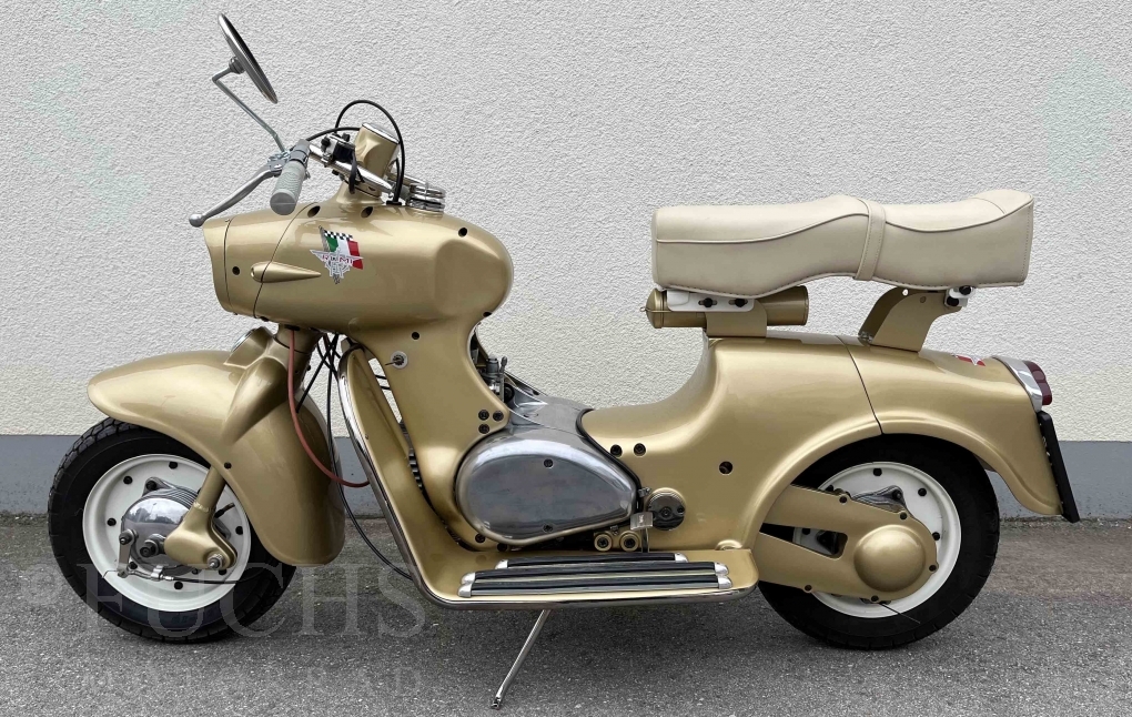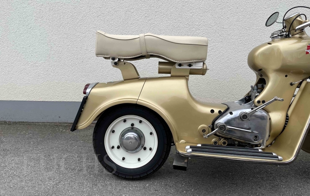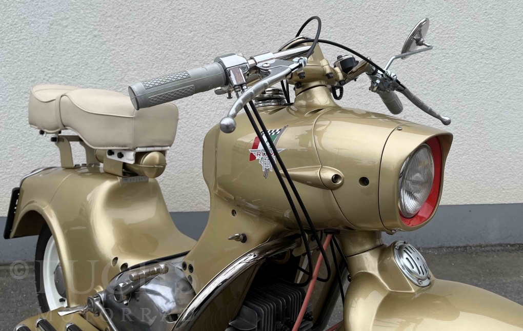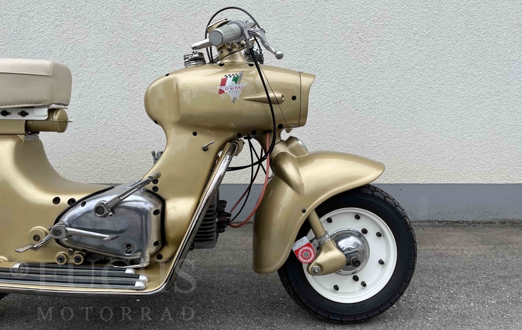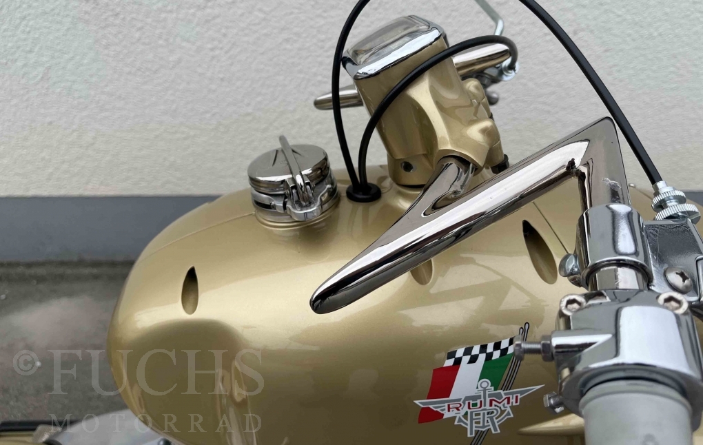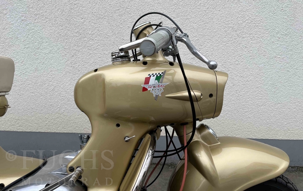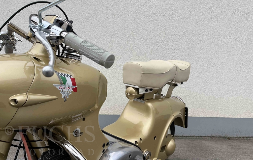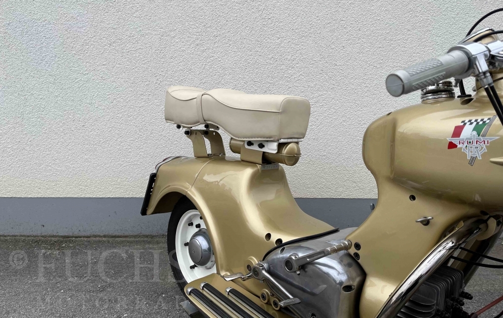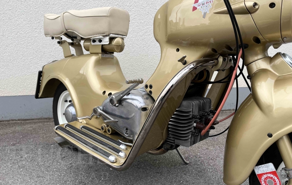 Nachdem Rumi mehrere Erfolge in Frankreich beim 24 Stunden Rennen erreicht hat, wurde mit dem Sondermodell Bol D or in die Märkte gebracht. In erster Linie wurden die wenigen Exemplare nach England und Frankreich exportiert. Es bot sich die goldene Farbe an, denn in Frankreich wurde auch ein Goldpokal gewonnen. Mit einer Höchstgeschwindigkeit von rund 130 km/h einer der schnellsten Roller seiner Zeit. Unser Exemplar ist mit den typischen Details wie einem Z-Lenker und 140 km/h Tacho ausgestattet. Wesentlicher sind selbstverständlich sind die zwei Vergaser, die den höher verdichteten Motor mit ausreichend Kraftstoff versorgen, damit die Ameise richtig vorwärts geht.