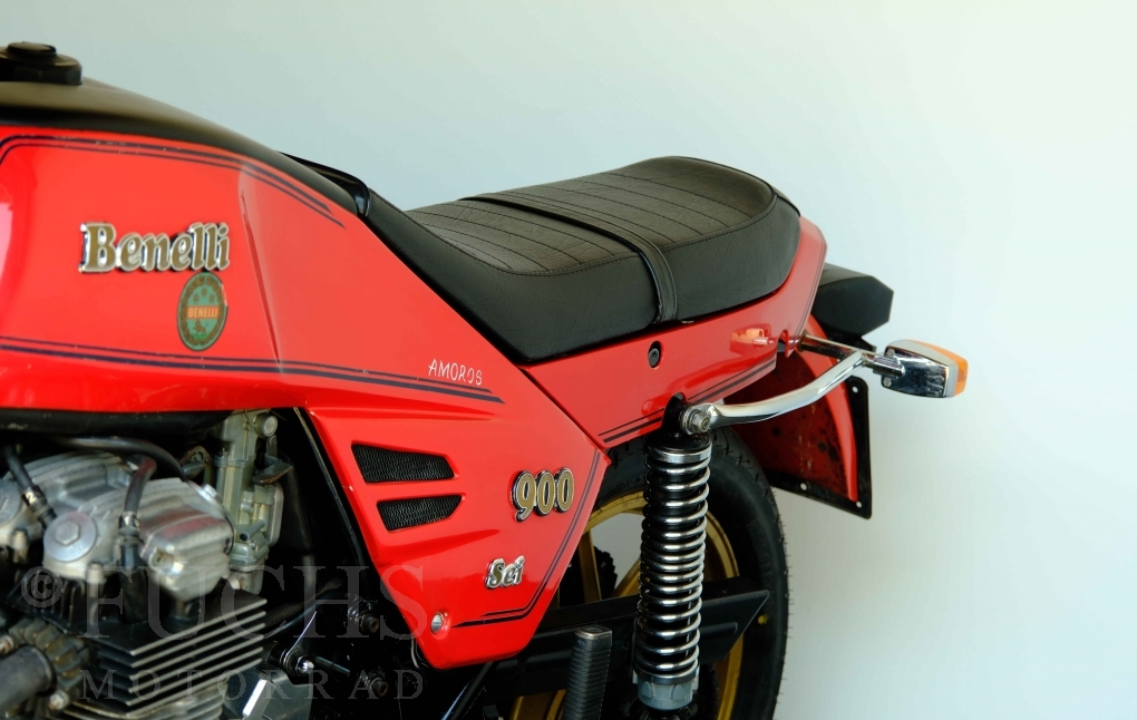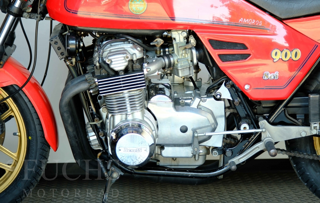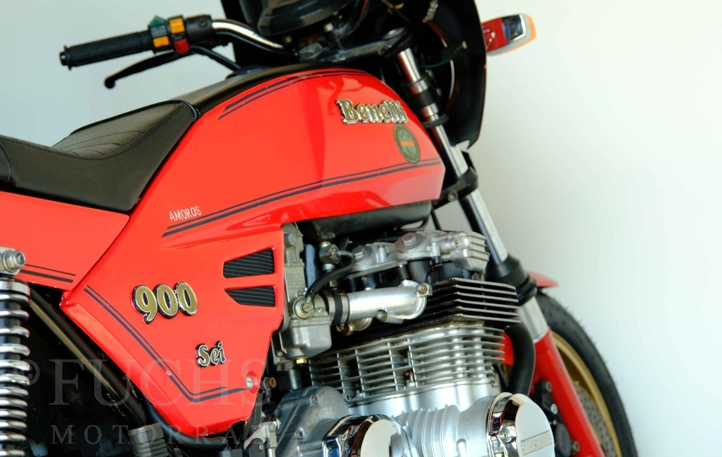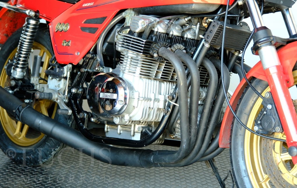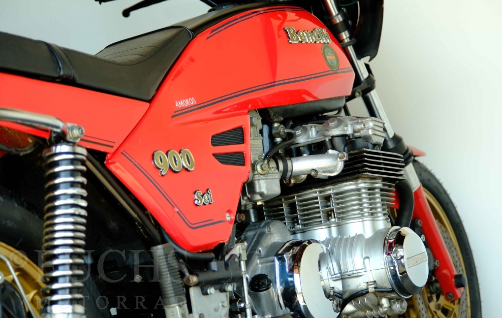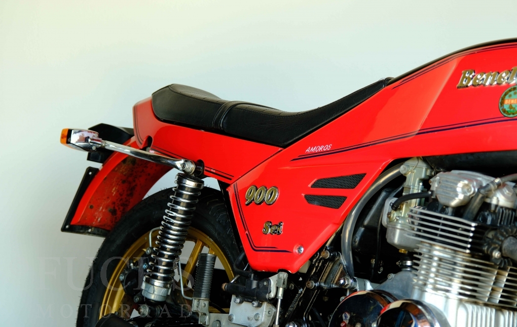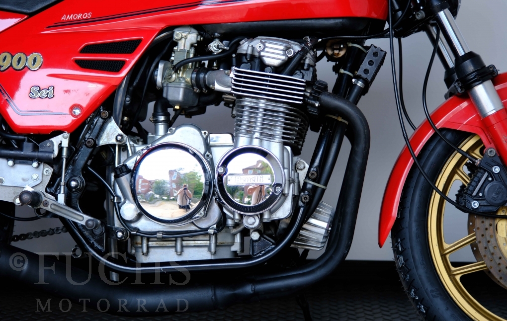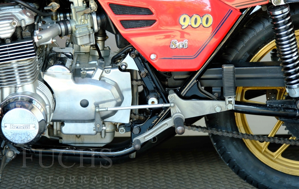 Die Benelli 900 Sei stammt aus Italien und wurde von uns teilweise restauriert. Unser erster Schritt war, dass die Kupplung überholt wurde. Dann haben wir glücklicherweise noch eine sehr gute Marvin Auspuffanlage finden können. Damit der schöne Sound auch entspannt genossen werden kann, haben wir eine moderne Zündanlage verbaut. Mit der überholten Bremsanlage, neuen Reifen, neuer Batterie steht die schöne Benelli bereit für einen Käufer, der die De Tomaso Zeit bei Benelli erfahren will und dabei sich über ein grandioses Sounderlebnis des 6-Zylinders freut.
