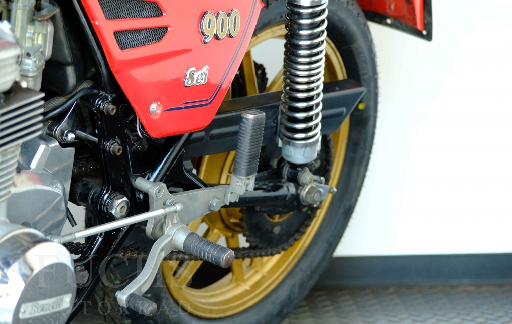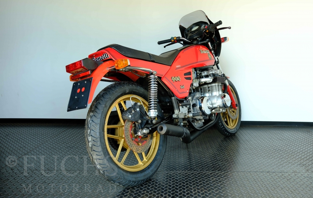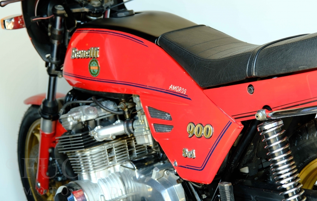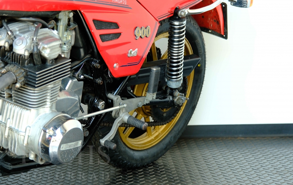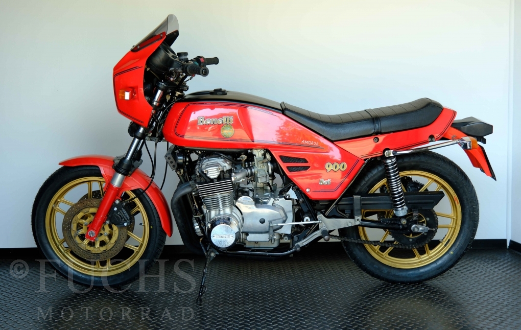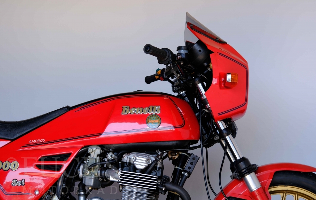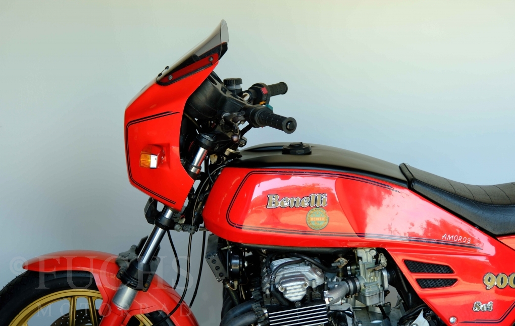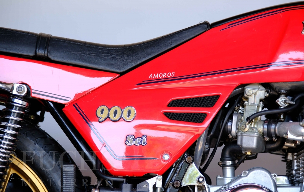 Die Benelli 900 Sei stammt aus Italien und wurde von uns teilweise restauriert. Unser erster Schritt war, dass die Kupplung überholt wurde. Dann haben wir glücklicherweise noch eine sehr gute Marvin Auspuffanlage finden können. Damit der schöne Sound auch entspannt genossen werden kann, haben wir eine moderne Zündanlage verbaut. Mit der überholten Bremsanlage, neuen Reifen, neuer Batterie steht die schöne Benelli bereit für einen Käufer, der die De Tomaso Zeit bei Benelli erfahren will und dabei sich über ein grandioses Sounderlebnis des 6-Zylinders freut.
