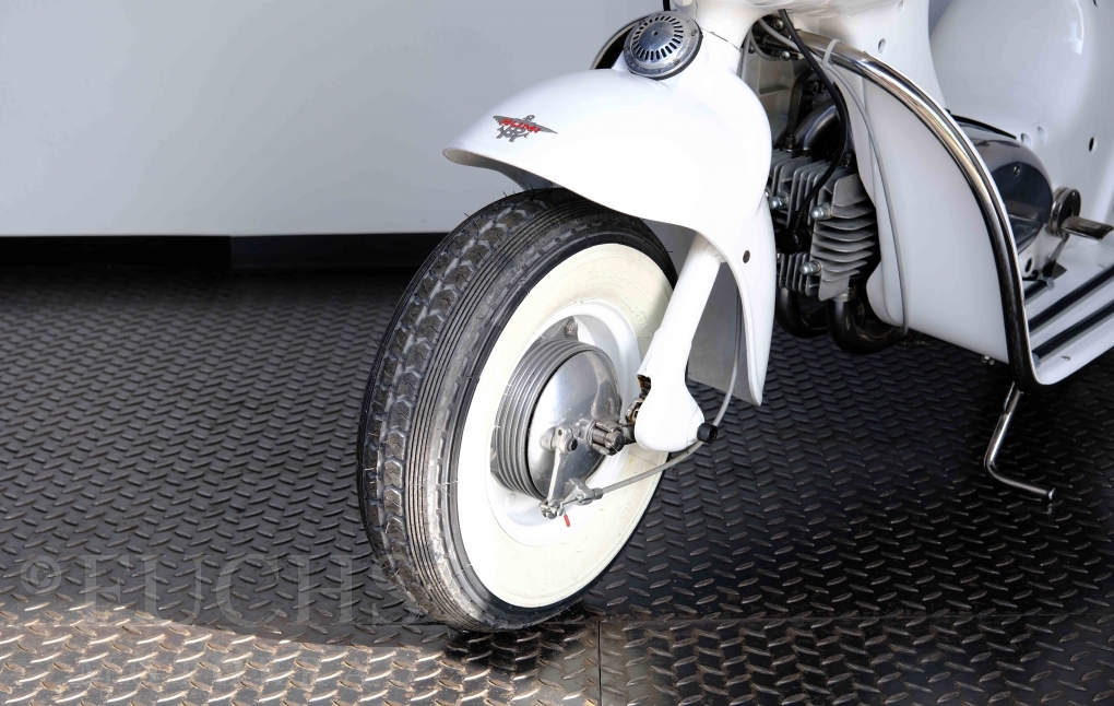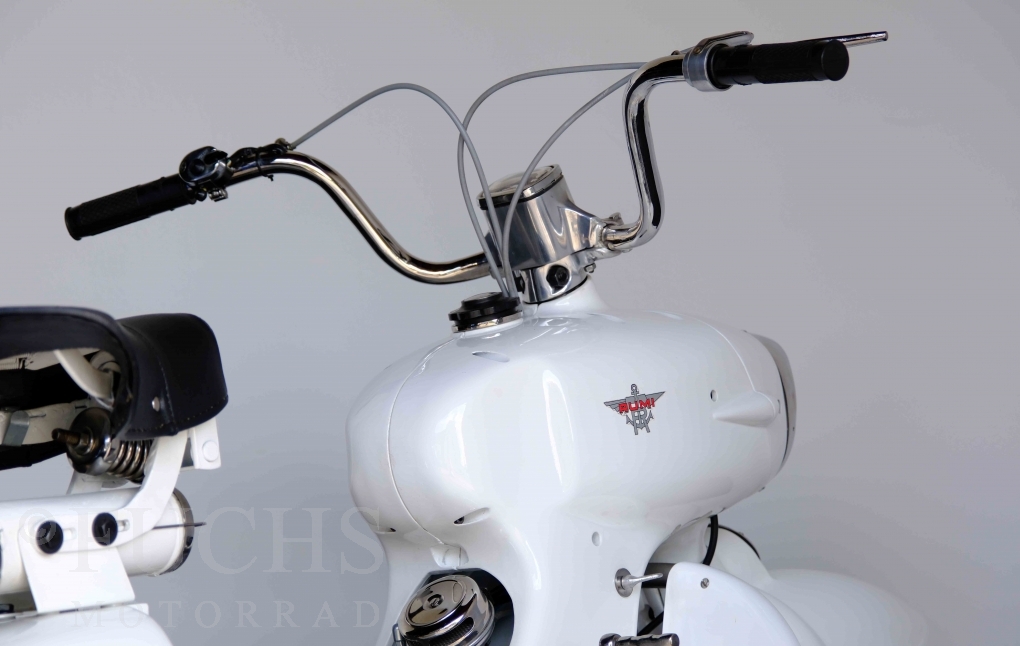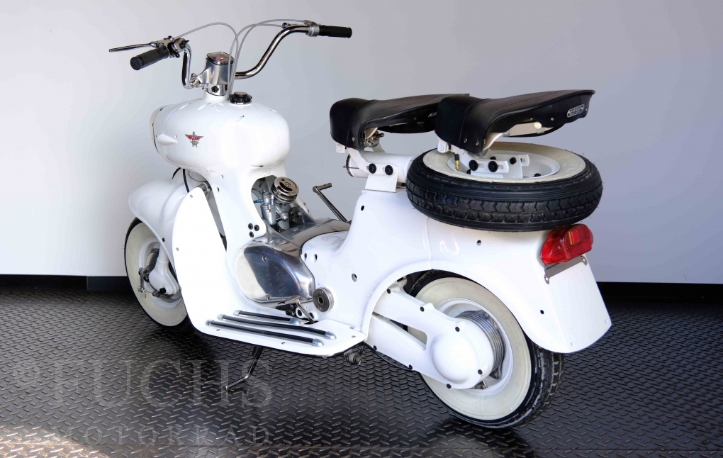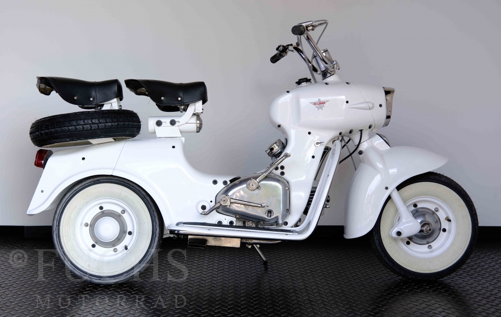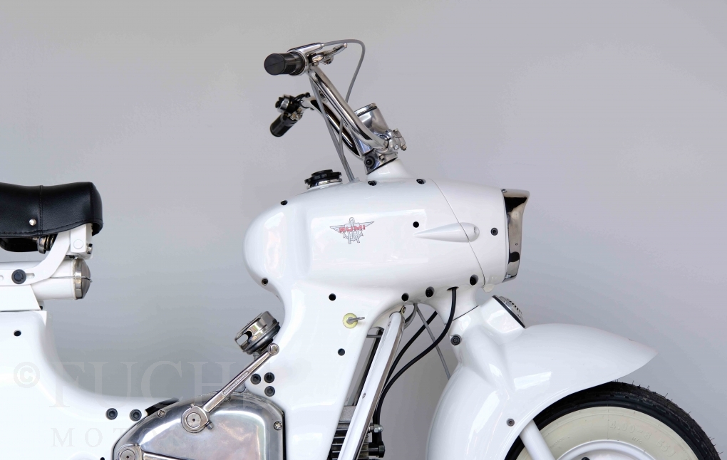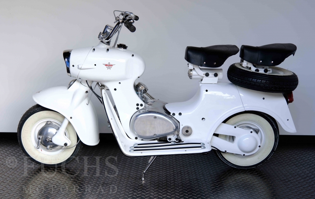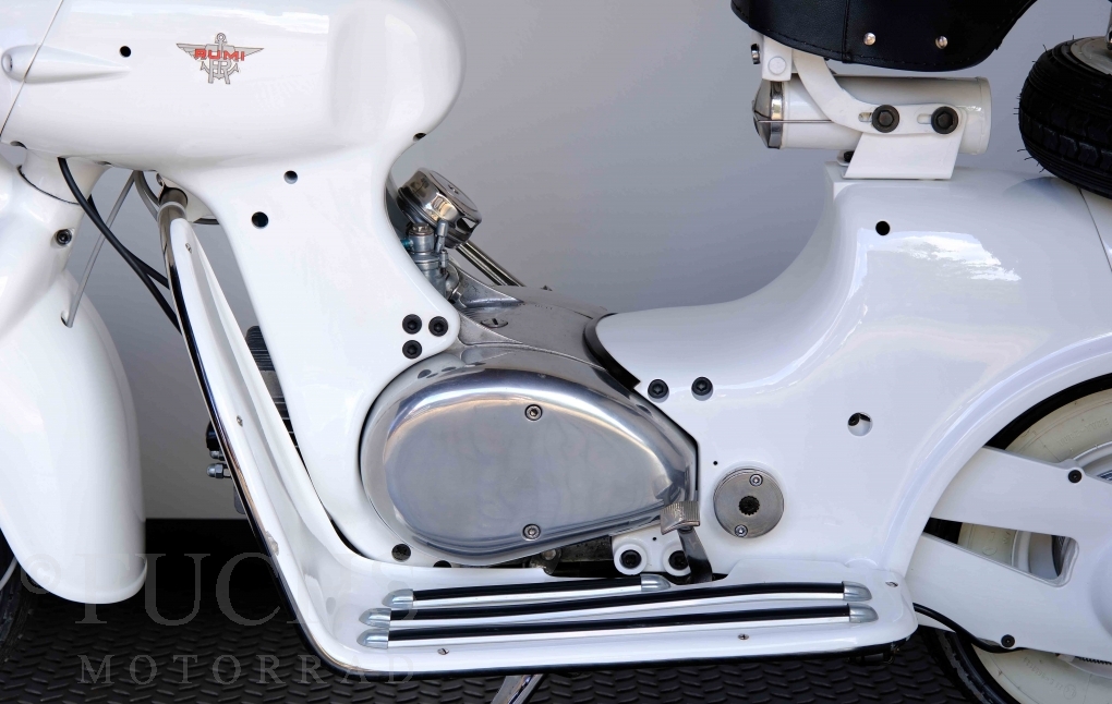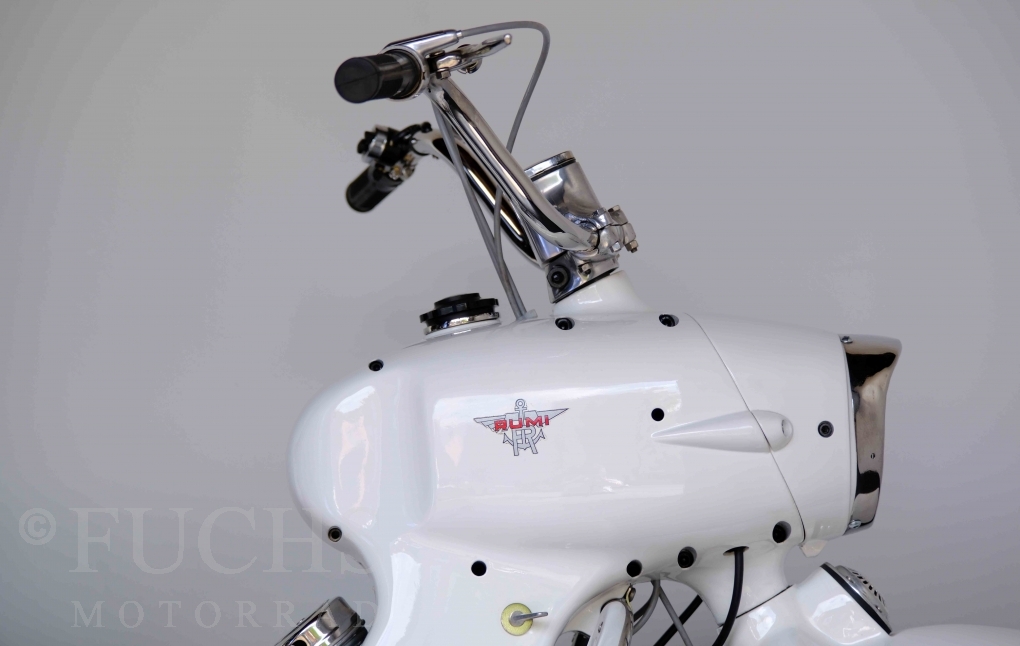 Der Formichino Roller wurde von Donnino Rumi entwickelt. Ziel der Entwicklung war die Marktdominanz Lambretta und Vespa zu stören. Die speziellen Metallformen wurde in einer Rumi Tochtergesellschaft in Bergamo produziert. Unser Formichino ist in einem schönen Zustand. CEV Scheinwerfer, CEV Rücklicht, zweiteilige 8 Zoll Felgen, Veglia 0-100 km/h Tachometer, Lenker mit verbundenen Armaturen machen die Rumi zu einem gut restaurierten Oldtimer. Selbstverständlich sind auch die Kleeblattschrauben verbaut.