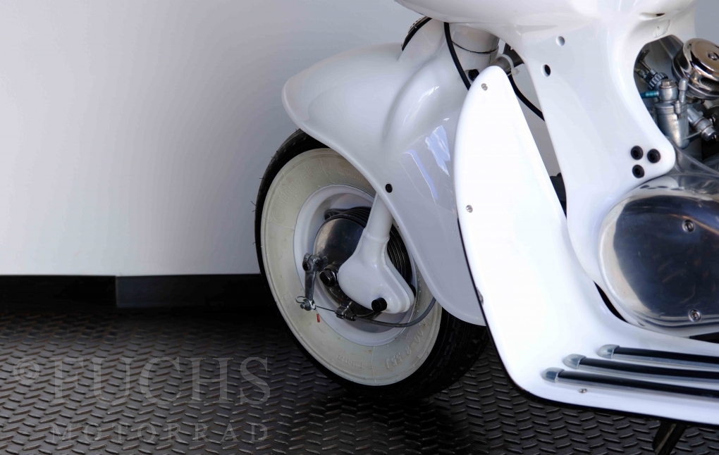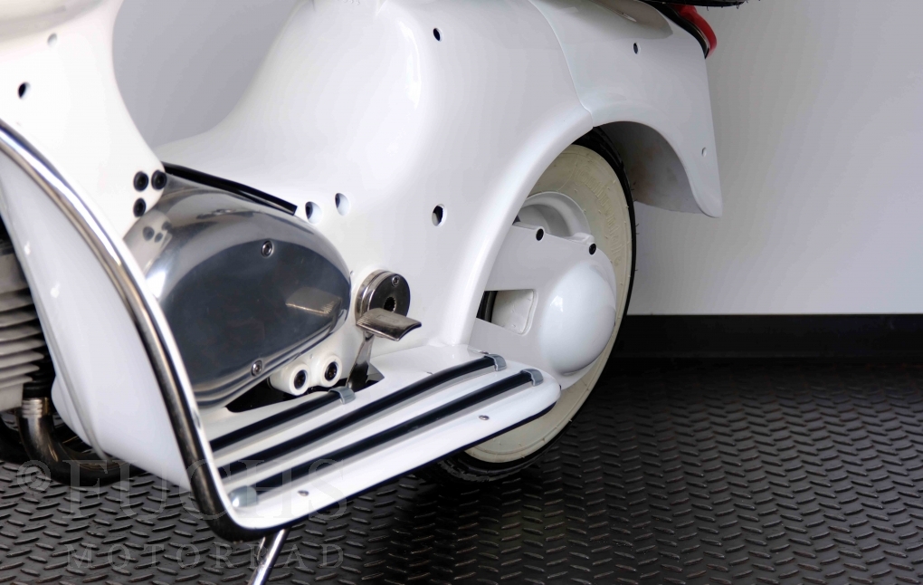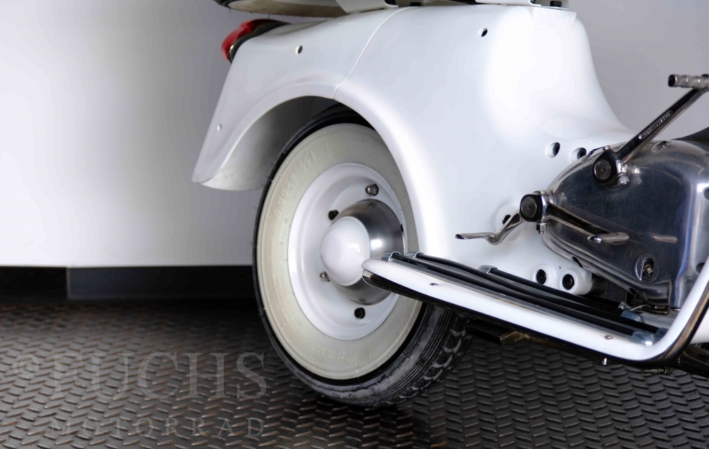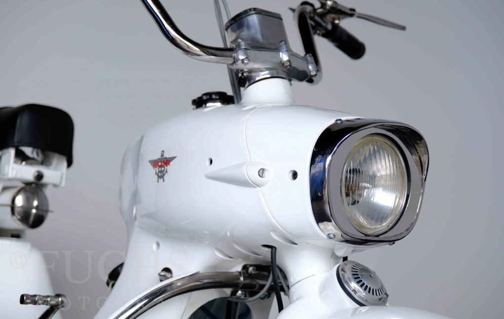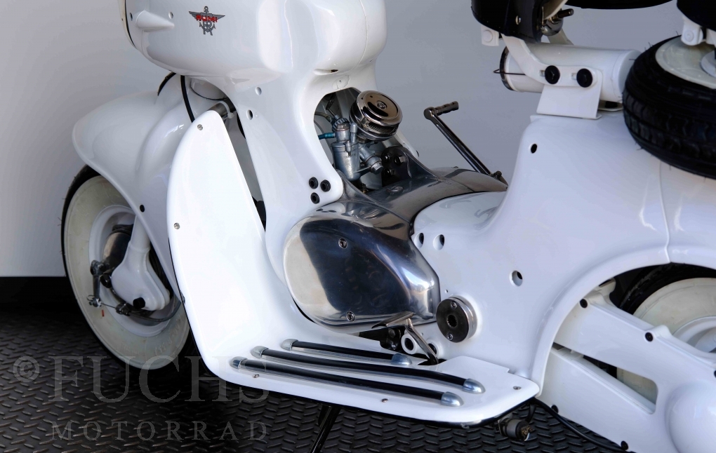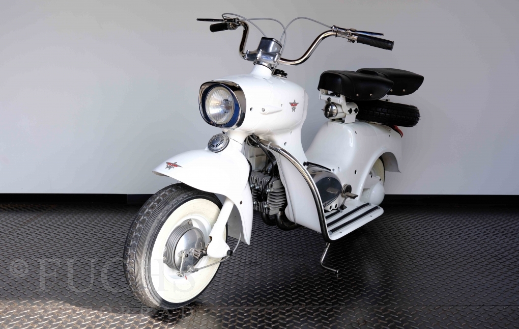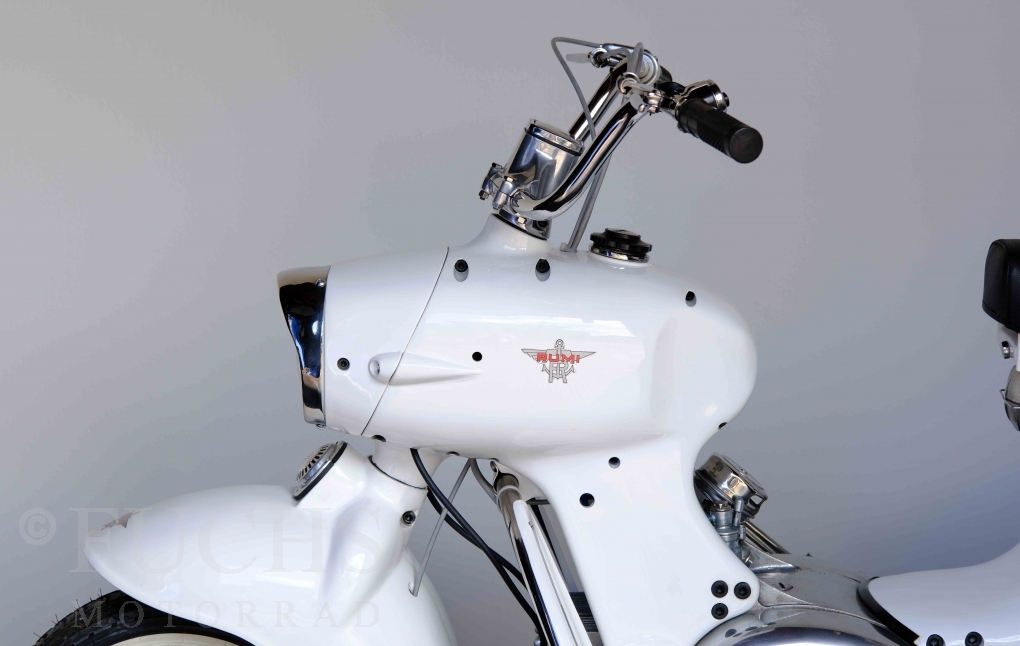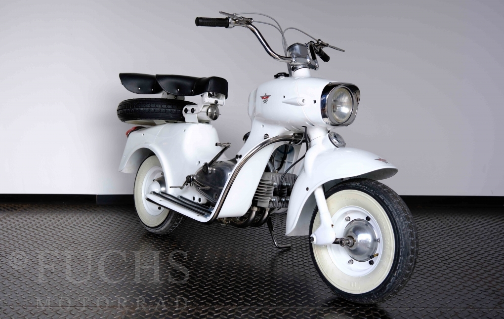 Der Formichino Roller wurde von Donnino Rumi entwickelt. Ziel der Entwicklung war die Marktdominanz Lambretta und Vespa zu stören. Die speziellen Metallformen wurde in einer Rumi Tochtergesellschaft in Bergamo produziert. Unser Formichino ist in einem schönen Zustand. CEV Scheinwerfer, CEV Rücklicht, zweiteilige 8 Zoll Felgen, Veglia 0-100 km/h Tachometer, Lenker mit verbundenen Armaturen machen die Rumi zu einem gut restaurierten Oldtimer. Selbstverständlich sind auch die Kleeblattschrauben verbaut.