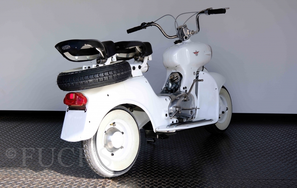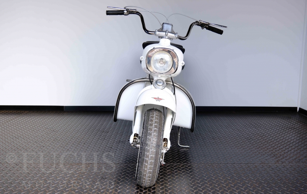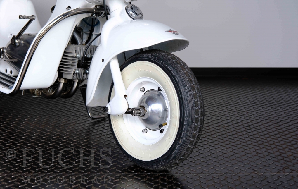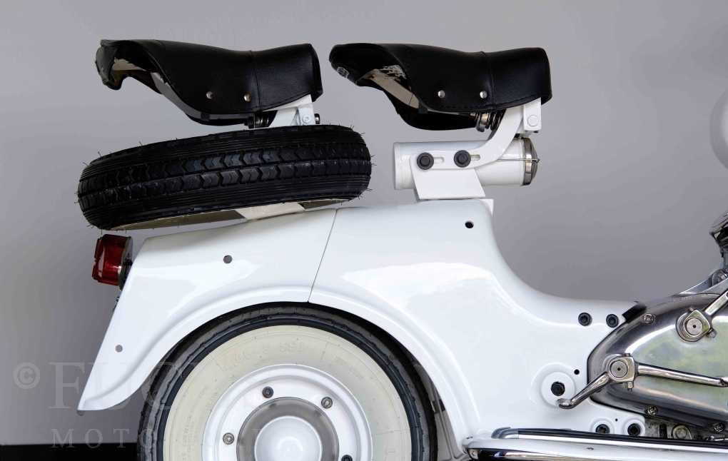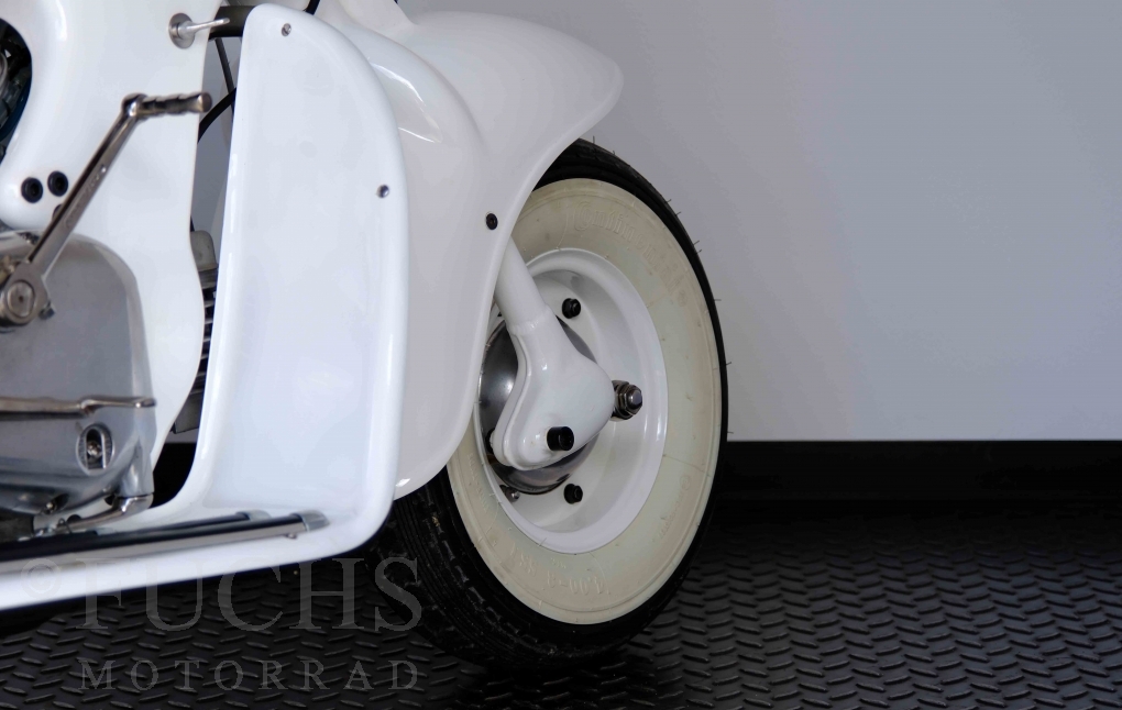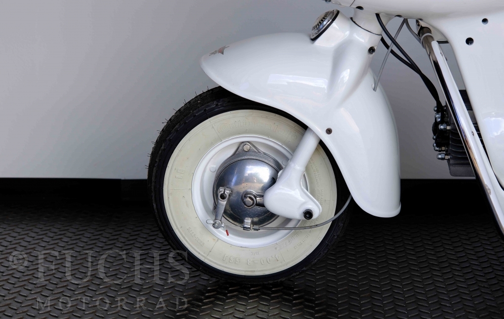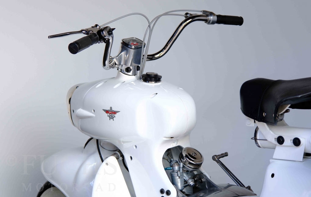 Der Formichino Roller wurde von Donnino Rumi entwickelt. Ziel der Entwicklung war die Marktdominanz Lambretta und Vespa zu stören. Die speziellen Metallformen wurde in einer Rumi Tochtergesellschaft in Bergamo produziert. Unser Formichino ist in einem schönen Zustand. CEV Scheinwerfer, CEV Rücklicht, zweiteilige 8 Zoll Felgen, Veglia 0-100 km/h Tachometer, Lenker mit verbundenen Armaturen machen die Rumi zu einem gut restaurierten Oldtimer. Selbstverständlich sind auch die Kleeblattschrauben verbaut.