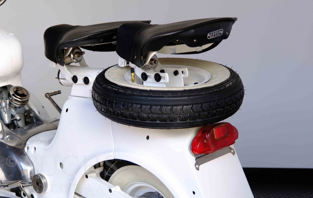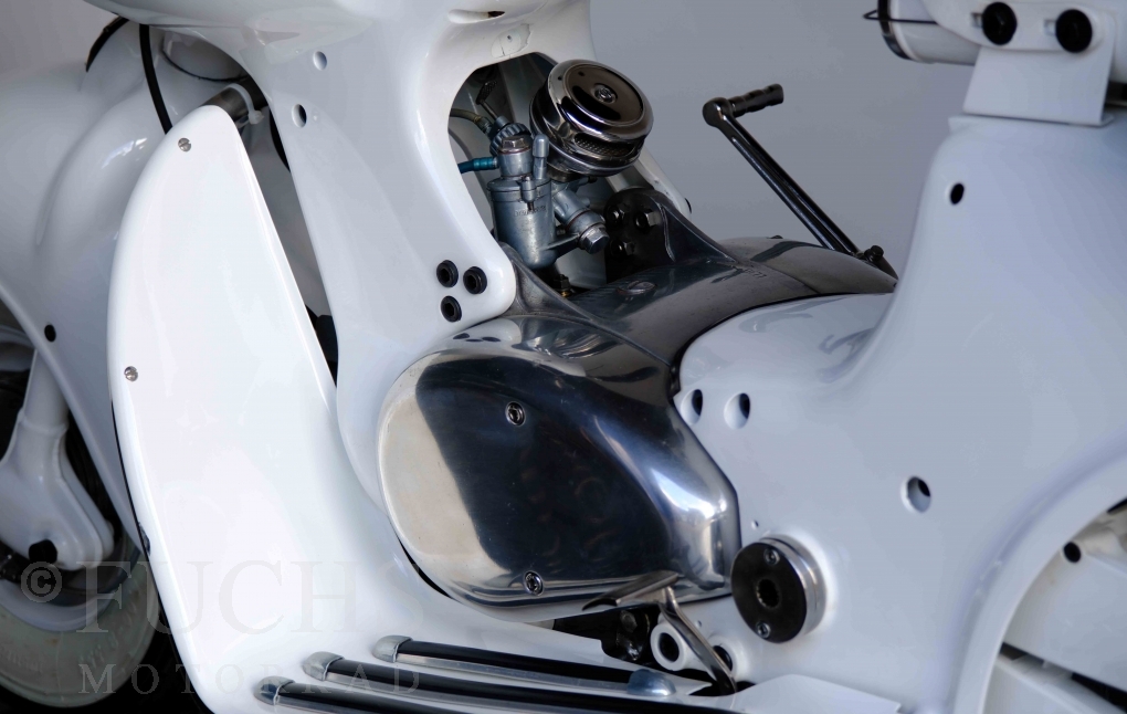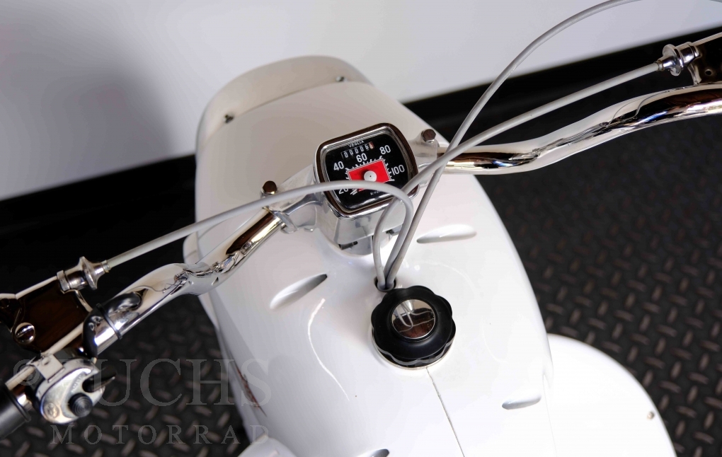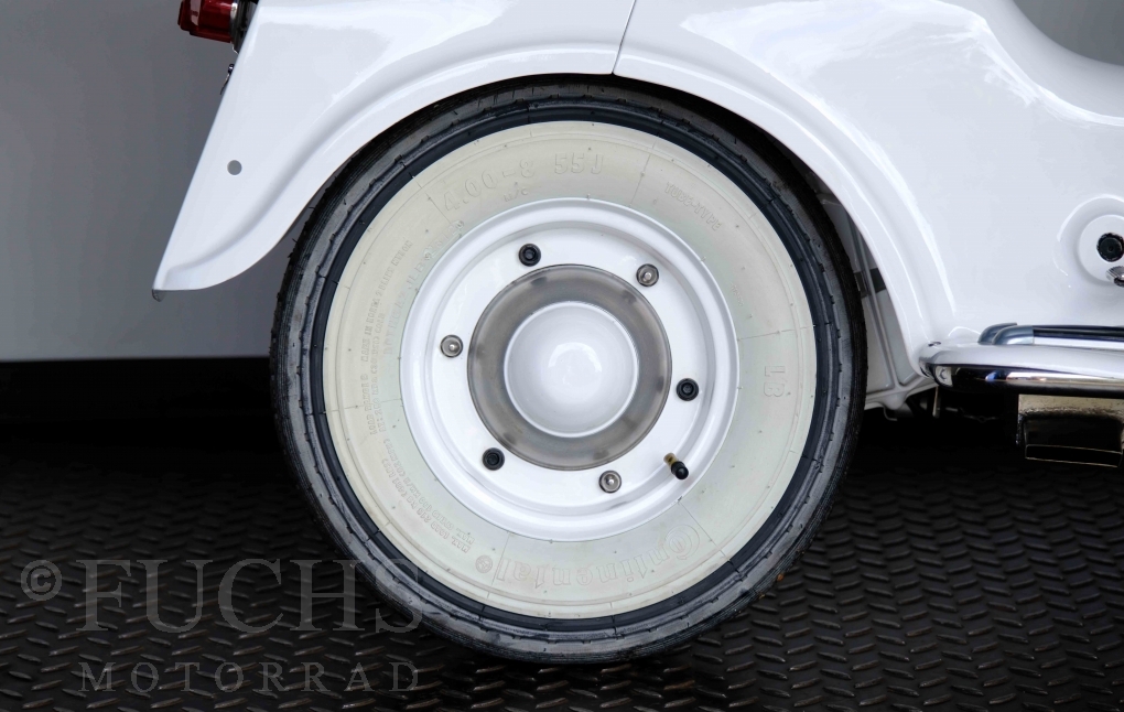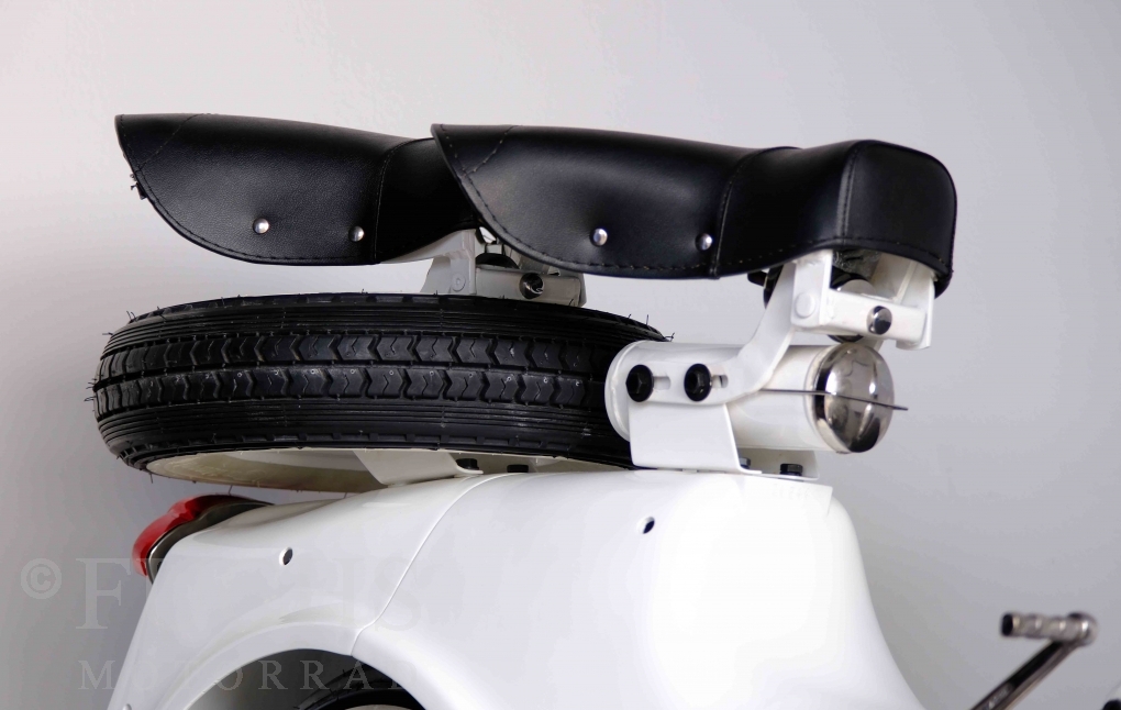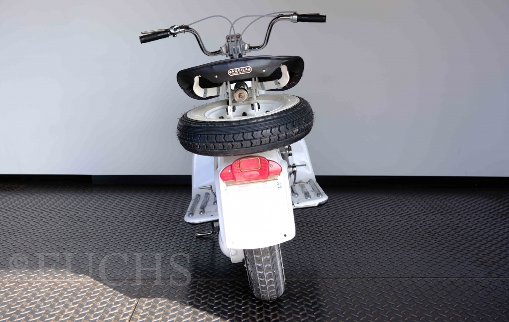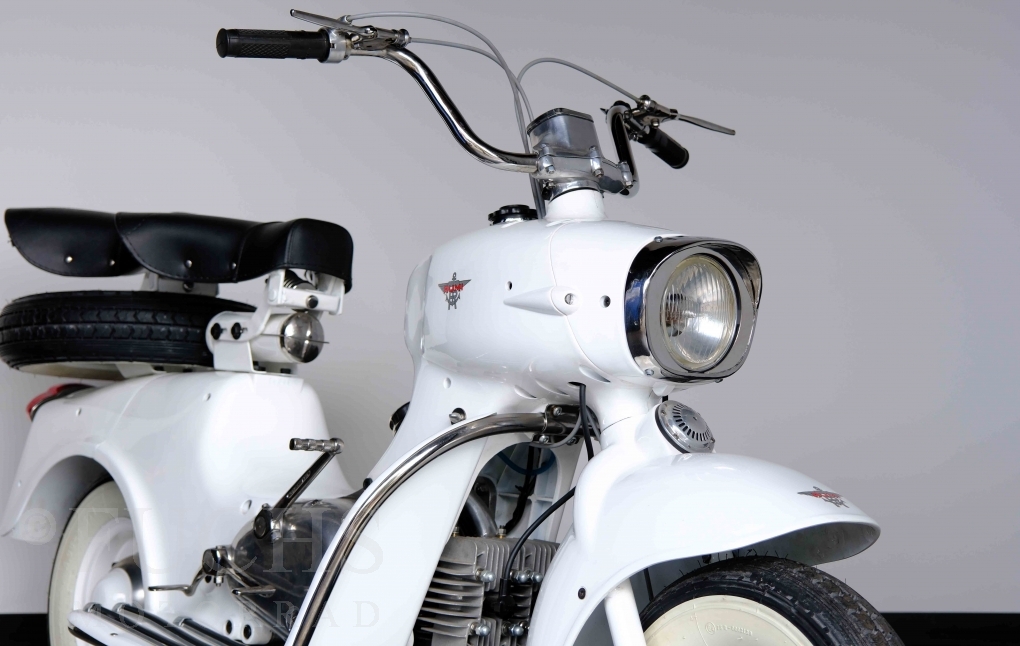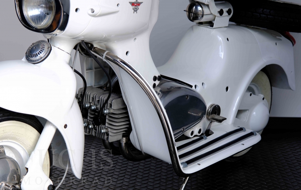 Der Formichino Roller wurde von Donnino Rumi entwickelt. Ziel der Entwicklung war die Marktdominanz Lambretta und Vespa zu stören. Die speziellen Metallformen wurde in einer Rumi Tochtergesellschaft in Bergamo produziert. Unser Formichino ist in einem schönen Zustand. CEV Scheinwerfer, CEV Rücklicht, zweiteilige 8 Zoll Felgen, Veglia 0-100 km/h Tachometer, Lenker mit verbundenen Armaturen machen die Rumi zu einem gut restaurierten Oldtimer. Selbstverständlich sind auch die Kleeblattschrauben verbaut.