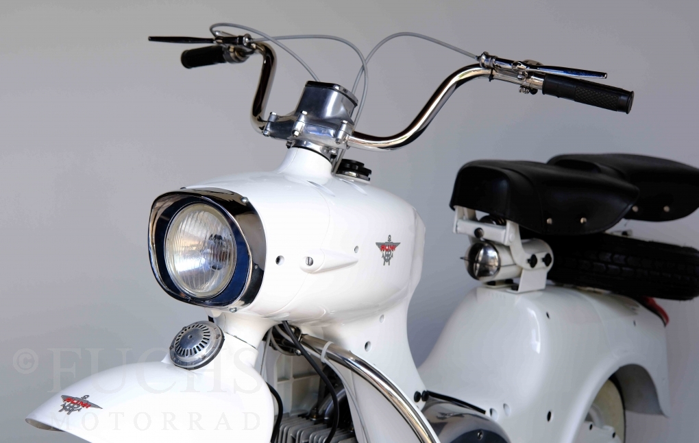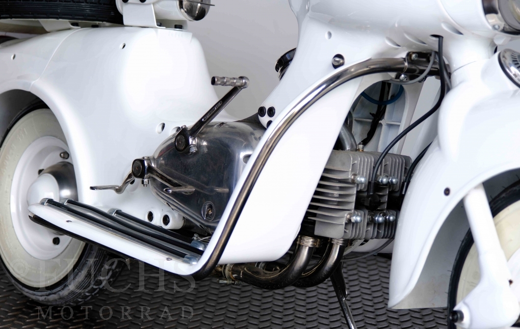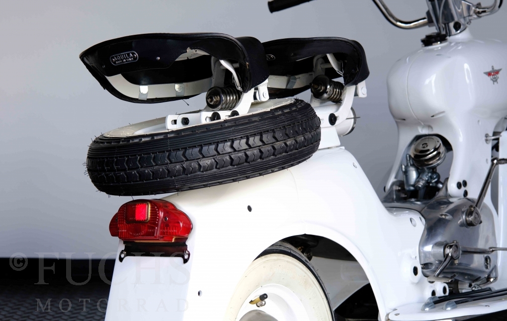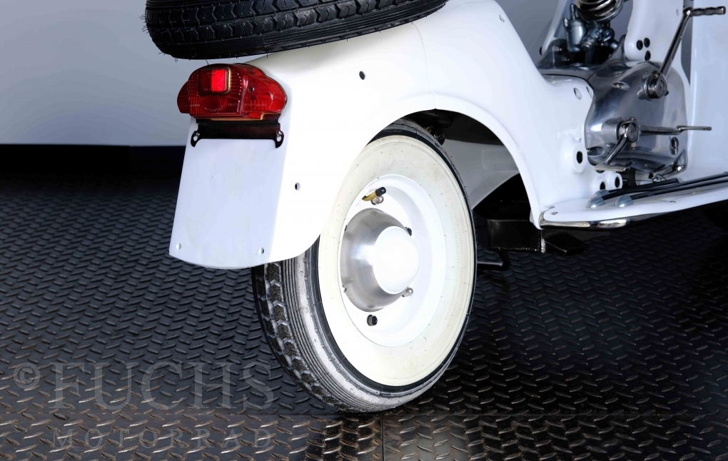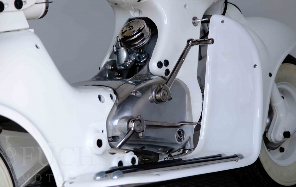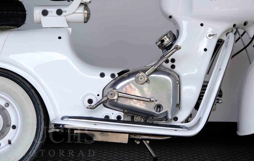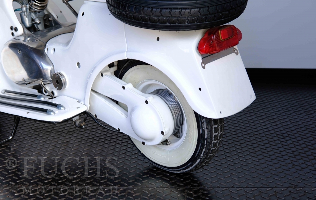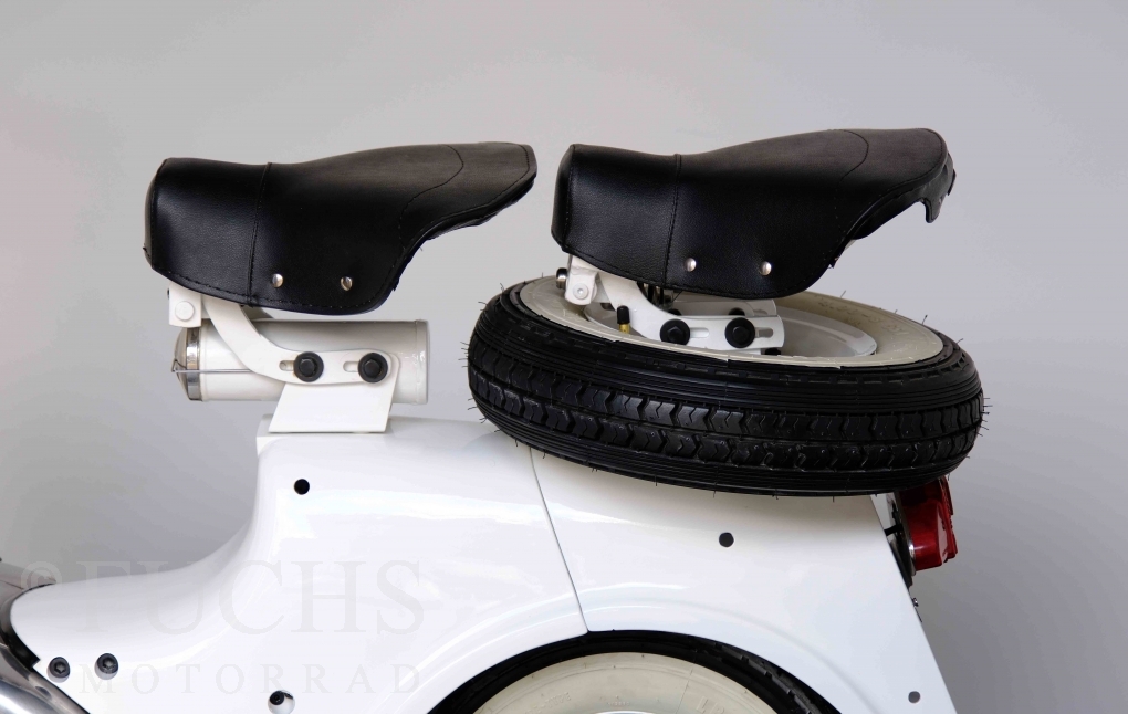 Der Formichino Roller wurde von Donnino Rumi entwickelt. Ziel der Entwicklung war die Marktdominanz Lambretta und Vespa zu stören. Die speziellen Metallformen wurde in einer Rumi Tochtergesellschaft in Bergamo produziert. Unser Formichino ist in einem schönen Zustand. CEV Scheinwerfer, CEV Rücklicht, zweiteilige 8 Zoll Felgen, Veglia 0-100 km/h Tachometer, Lenker mit verbundenen Armaturen machen die Rumi zu einem gut restaurierten Oldtimer. Selbstverständlich sind auch die Kleeblattschrauben verbaut.