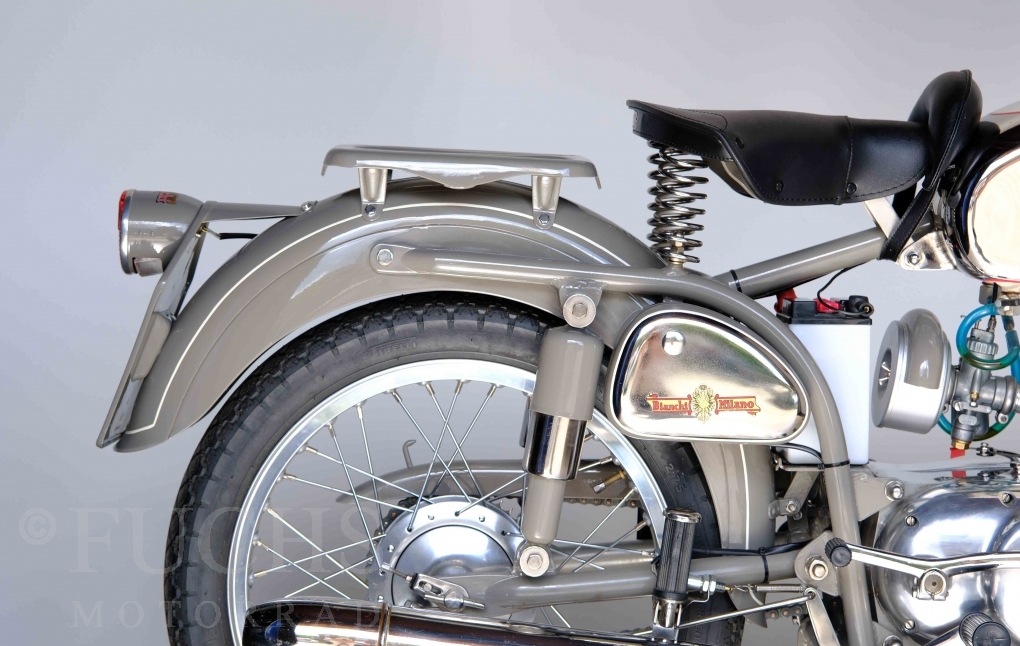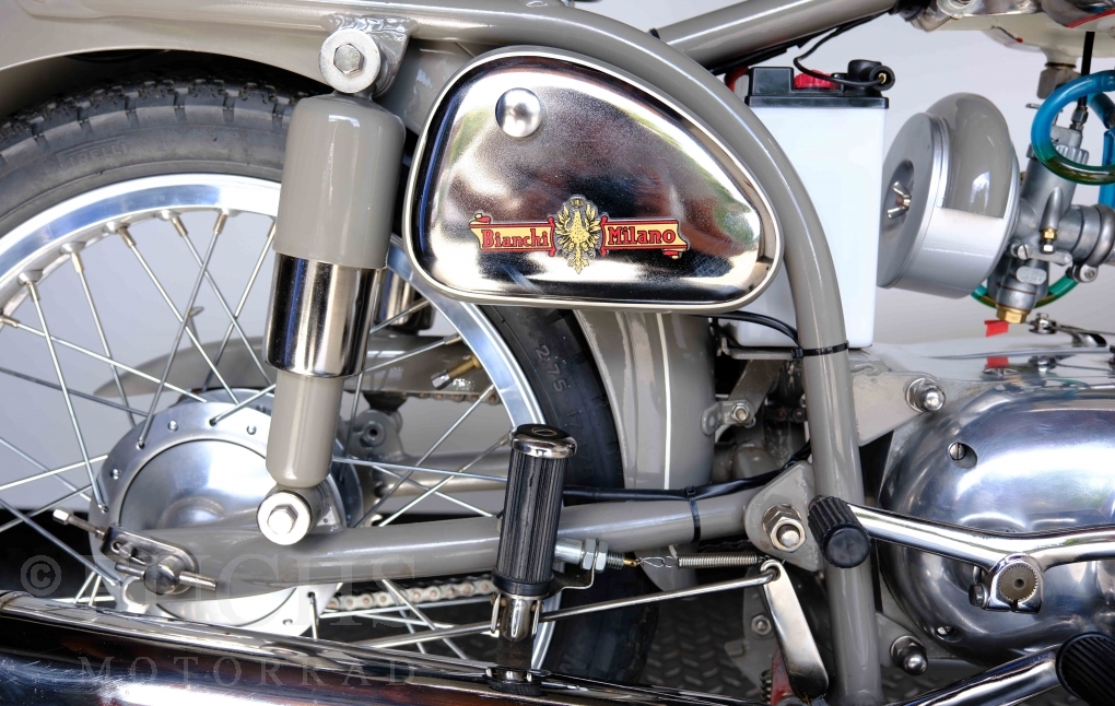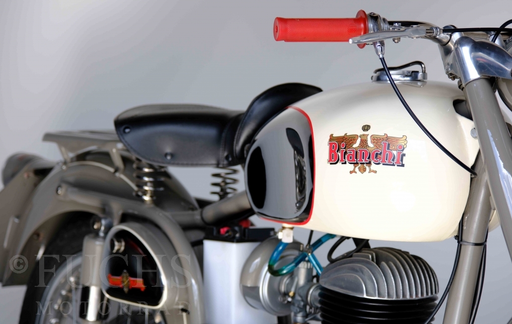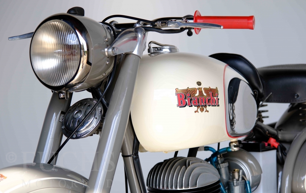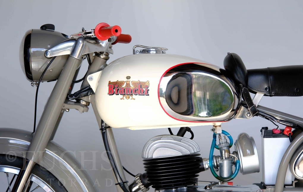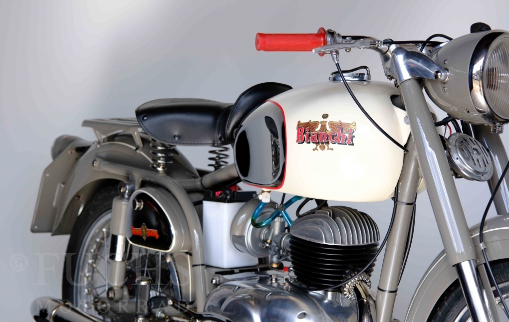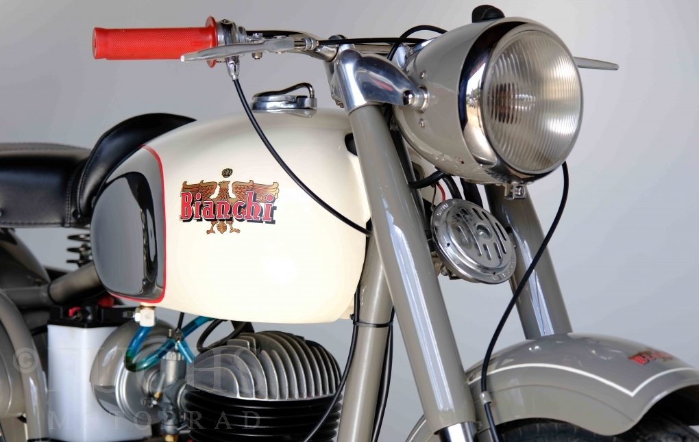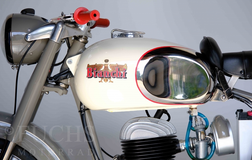 Edoardo Bianchi hat 1897 das erste Motorrad gebaut. Der in Mailand bestehende Betrieb hat sich in den folgenden Jahren zu einem innvoativen Unternehmen entwickelt, dass im Rennsport erfolgreich war und parallel die Fertigung von Straßenmaschinen ständig weiterentwickelt hat. Ende der 50er Jahre zeichnete sich ab, dass für die Bianchi Werke keine Zukunft mehr besteht. Unsere Bianchi Mendola stammt aus den frühen 50er Jahren als die Welt für das Unternehmen noch in Ordnung war.