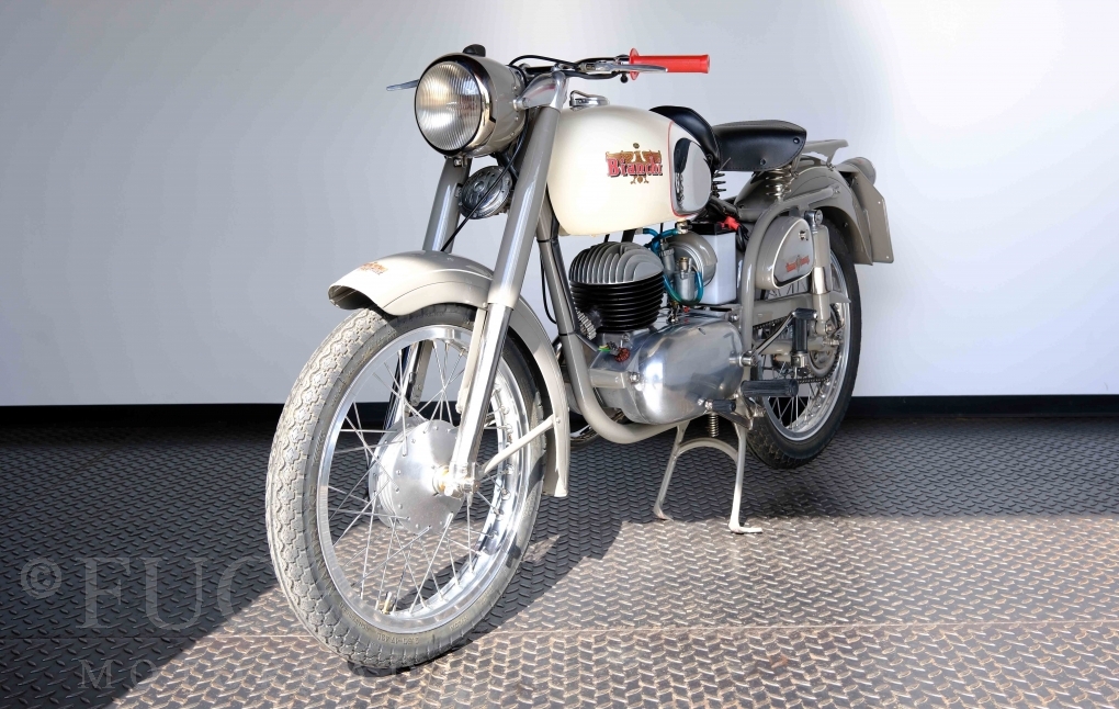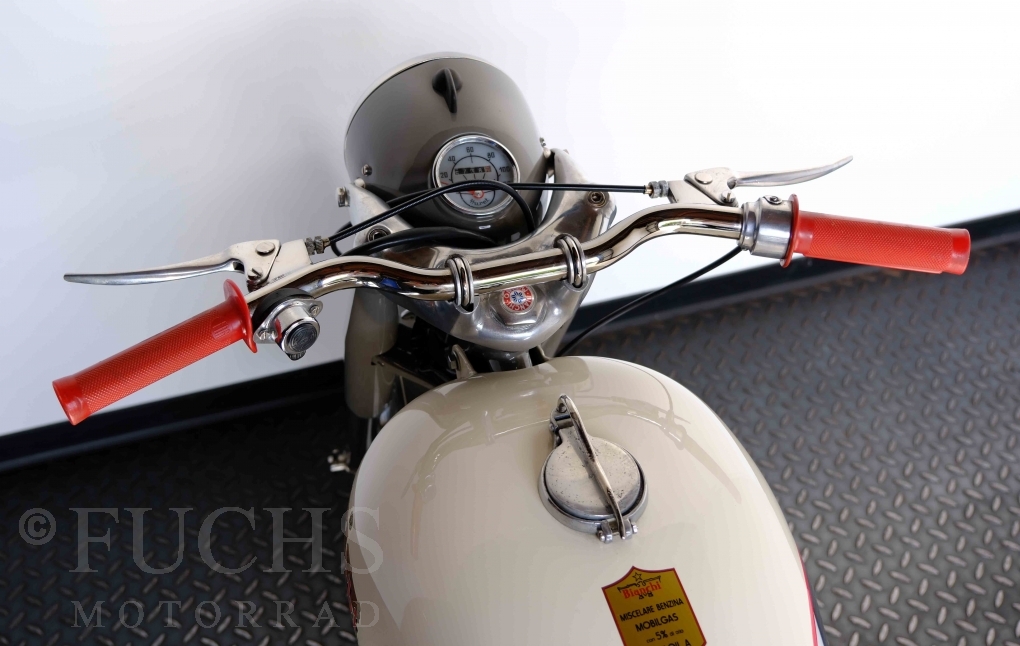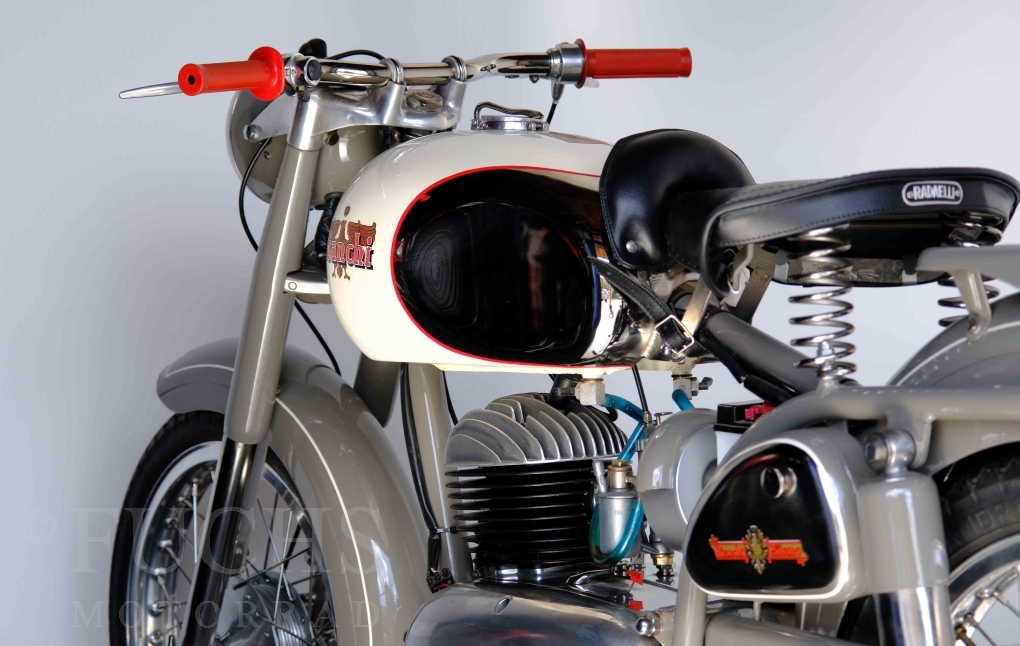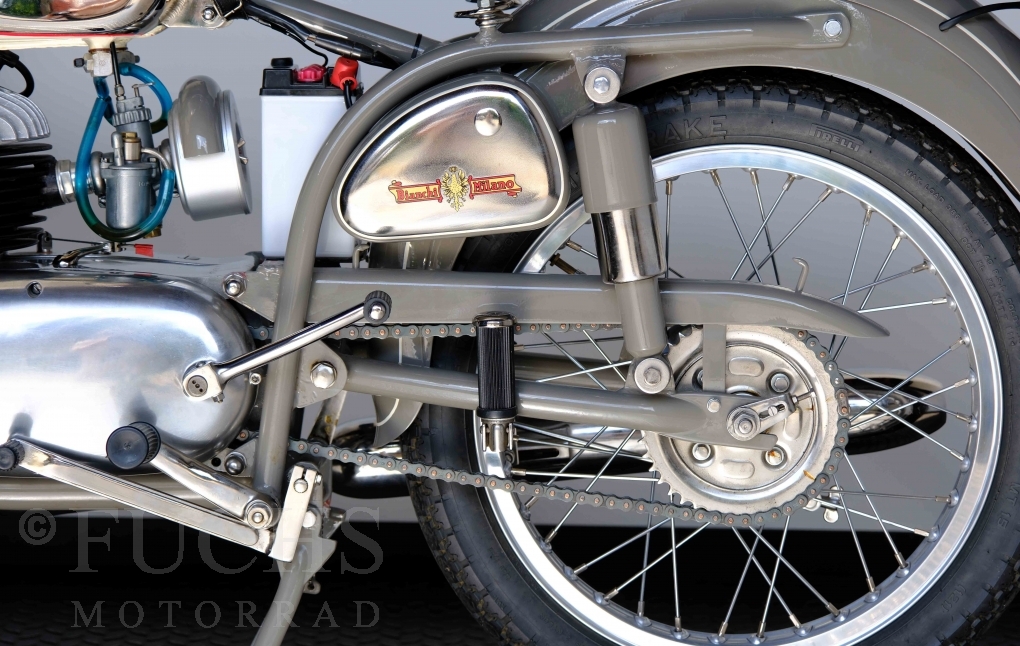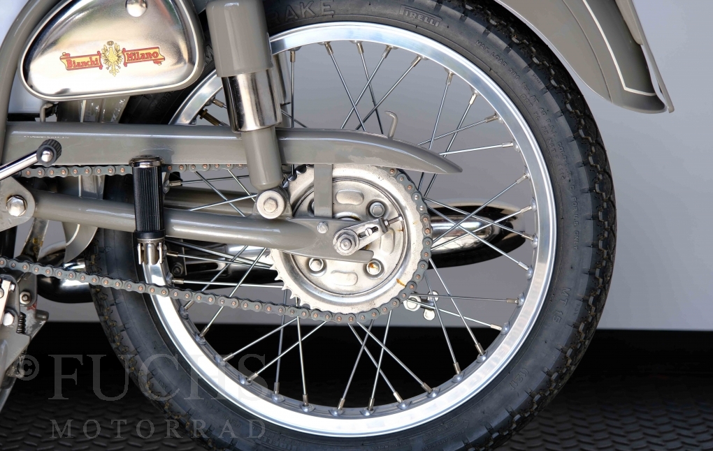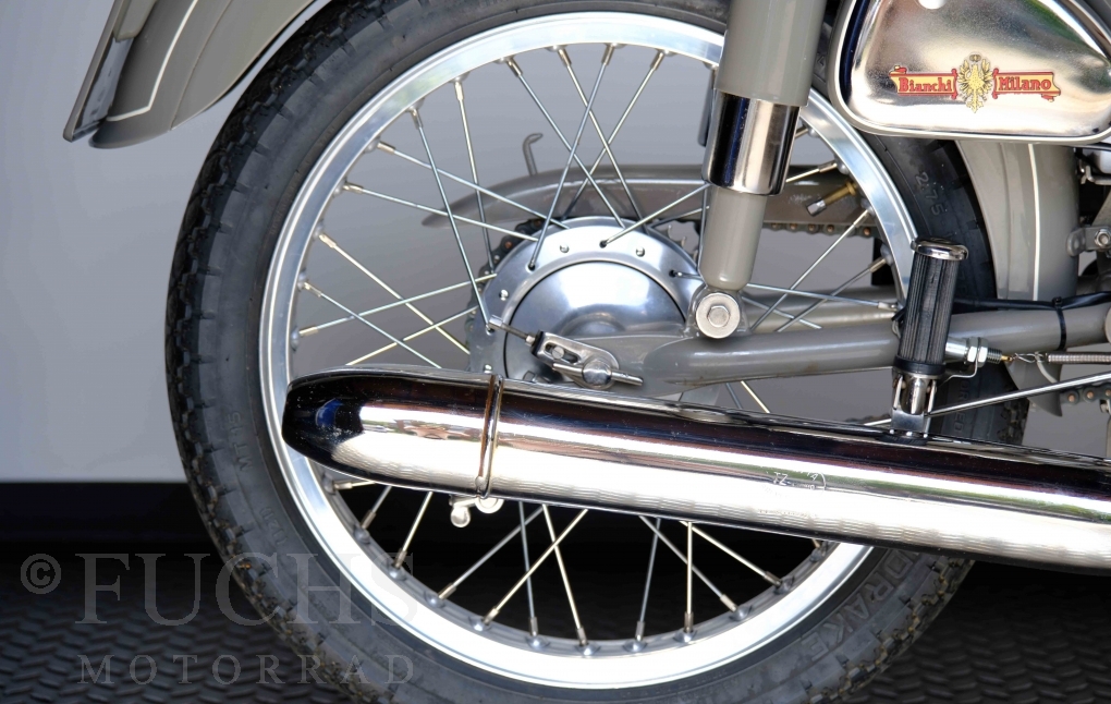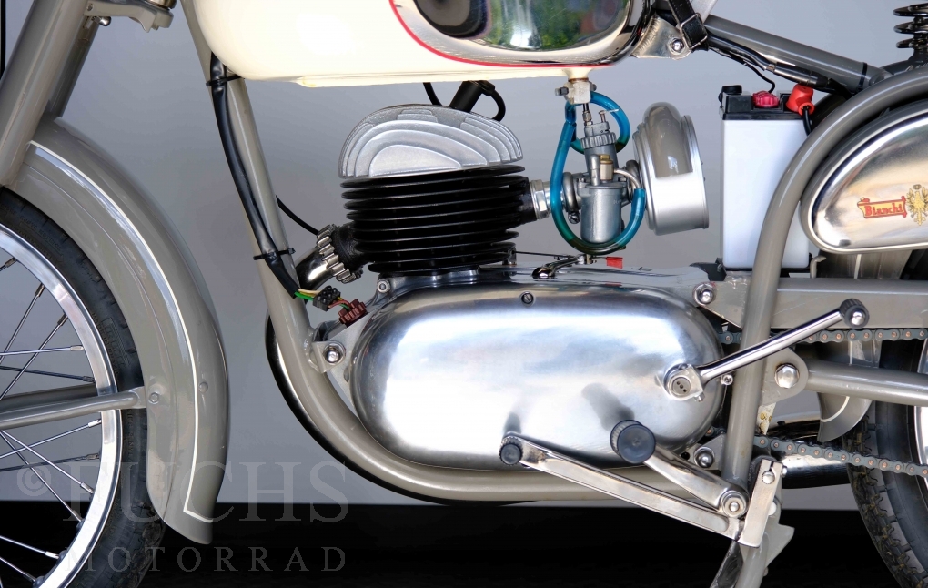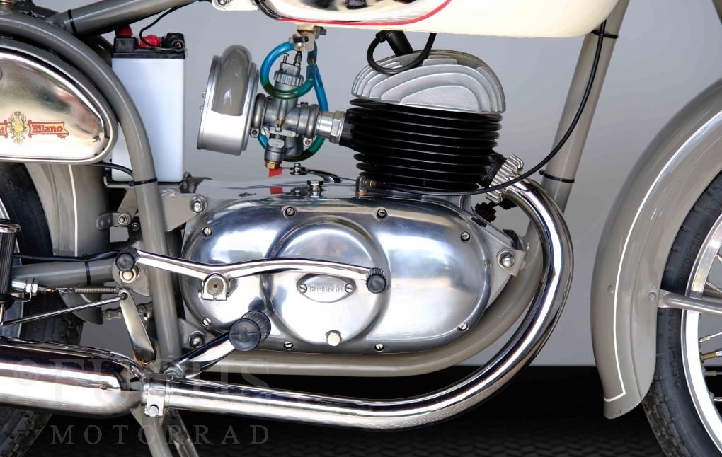 Edoardo Bianchi hat 1897 das erste Motorrad gebaut. Der in Mailand bestehende Betrieb hat sich in den folgenden Jahren zu einem innvoativen Unternehmen entwickelt, dass im Rennsport erfolgreich war und parallel die Fertigung von Straßenmaschinen ständig weiterentwickelt hat. Ende der 50er Jahre zeichnete sich ab, dass für die Bianchi Werke keine Zukunft mehr besteht. Unsere Bianchi Mendola stammt aus den frühen 50er Jahren als die Welt für das Unternehmen noch in Ordnung war.