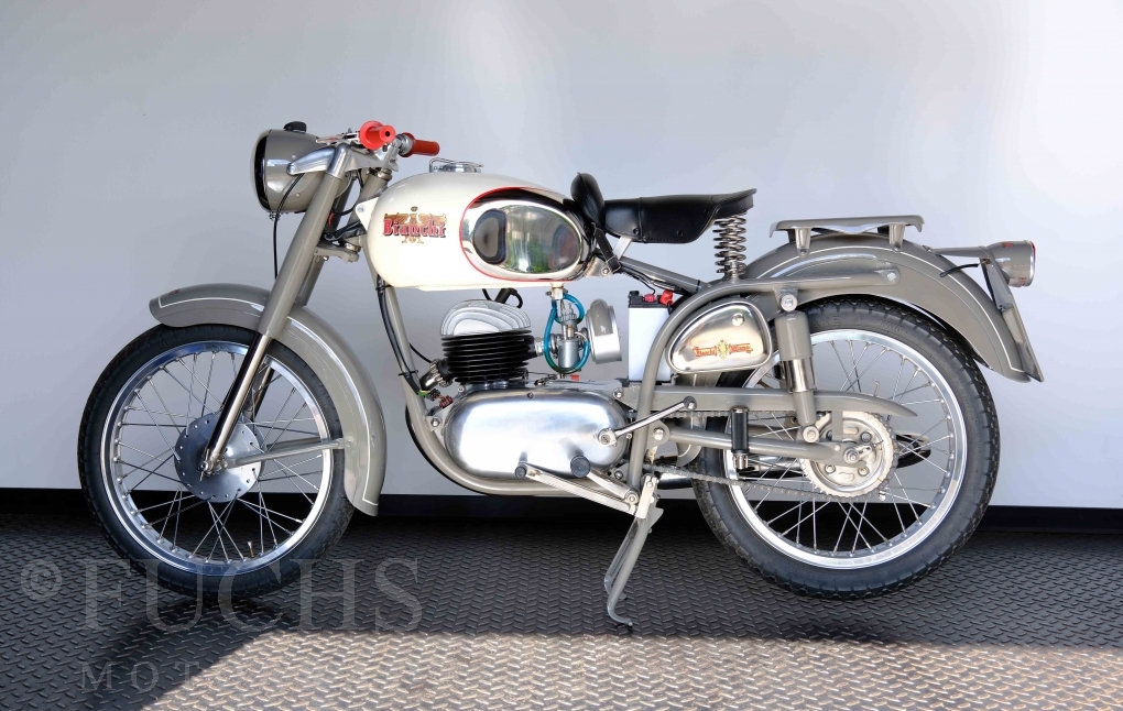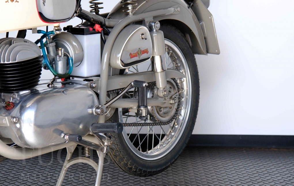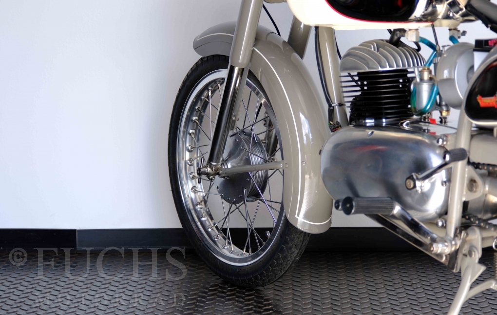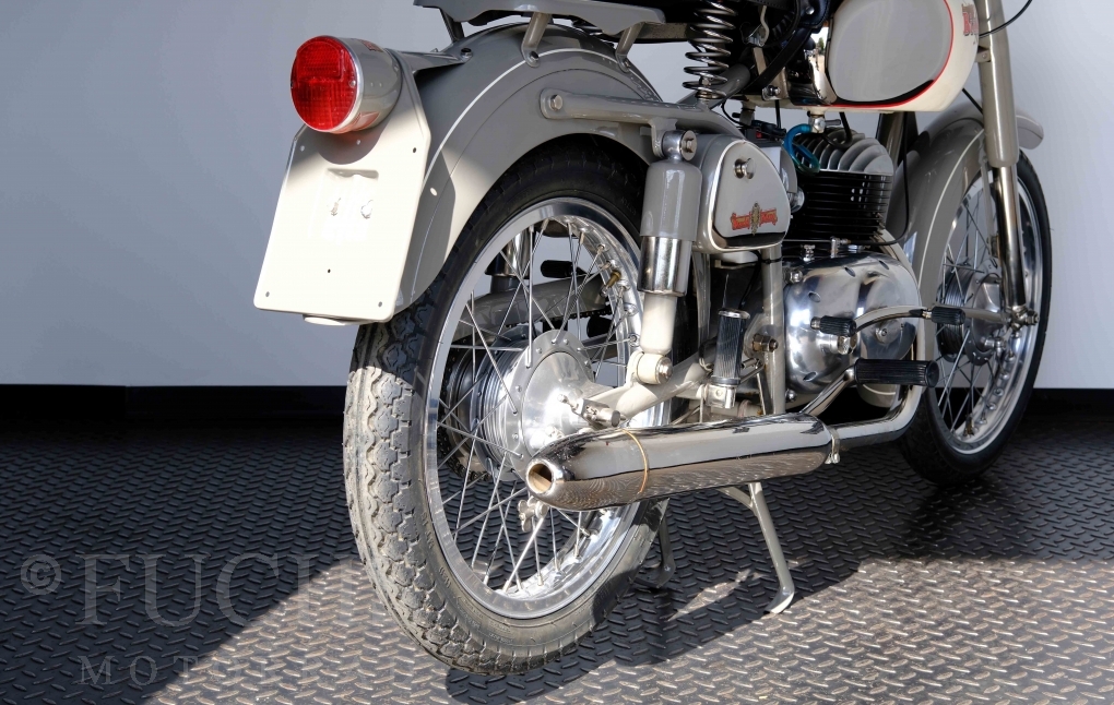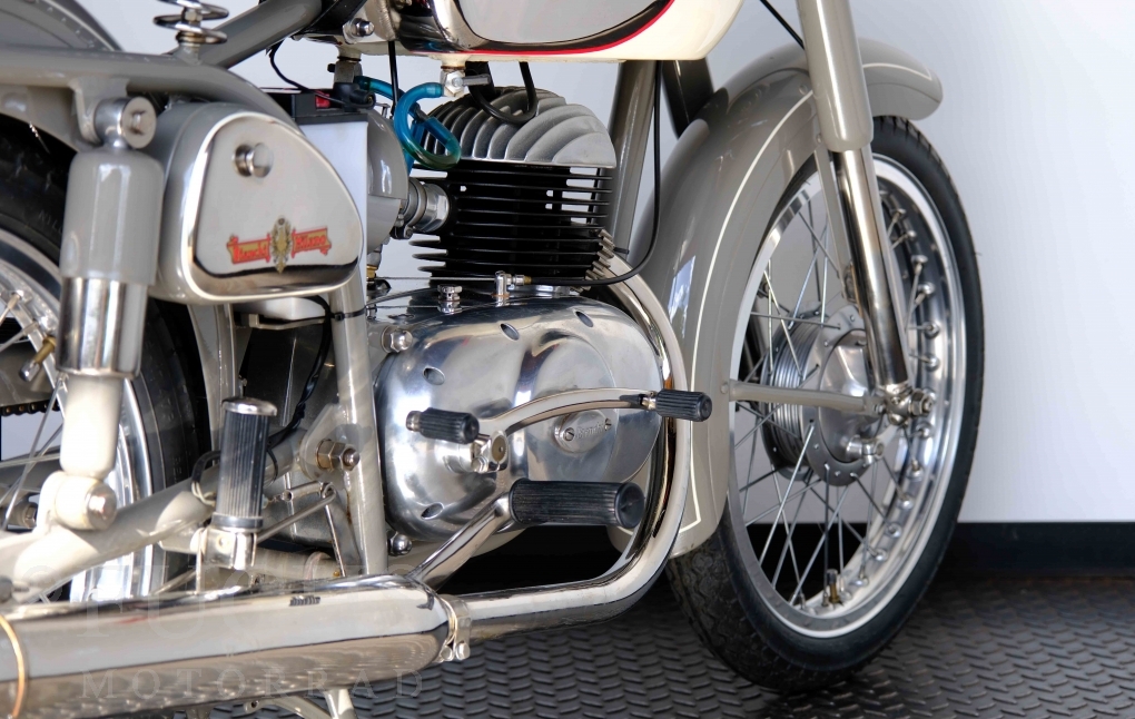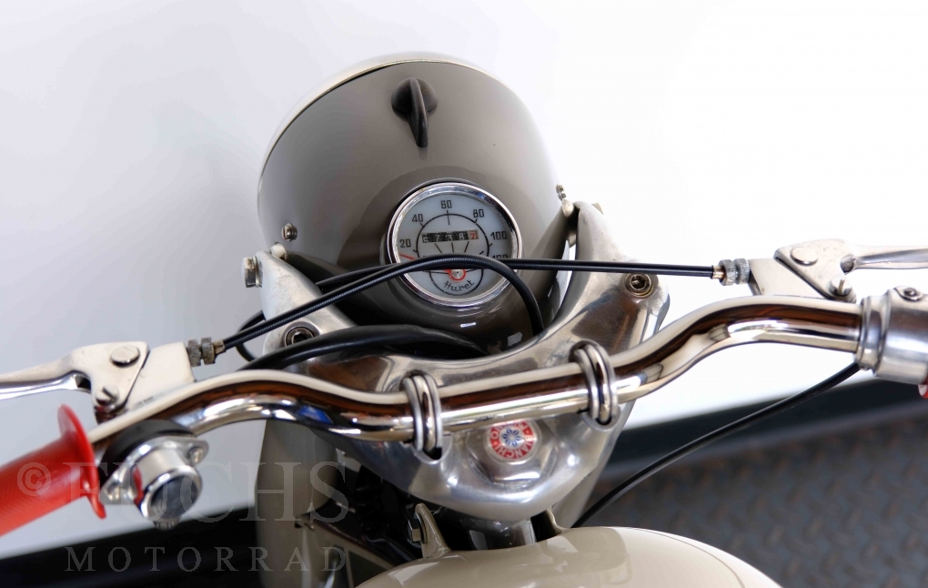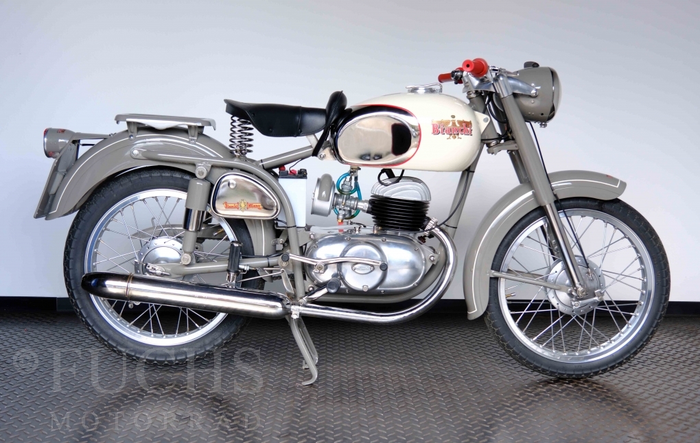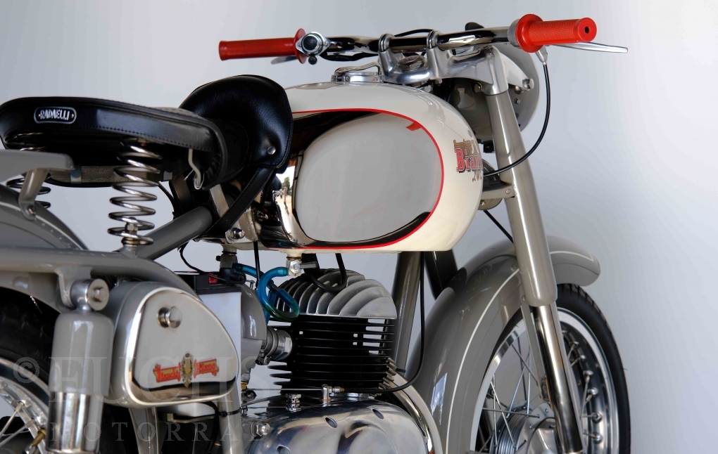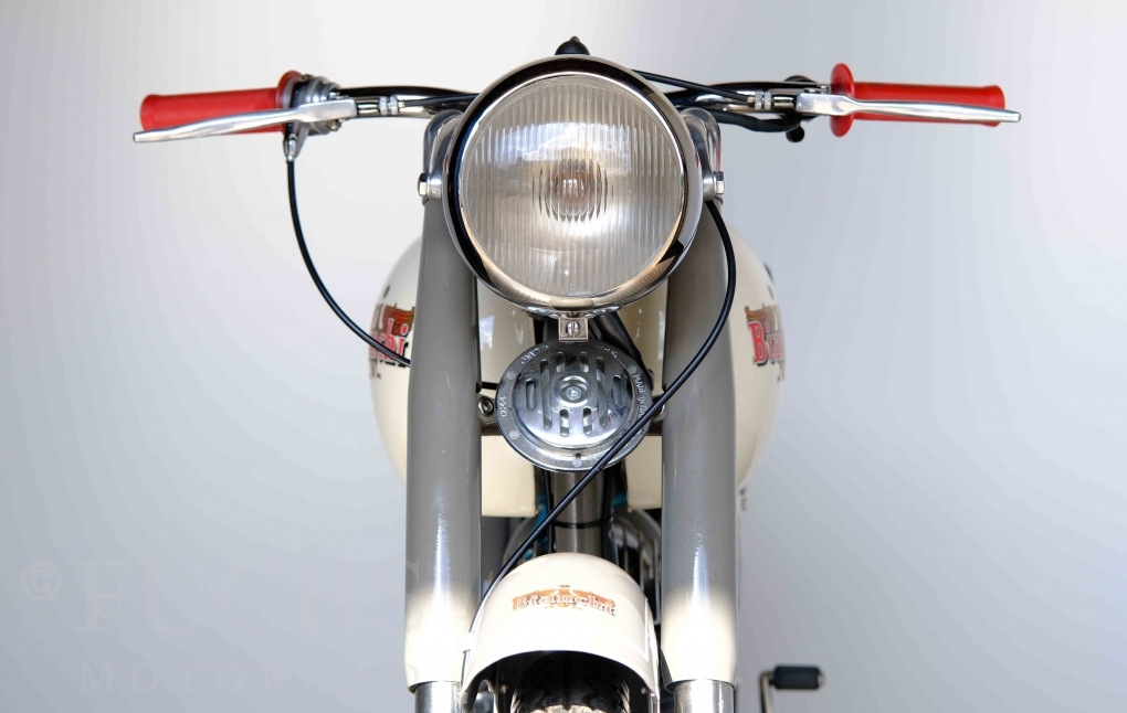 Edoardo Bianchi hat 1897 das erste Motorrad gebaut. Der in Mailand bestehende Betrieb hat sich in den folgenden Jahren zu einem innvoativen Unternehmen entwickelt, dass im Rennsport erfolgreich war und parallel die Fertigung von Straßenmaschinen ständig weiterentwickelt hat. Ende der 50er Jahre zeichnete sich ab, dass für die Bianchi Werke keine Zukunft mehr besteht. Unsere Bianchi Mendola stammt aus den frühen 50er Jahren als die Welt für das Unternehmen noch in Ordnung war.