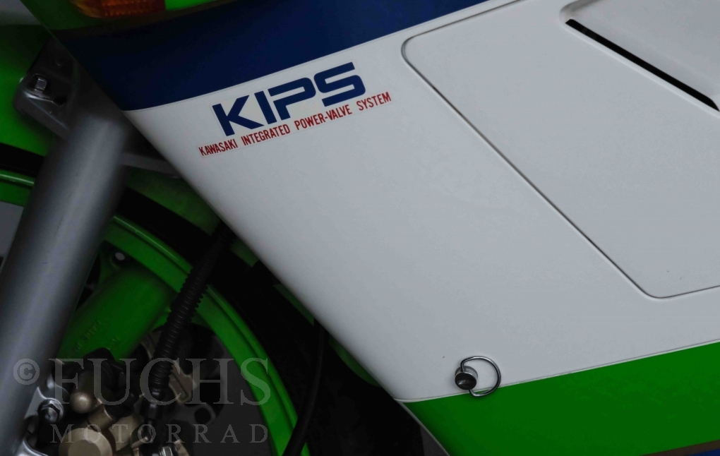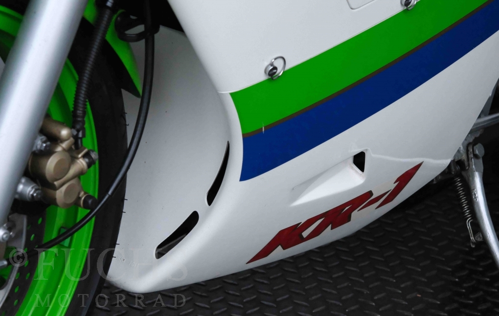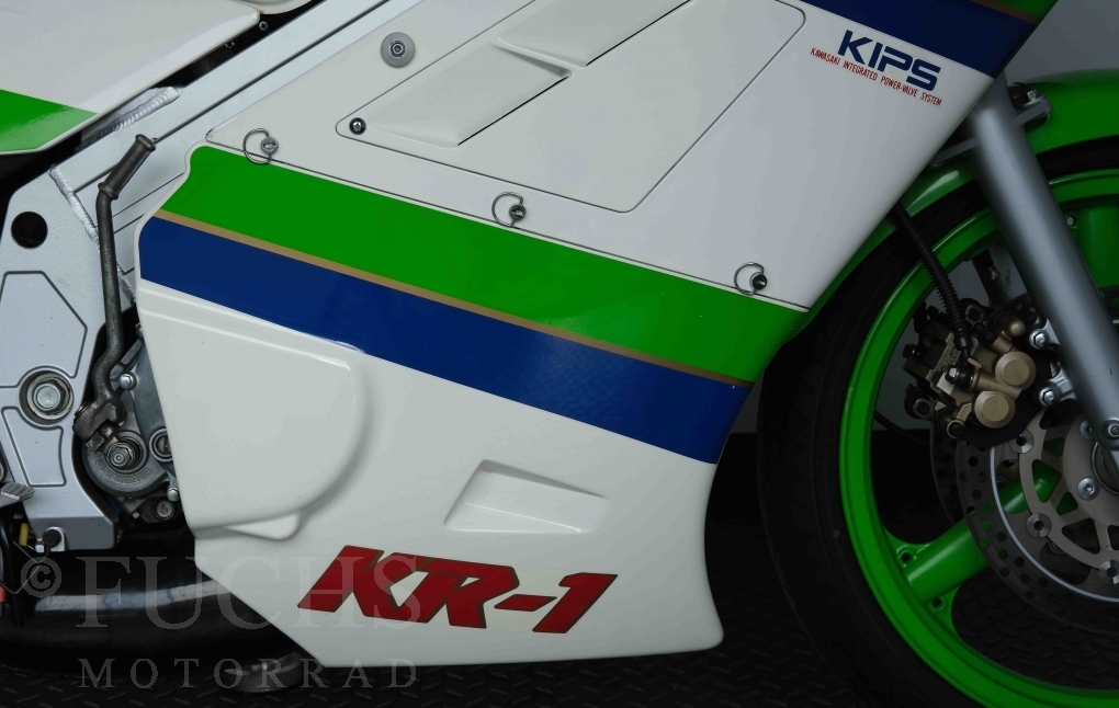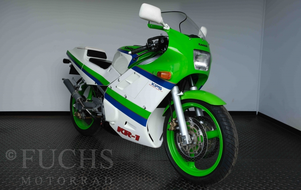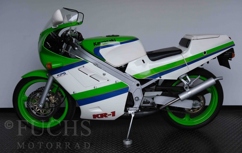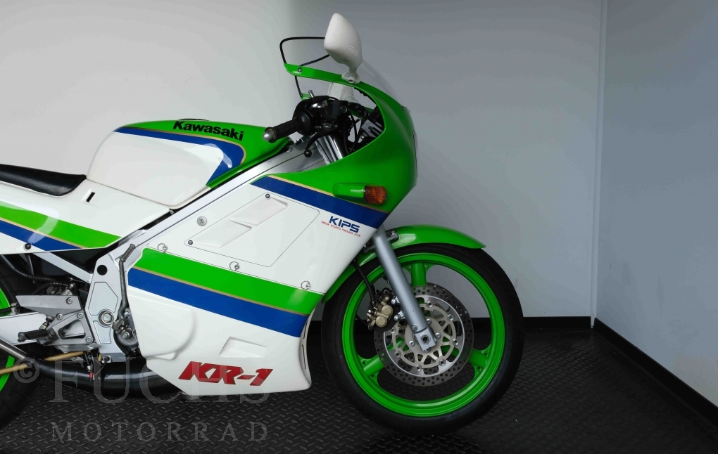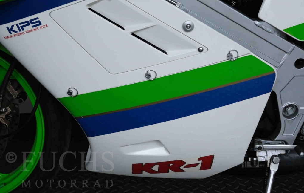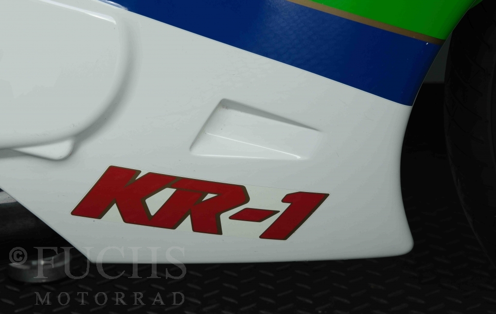 Bei unserer KR-1 handelt sich um eine B2 aus dem Modelljahr 1989. Im deutschen Markt wurde die KR-1 nicht über das Händlernetz angeboten und so blieb der Zweitakter bis heute in Deutschland eine Seltenheit. Die B2 hat bereits den Motor mit K.I.P.S (Kawasaki Integrated Powervalve System). Die Steuerung verhilft dem Motor zu einem optimalen Drehmomentverlauf. In Verbindung mit dem E-Box frame und einem Gewicht von 140 Kg ist der Fahrspaß garantiert. Unsere KR-1 ist in einem sehr guten Zustand und mit Schalldämpfern der KR-1S ausgerüstet.