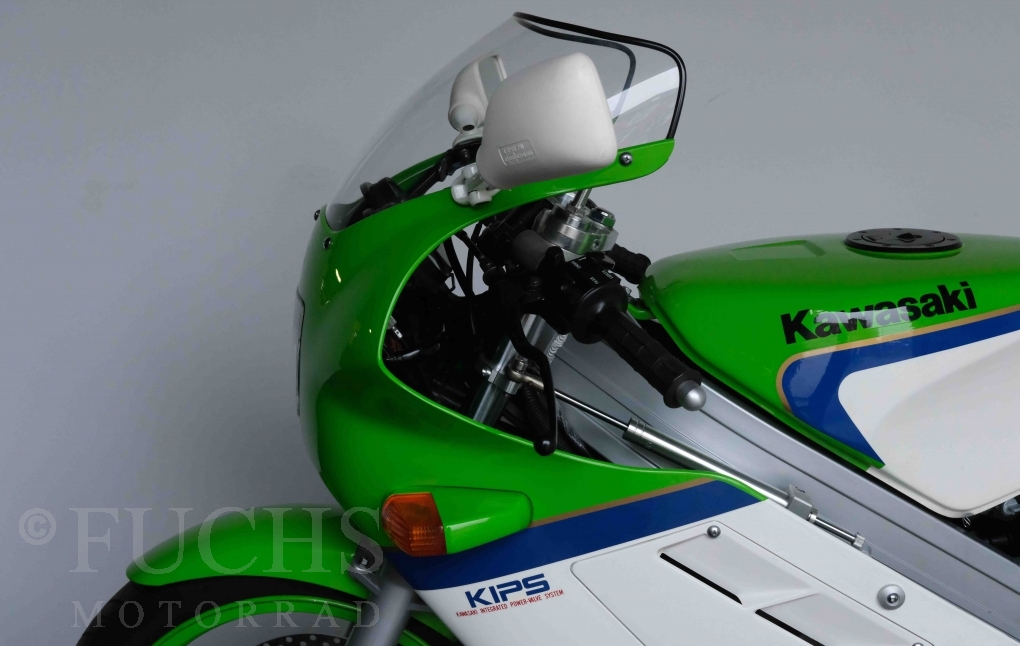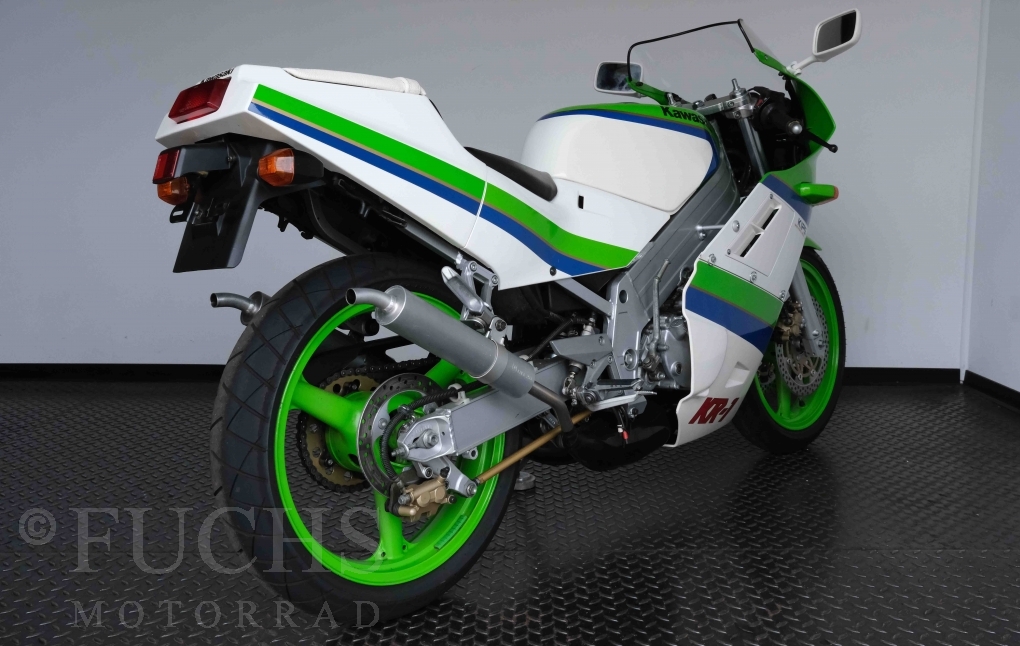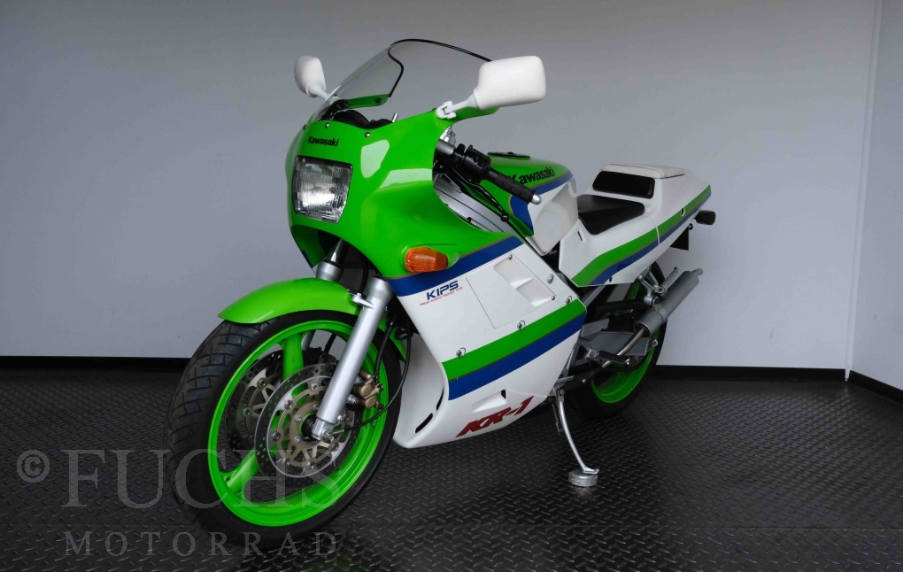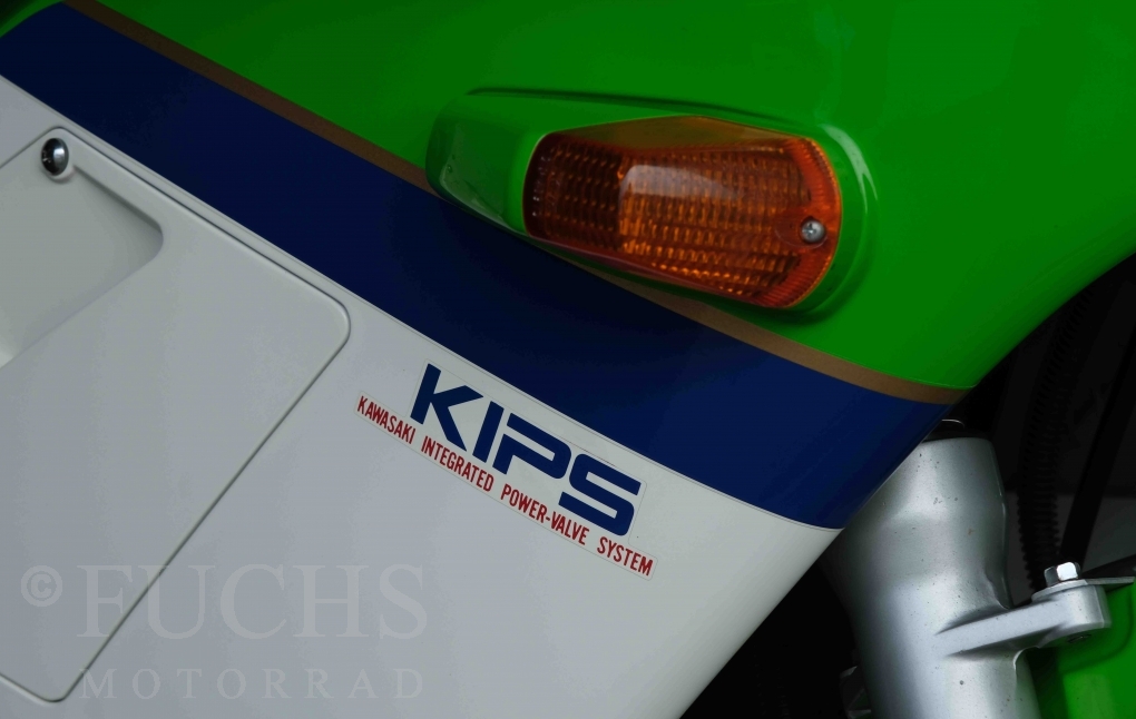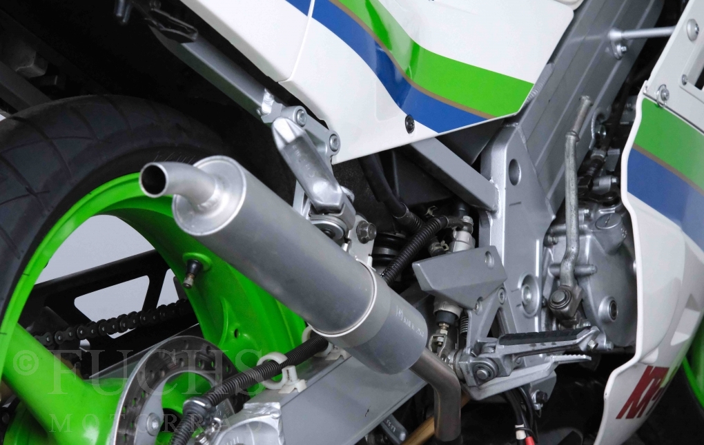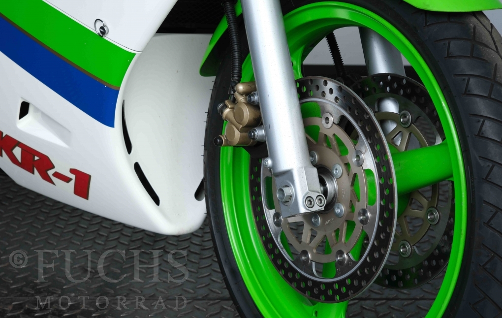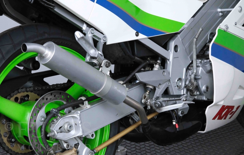 Bei unserer KR-1 handelt sich um eine B2 aus dem Modelljahr 1989. Im deutschen Markt wurde die KR-1 nicht über das Händlernetz angeboten und so blieb der Zweitakter bis heute in Deutschland eine Seltenheit. Die B2 hat bereits den Motor mit K.I.P.S (Kawasaki Integrated Powervalve System). Die Steuerung verhilft dem Motor zu einem optimalen Drehmomentverlauf. In Verbindung mit dem E-Box frame und einem Gewicht von 140 Kg ist der Fahrspaß garantiert. Unsere KR-1 ist in einem sehr guten Zustand und mit Schalldämpfern der KR-1S ausgerüstet.