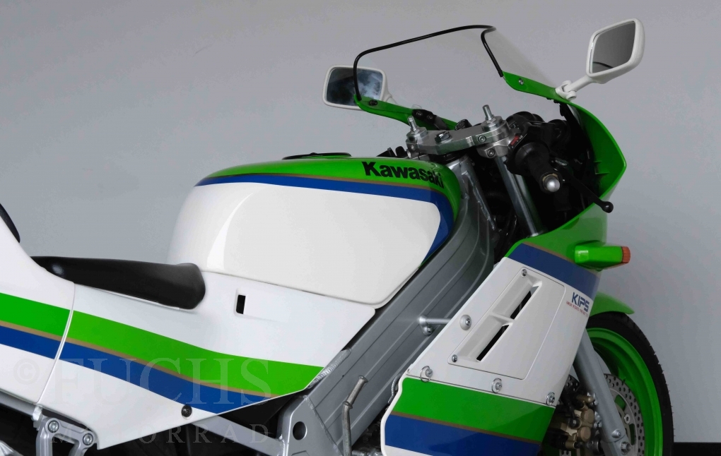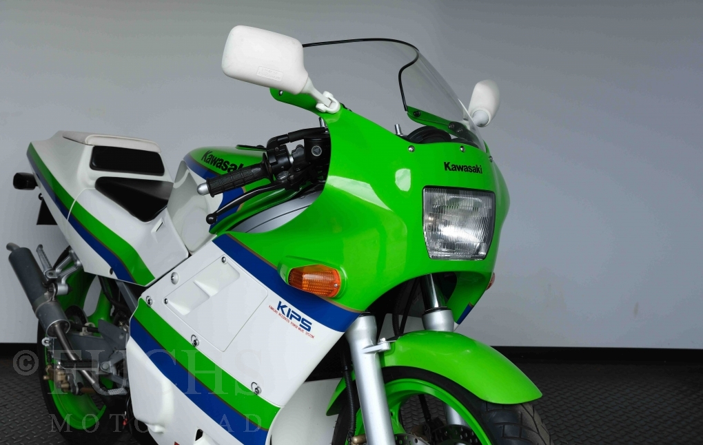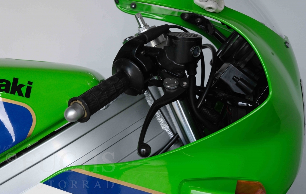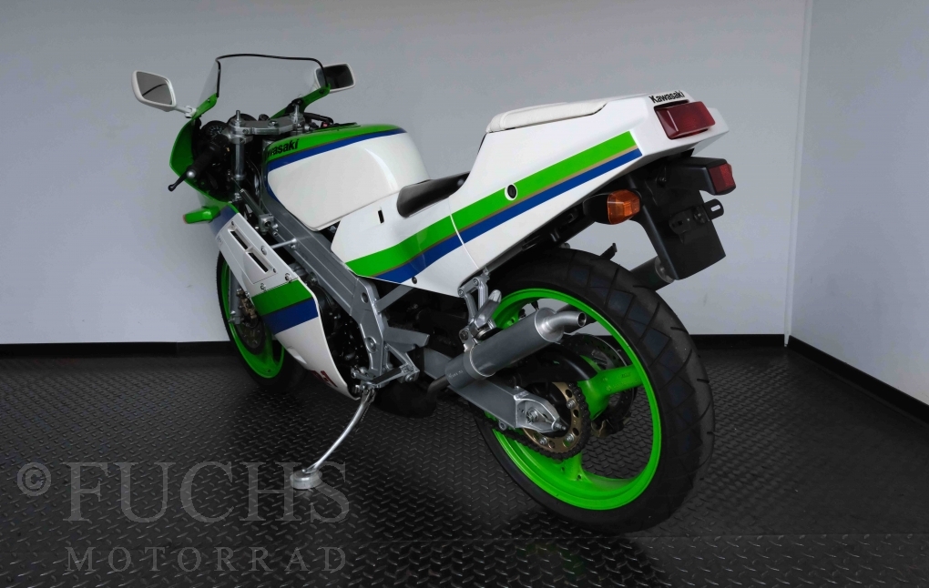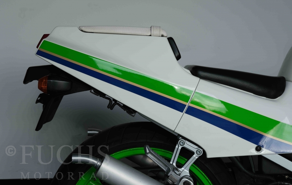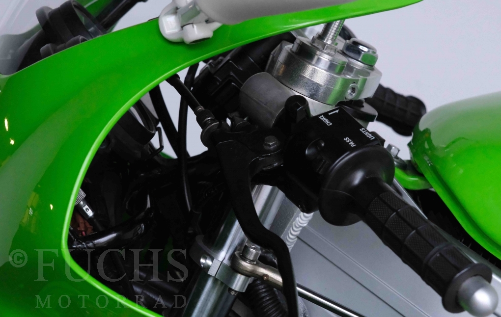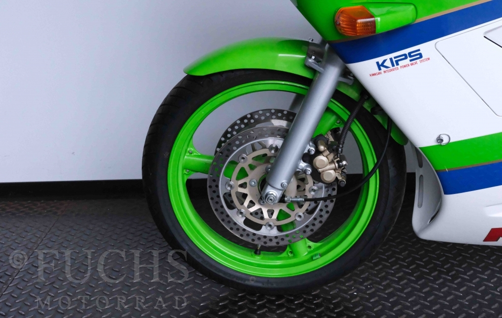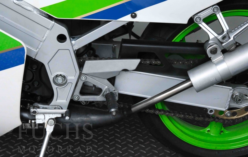 Bei unserer KR-1 handelt sich um eine B2 aus dem Modelljahr 1989. Im deutschen Markt wurde die KR-1 nicht über das Händlernetz angeboten und so blieb der Zweitakter bis heute in Deutschland eine Seltenheit. Die B2 hat bereits den Motor mit K.I.P.S (Kawasaki Integrated Powervalve System). Die Steuerung verhilft dem Motor zu einem optimalen Drehmomentverlauf. In Verbindung mit dem E-Box frame und einem Gewicht von 140 Kg ist der Fahrspaß garantiert. Unsere KR-1 ist in einem sehr guten Zustand und mit Schalldämpfern der KR-1S ausgerüstet.