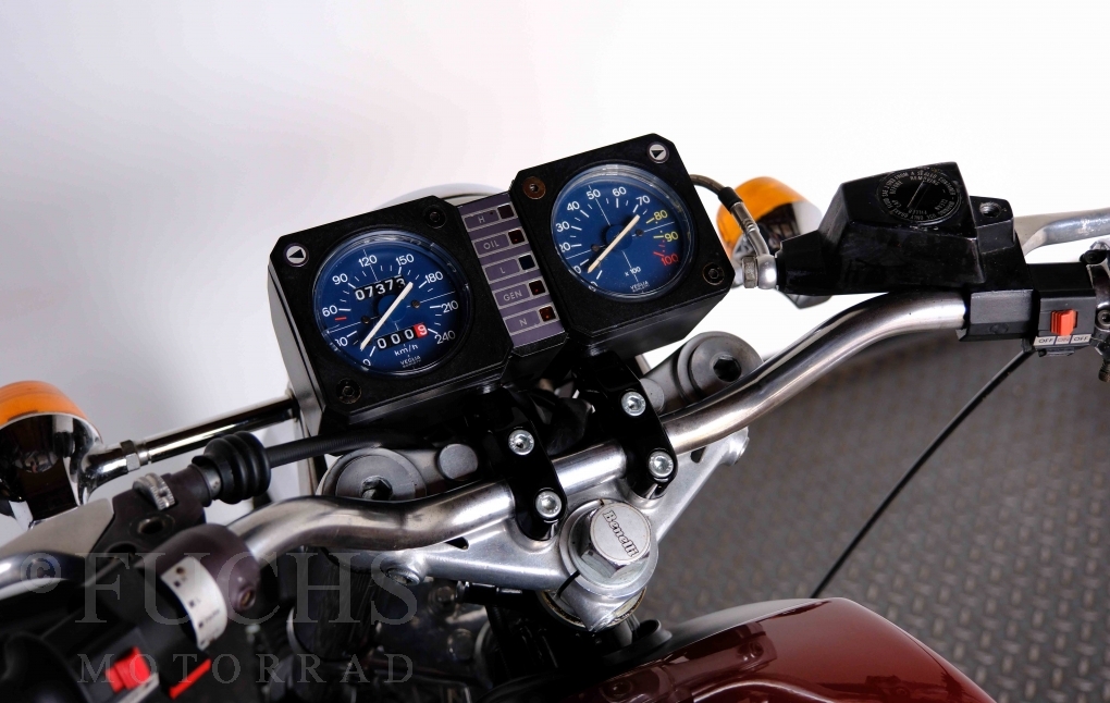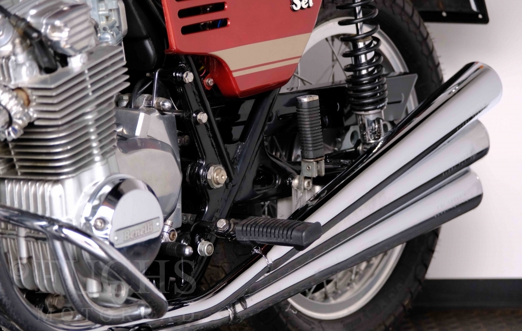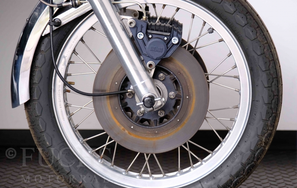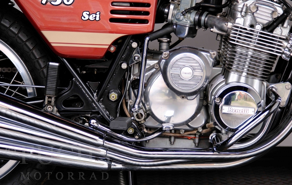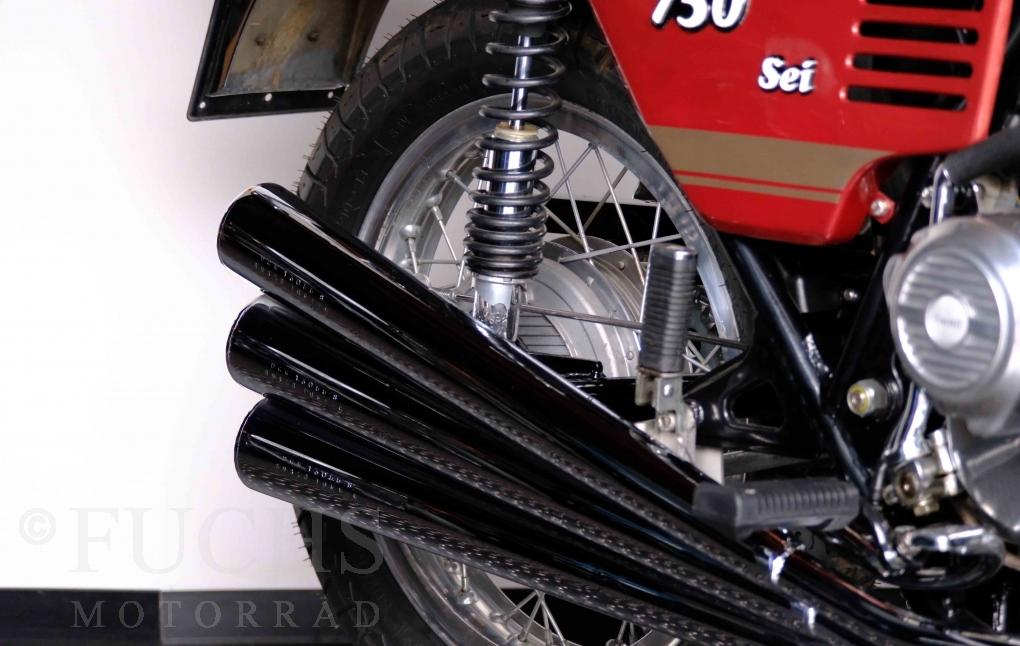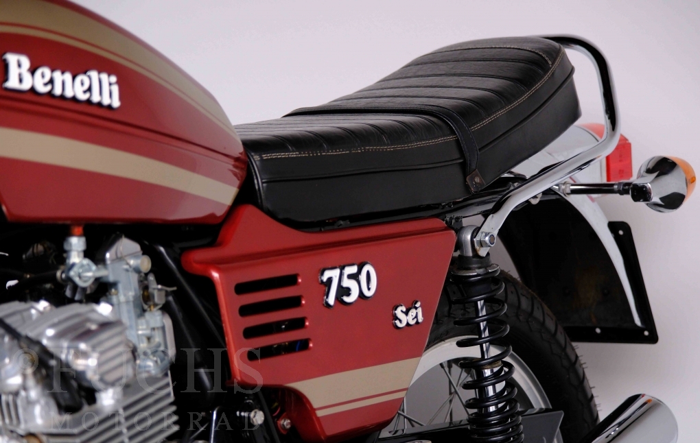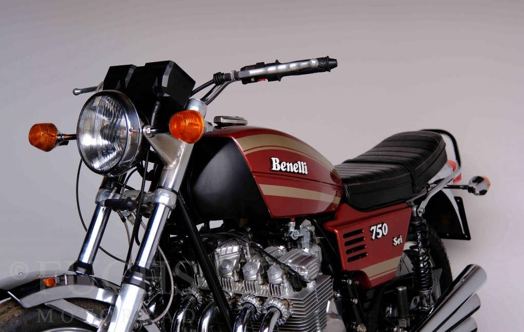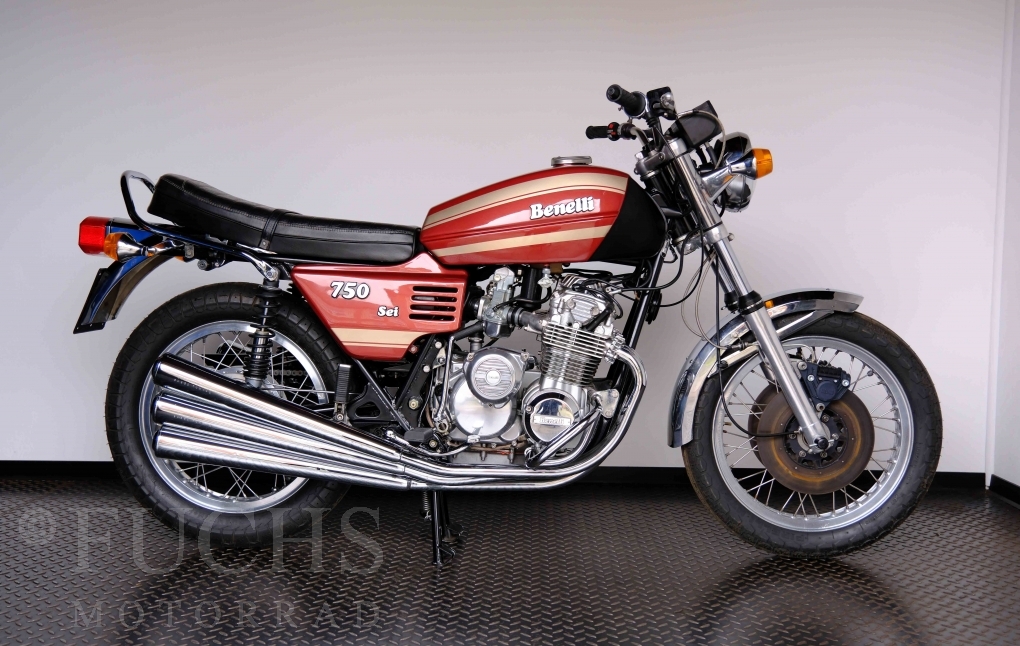 In den vergangenen Jahren haben wir immer wieder Benelli 750 Sei weltweit verkaufen können. Mittlerweile hat sich die 750er Sechszylinder Maschine zu einem gesuchten Sammlerstück entwickelt. Die Geschichte der 750 Sei begint mit dem berühmten Konstrukteur Piero Prampolini, der viele Jahre für die Benelli Familie gearbeitet hat. 1972 gelang es ihm gemeinsam mit seinem Team die erste Sei auf dem Salon in Modena zu präsentieren. Gebaut wurde die 750 Sei anschließend in 3 verschiedenen Serien. Die Stückzahl betrug 3.204. Die jeweiligen Unterschiede zwischen den einzelnen Serien ist marginal. Unsere 750 Sei stammt aus der 1. Serie, was durch die Lage des Zündschlosses sofort erkennbar ist. Die sehr gute originale Auspuffanlage mit dem sagenhaften Sound in Verbindung mit Borrani Felgen machen unsere Benelli zu einem sehr schönen Sammlerstück, dass fahrfertig und mit deutschen Papieren von uns verkauft wird.