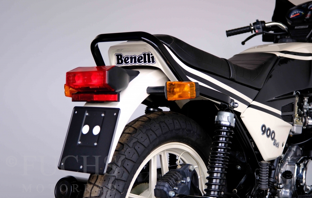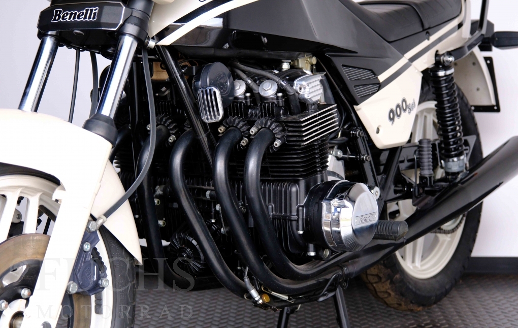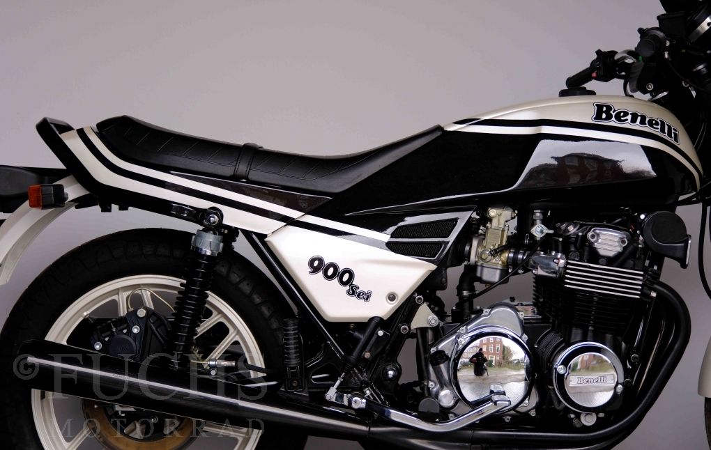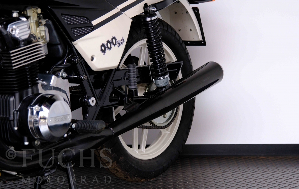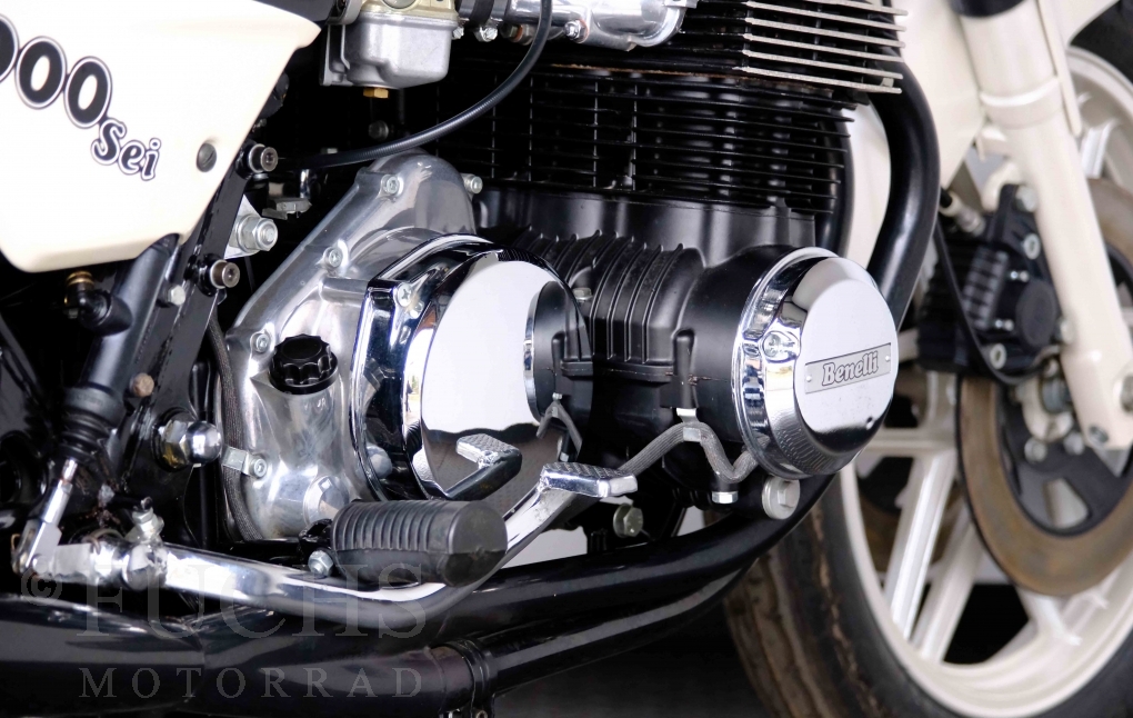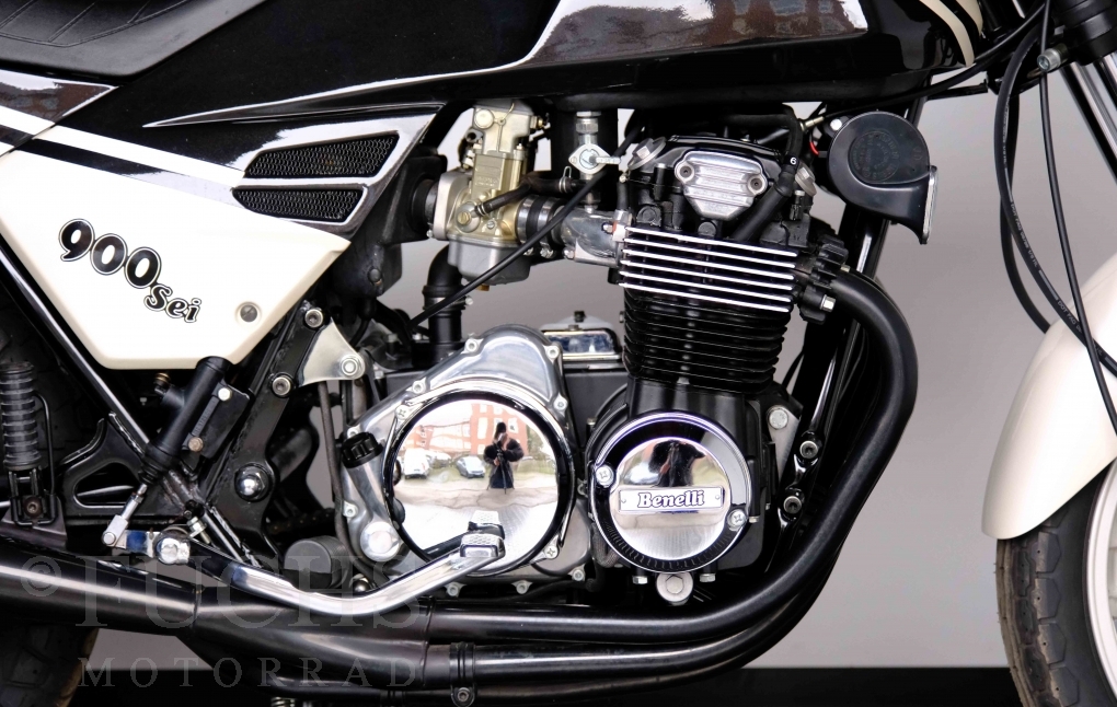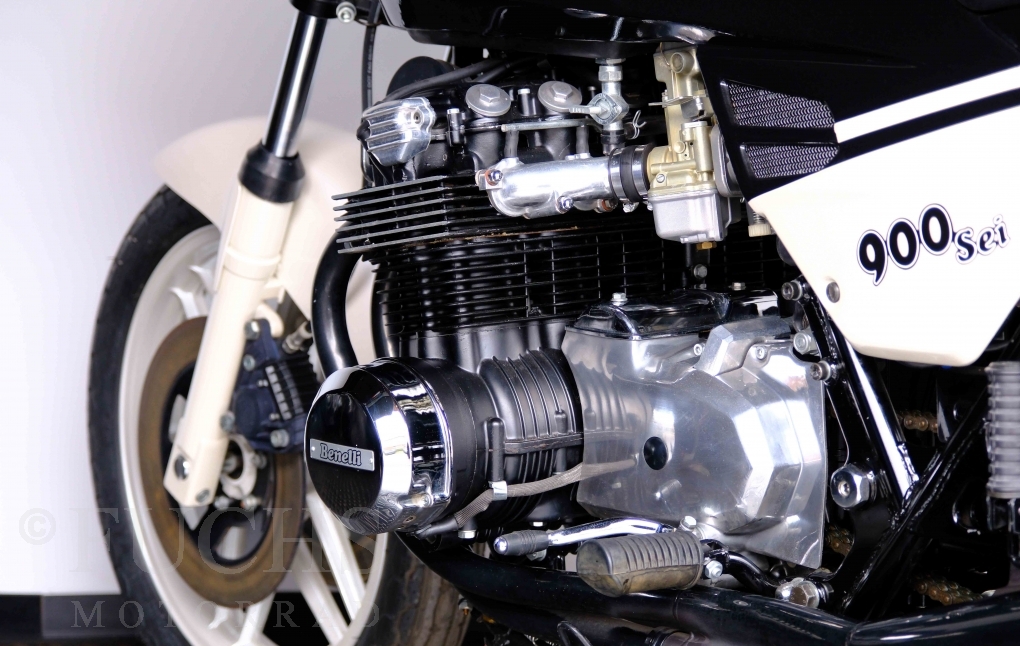Nur 1908 Benelli 900 Sei wurden in 3 Serien gebaut. Unsere 900 Sei stammt aus der 3. Serie. 373 Fahrzeuge wurden in der 3. Serie gebaut. Im Unterschied zu den beiden ersten Serien wurden Änderungen an der Cockpitverkleidung mit einem Rechteckscheinwerfer nun angeboten. Eine schwarze Auspuffanlage, Zweifarbenackierung, ein Haltgriff am Heck sollten das modernisierte Design abrunden. Unsere Benelli 900 Sei ist ein besonderes Exemplar, weil die 6-Zylinder Maschine nie gefahren wurde. Glücklicherweise ist auch das originale Bordwerkzeug noch vorhanden. Selbstverständlich hat diese Benelli 900 Sei die Besonderheit, dass eine Duplex-Kette verbaut ist.