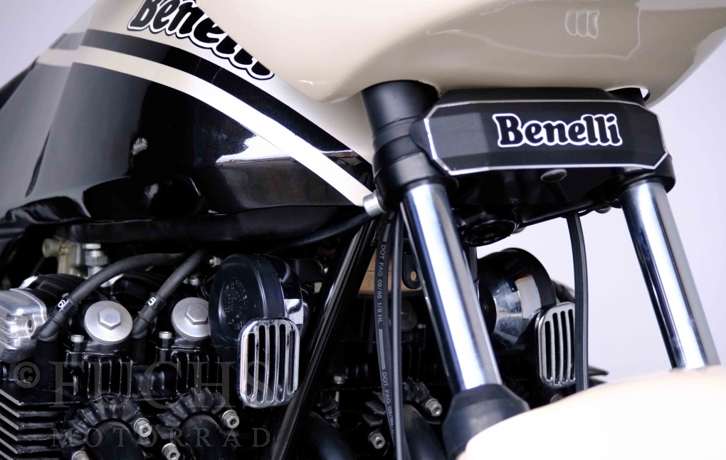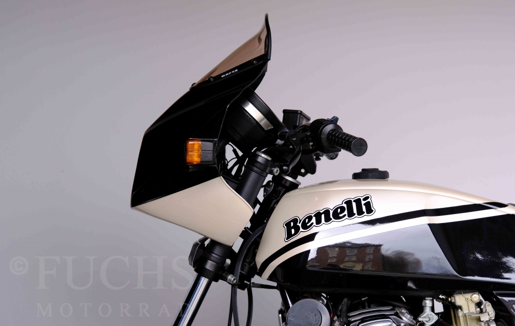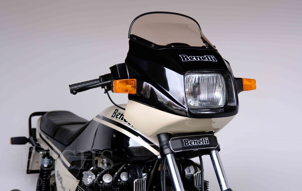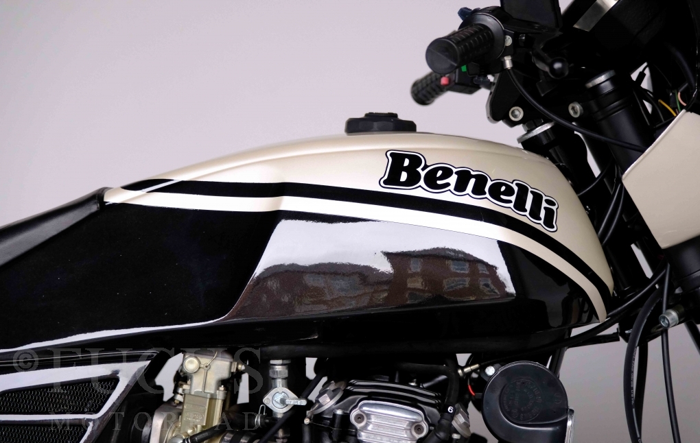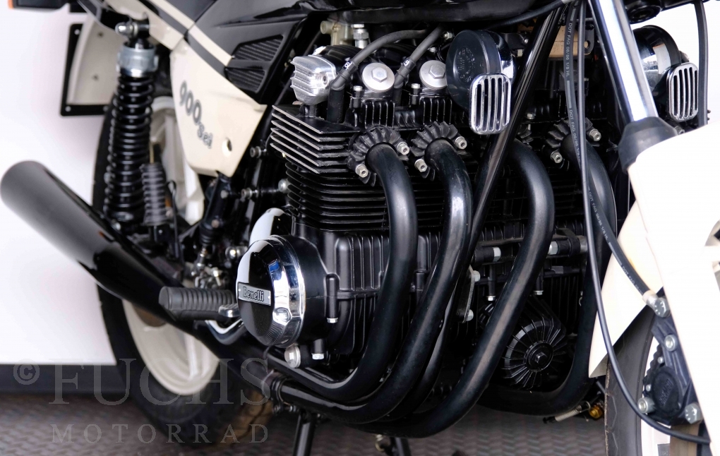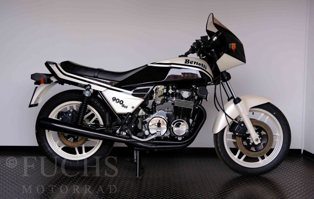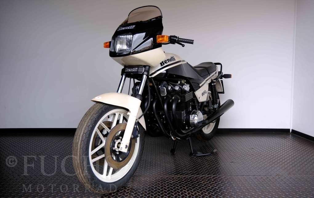 Nur 1908 Benelli 900 Sei wurden in 3 Serien gebaut. Unsere 900 Sei stammt aus der 3. Serie. 373 Fahrzeuge wurden in der 3. Serie gebaut. Im Unterschied zu den beiden ersten Serien wurden Änderungen an der Cockpitverkleidung mit einem Rechteckscheinwerfer nun angeboten. Eine schwarze Auspuffanlage, Zweifarbenackierung, ein Haltgriff am Heck sollten das modernisierte Design abrunden. Unsere Benelli 900 Sei ist ein besonderes Exemplar, weil die 6-Zylinder Maschine nie gefahren wurde. Glücklicherweise ist auch das originale Bordwerkzeug noch vorhanden. Selbstverständlich hat diese Benelli 900 Sei die Besonderheit, dass eine Duplex-Kette verbaut ist.