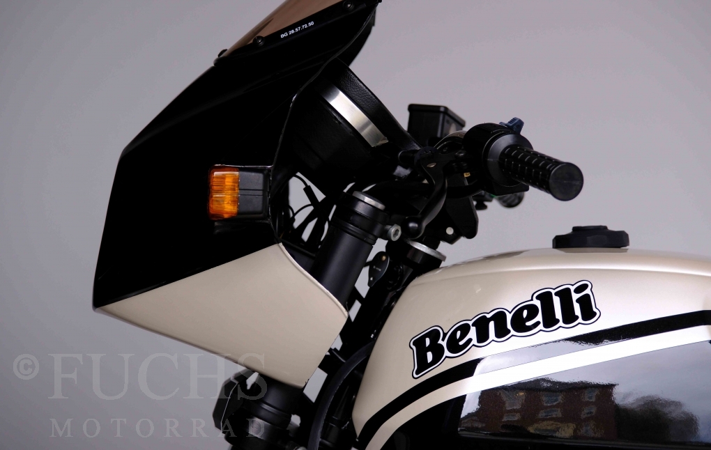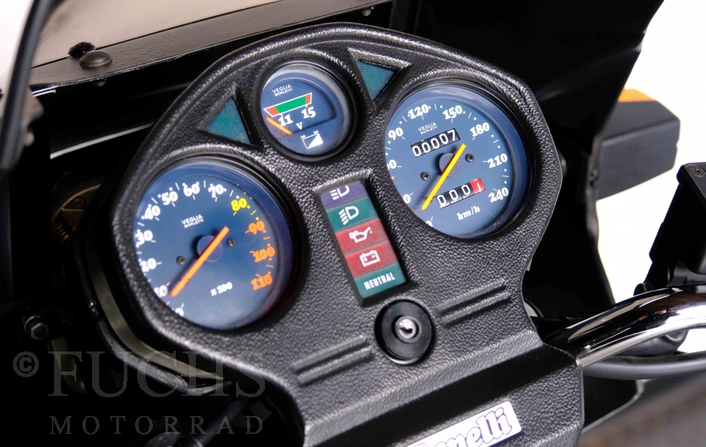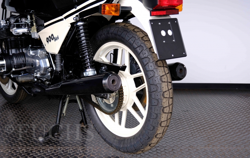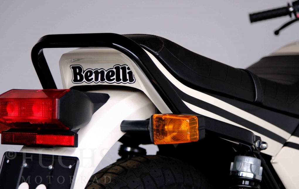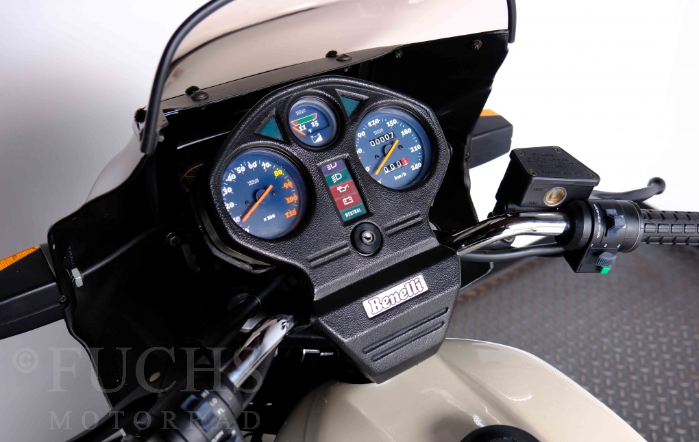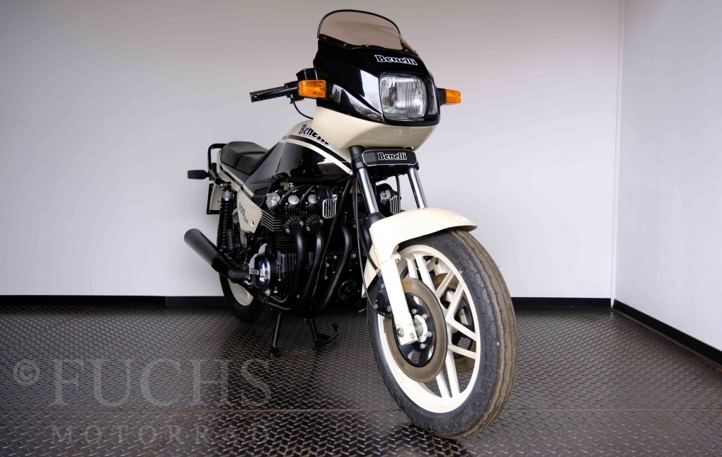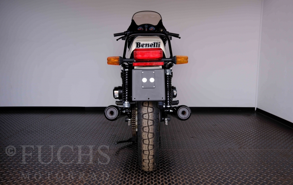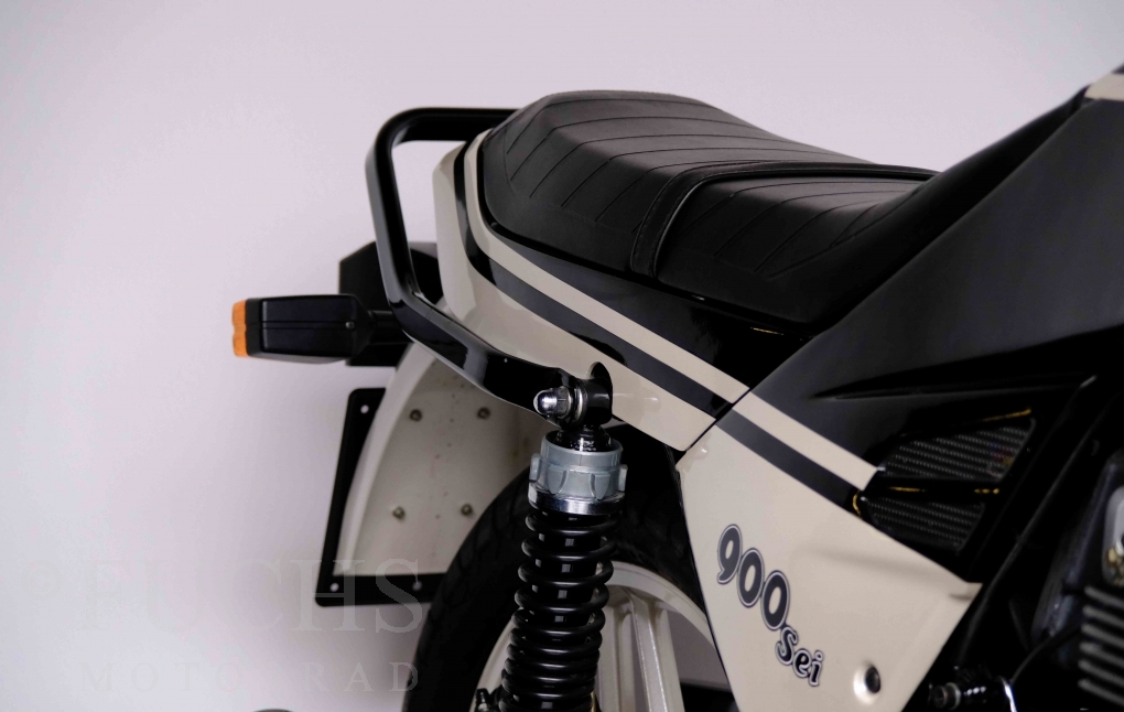 Nur 1908 Benelli 900 Sei wurden in 3 Serien gebaut. Unsere 900 Sei stammt aus der 3. Serie. 373 Fahrzeuge wurden in der 3. Serie gebaut. Im Unterschied zu den beiden ersten Serien wurden Änderungen an der Cockpitverkleidung mit einem Rechteckscheinwerfer nun angeboten. Eine schwarze Auspuffanlage, Zweifarbenackierung, ein Haltgriff am Heck sollten das modernisierte Design abrunden. Unsere Benelli 900 Sei ist ein besonderes Exemplar, weil die 6-Zylinder Maschine nie gefahren wurde. Glücklicherweise ist auch das originale Bordwerkzeug noch vorhanden. Selbstverständlich hat diese Benelli 900 Sei die Besonderheit, dass eine Duplex-Kette verbaut ist.
