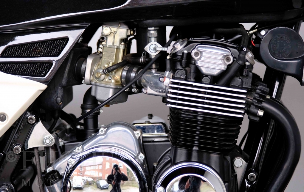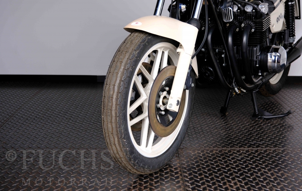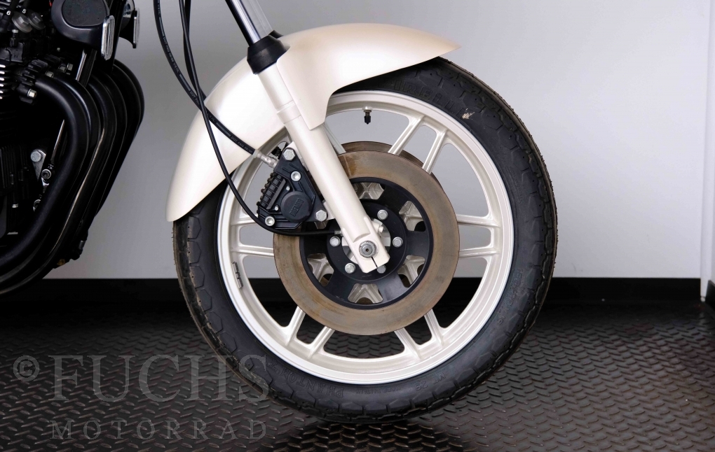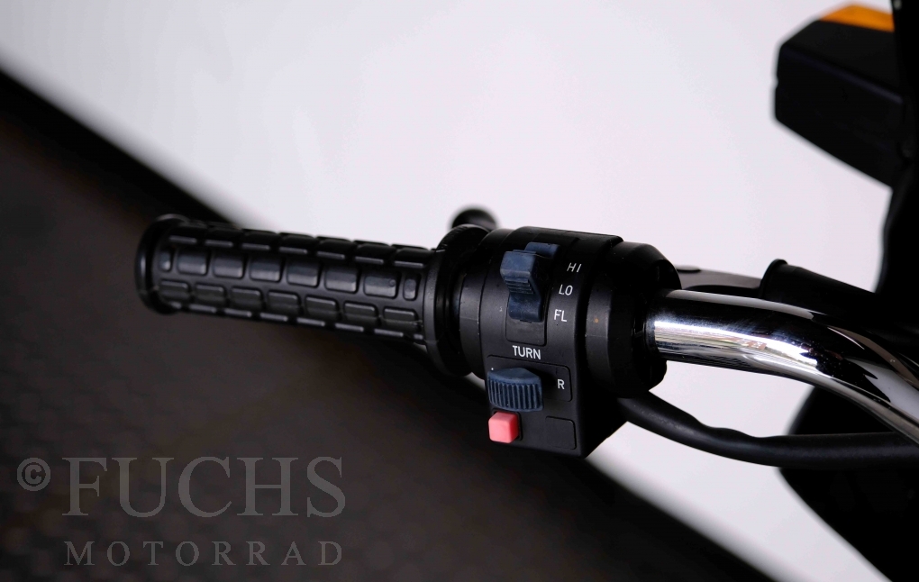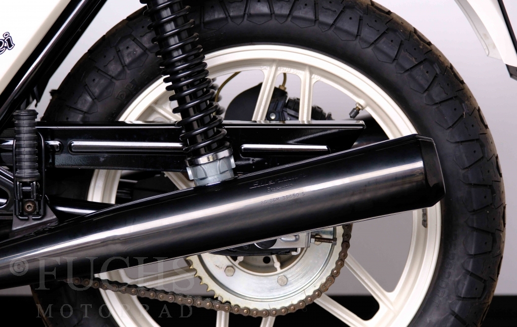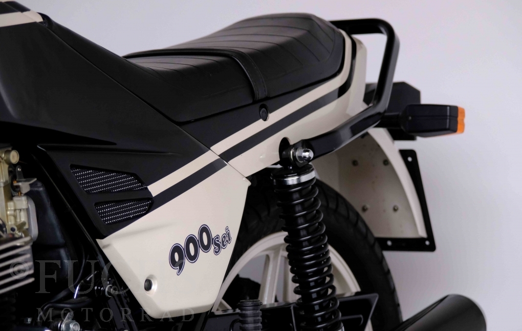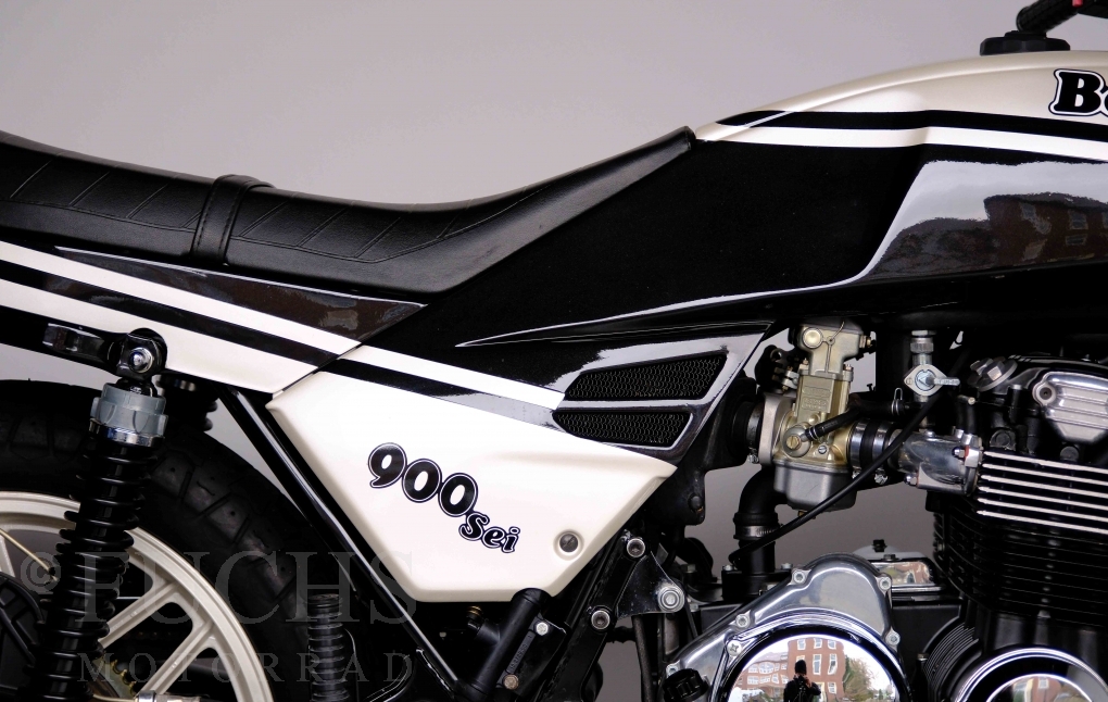 Nur 1908 Benelli 900 Sei wurden in 3 Serien gebaut. Unsere 900 Sei stammt aus der 3. Serie. 373 Fahrzeuge wurden in der 3. Serie gebaut. Im Unterschied zu den beiden ersten Serien wurden Änderungen an der Cockpitverkleidung mit einem Rechteckscheinwerfer nun angeboten. Eine schwarze Auspuffanlage, Zweifarbenackierung, ein Haltgriff am Heck sollten das modernisierte Design abrunden. Unsere Benelli 900 Sei ist ein besonderes Exemplar, weil die 6-Zylinder Maschine nie gefahren wurde. Glücklicherweise ist auch das originale Bordwerkzeug noch vorhanden. Selbstverständlich hat diese Benelli 900 Sei die Besonderheit, dass eine Duplex-Kette verbaut ist.