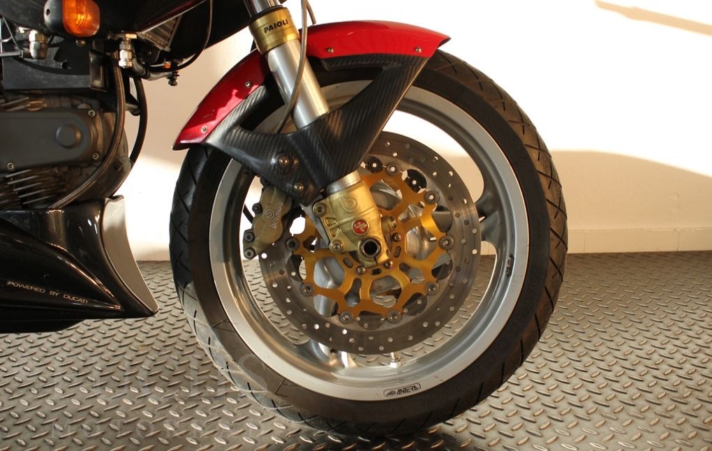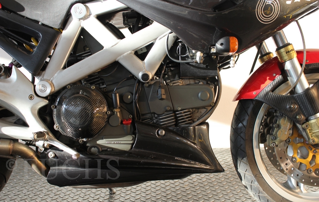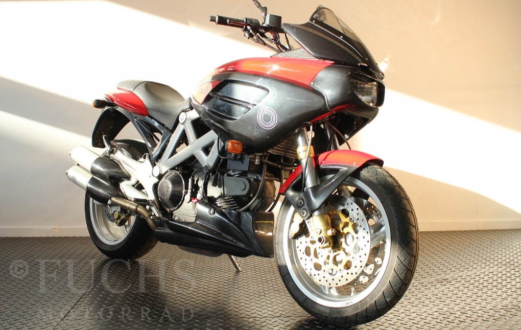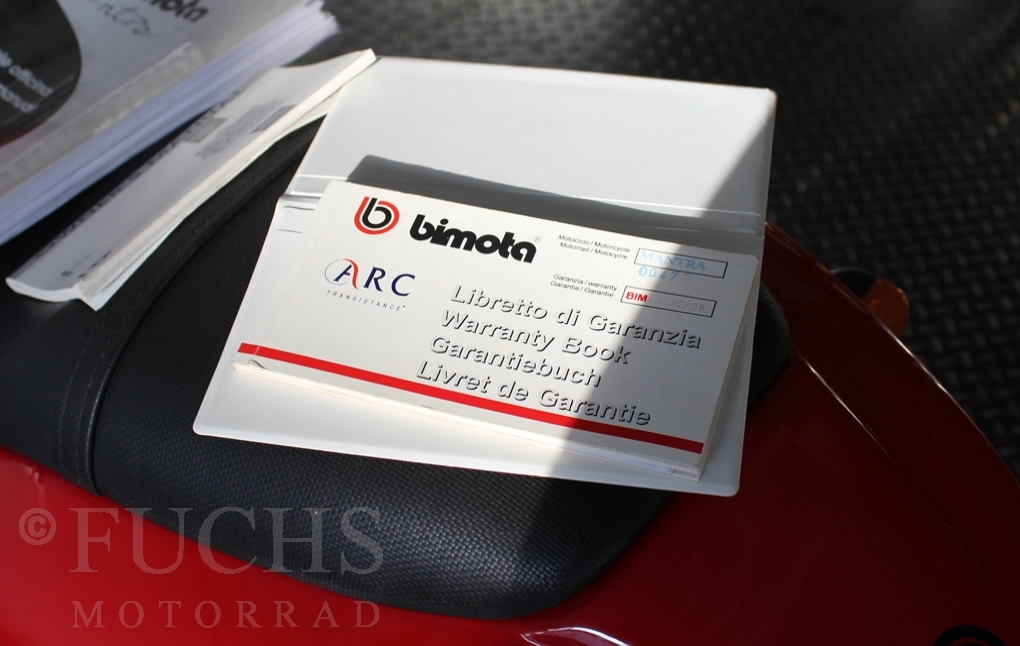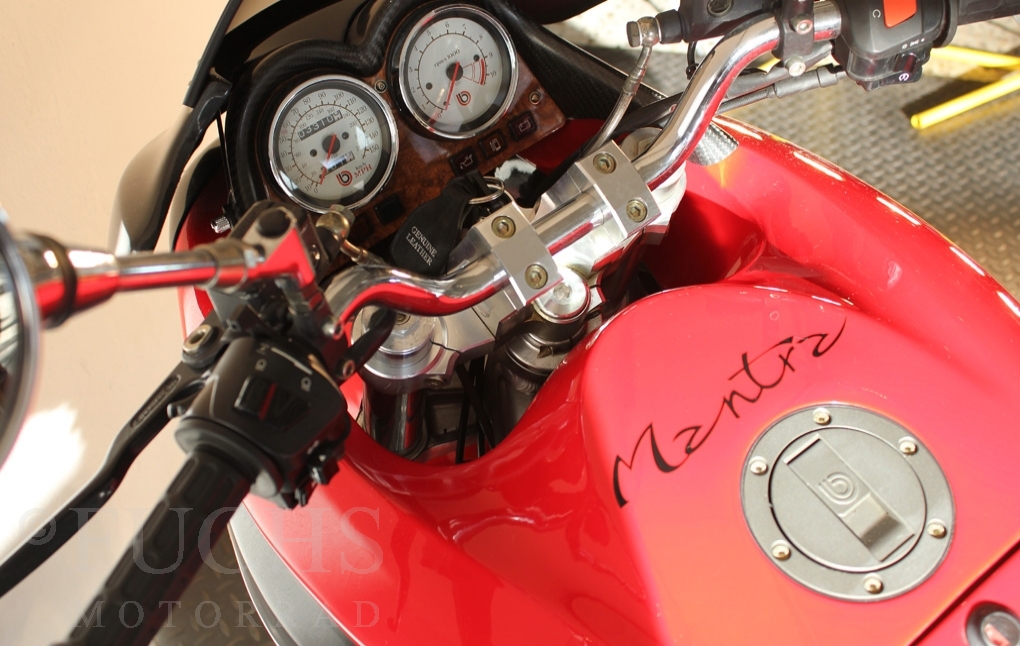Die Mantra wurde in der Zeit von 1995-1998 produziert. Es entstanden von unserem Modell 454 Exemplare. Der Gitterrohrrahmen aus Leichtmetall beherbergt einen leistungsgesteigerten Ducati-Motor. Ein polarisierdens Design das auch dazu führte, dass die Mantra in namhaften Museen ausgestellt wird.
