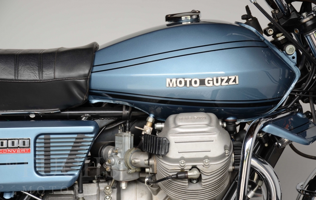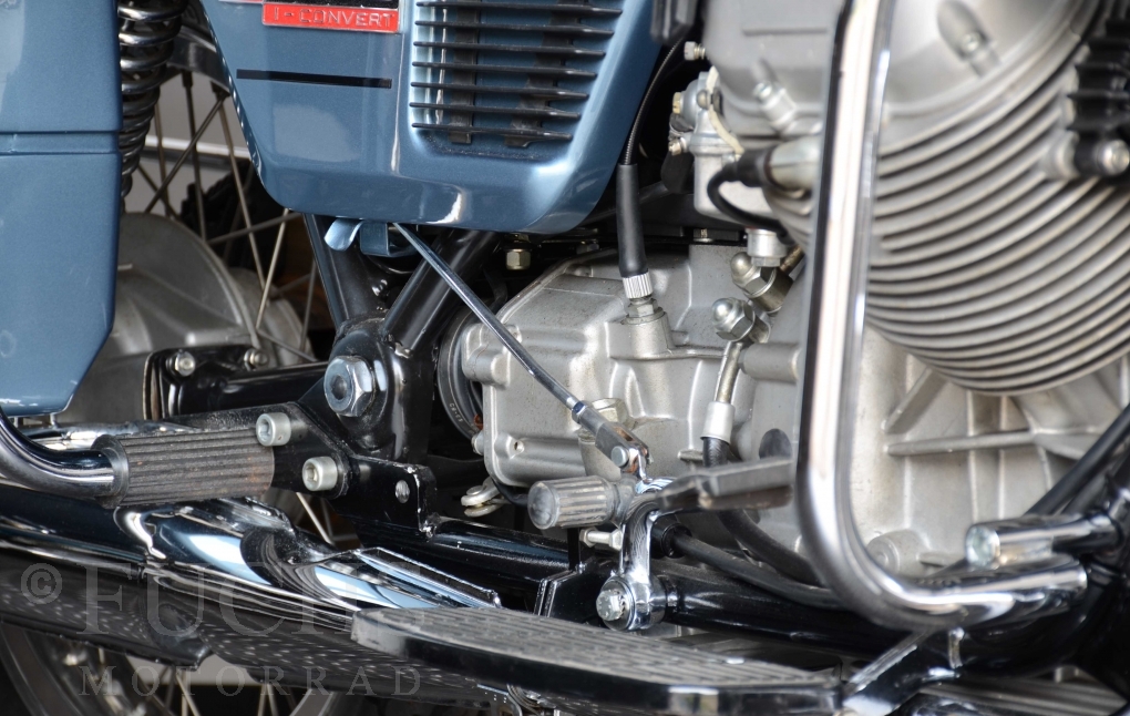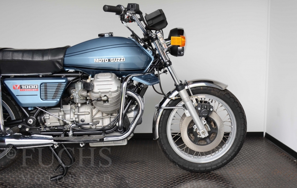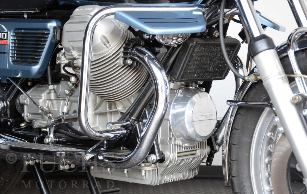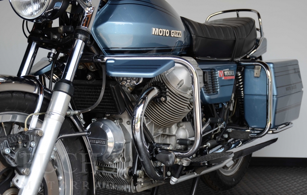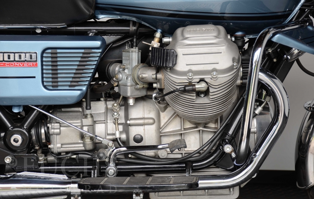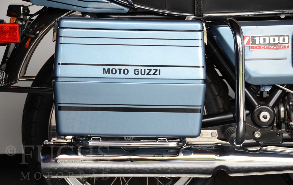 The V 1000 I-Convert was created by Moto Guzzi in the de Tomaso era. Moto Guzzi has advertised the machine with the remark: "a motorcycle of superlatives". It was then the only large tour motorcycle in the world with a semi-automatic Getriebve (Fichtel & Sachs converter) So from todays sight interesting that the construction in conjunction with the side stand was very expensive, because the side stand triggers a parking brake in the unfolded state. The paint kit is original. The tank was not painted.