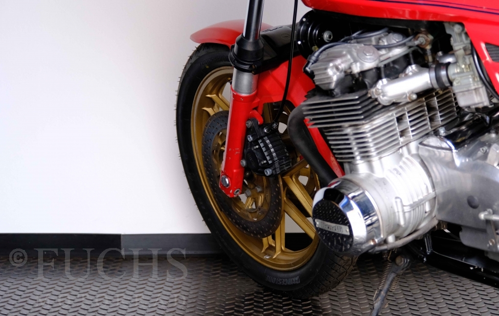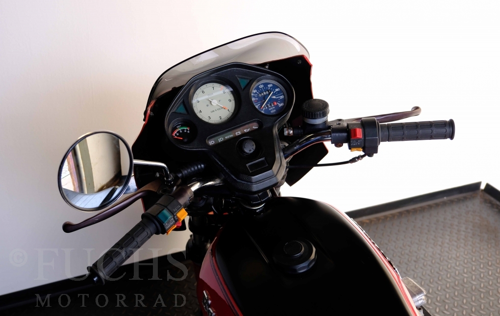 Die Benelli 900 Sei stammt aus Italien und wurde von uns teilweise restauriert. Unser erster Schritt war, dass die Kupplung überholt wurde. Dann haben wir glücklicherweise noch eine sehr gute Marving Auspuffanlage finden können. Damit der schöne Sound auch entspannt genossen werden kann, haben wir eine moderne Zündanlage verbaut. Mit der überholten Bremsanlage, neue IKON stoßdämpfer, neuen Reifen, neuer Batterie steht die schöne Benelli bereit für einen Käufer, der die De Tomaso Zeit bei Benelli erfahren will und dabei sich über ein grandioses Sounderlebnis des 6-Zylinders freut. Deutsche Fahrzeugpapiere liegen vor.