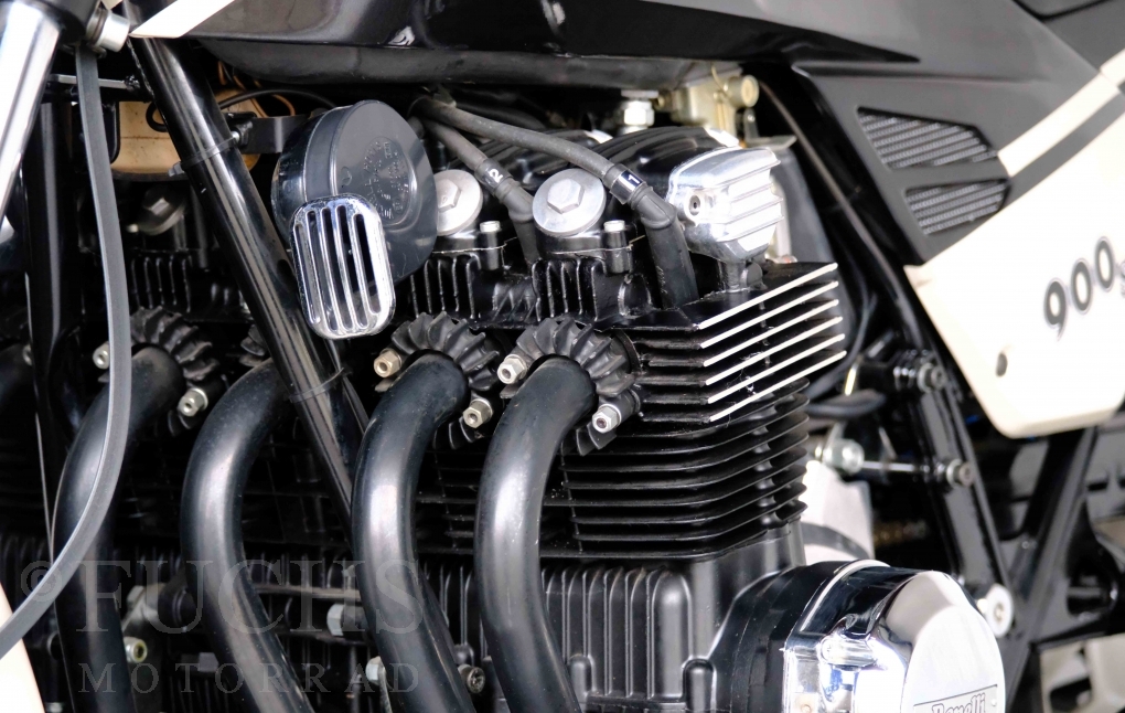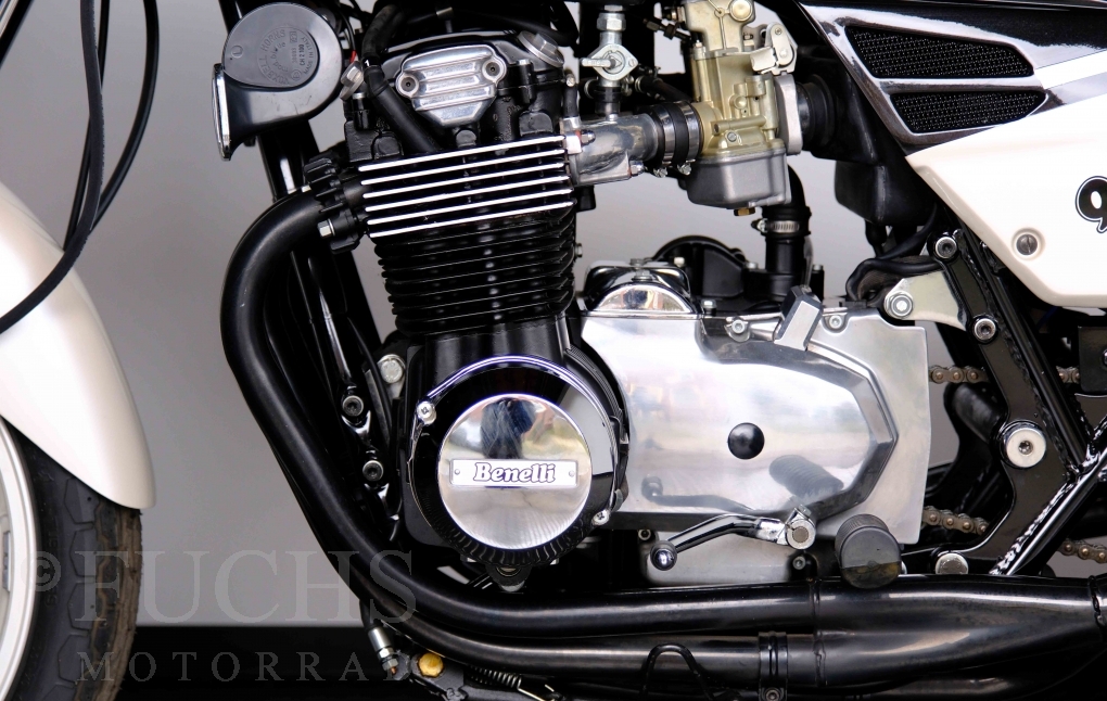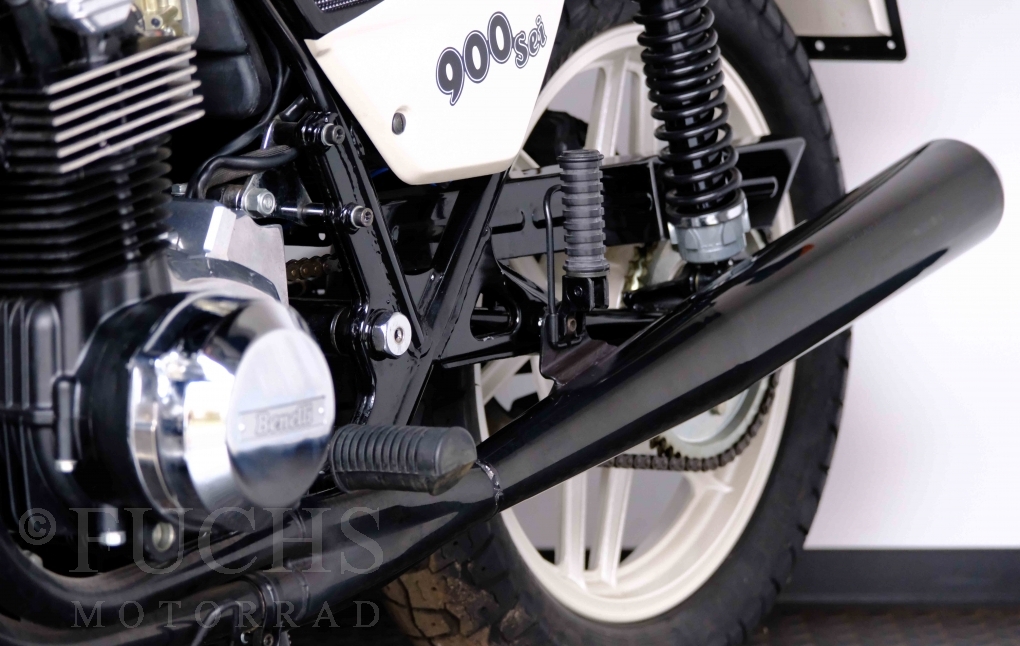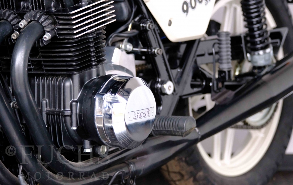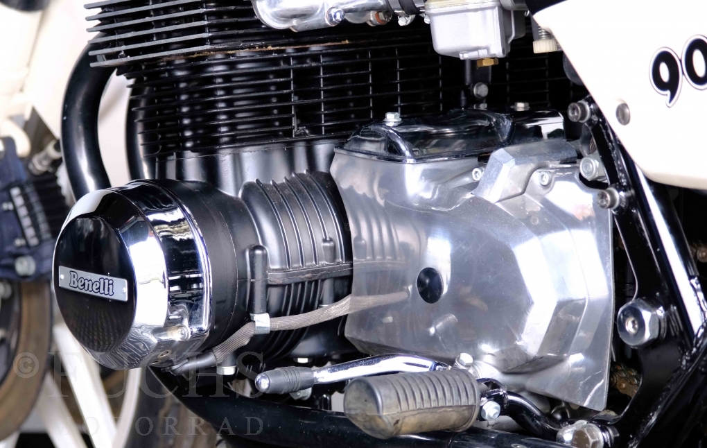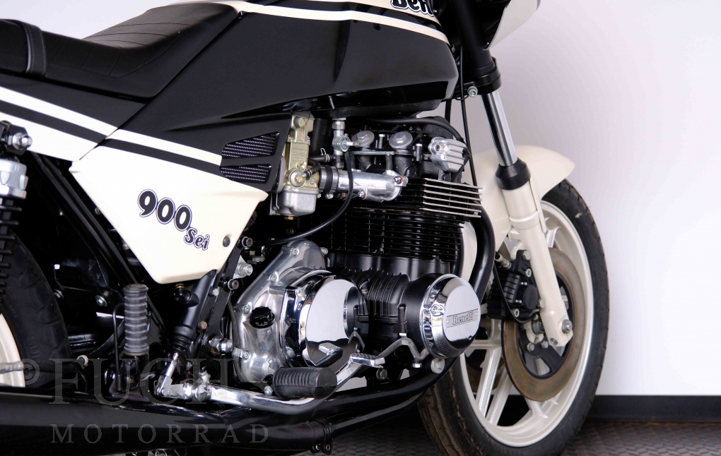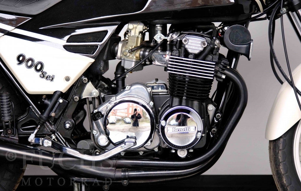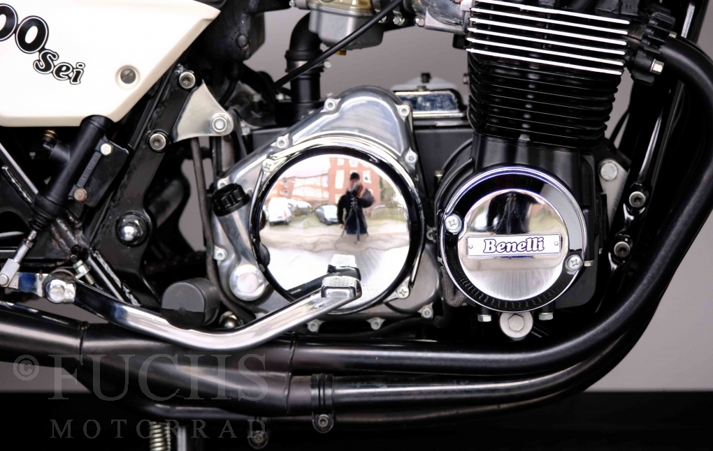 Only 1908 Benelli 900 Sei were built in 3 series. Our 900 Sei comes from the 3rd series. 373 vehicles were built in the 3rd series. Unlike the first two series, changes to the cockpit fairing with a rectangular headlight were now offered. A black exhaust system, two-tone paintwork and a grab handle at the rear rounded off the modernised design. Our Benelli 900 Sei is a special example because the 6-cylinder engine has never been driven. Fortunately, the original on-board tools are still there too. Of course, this Benelli 900 Sei has the special feature of a duplex chain.