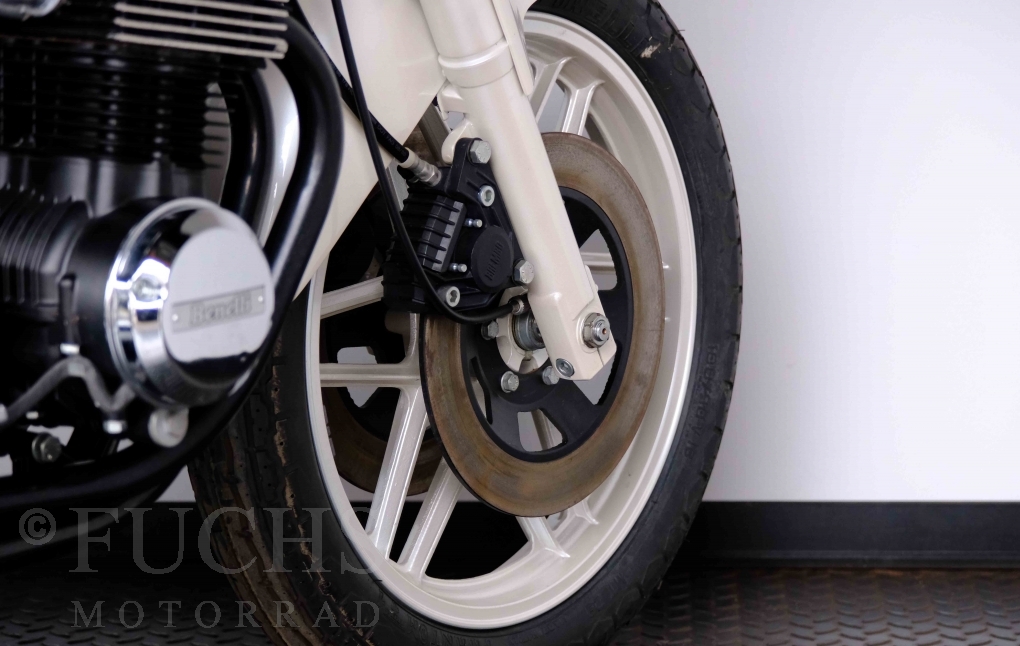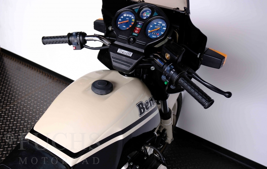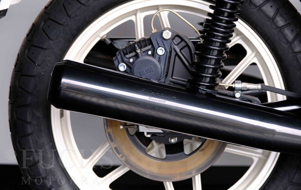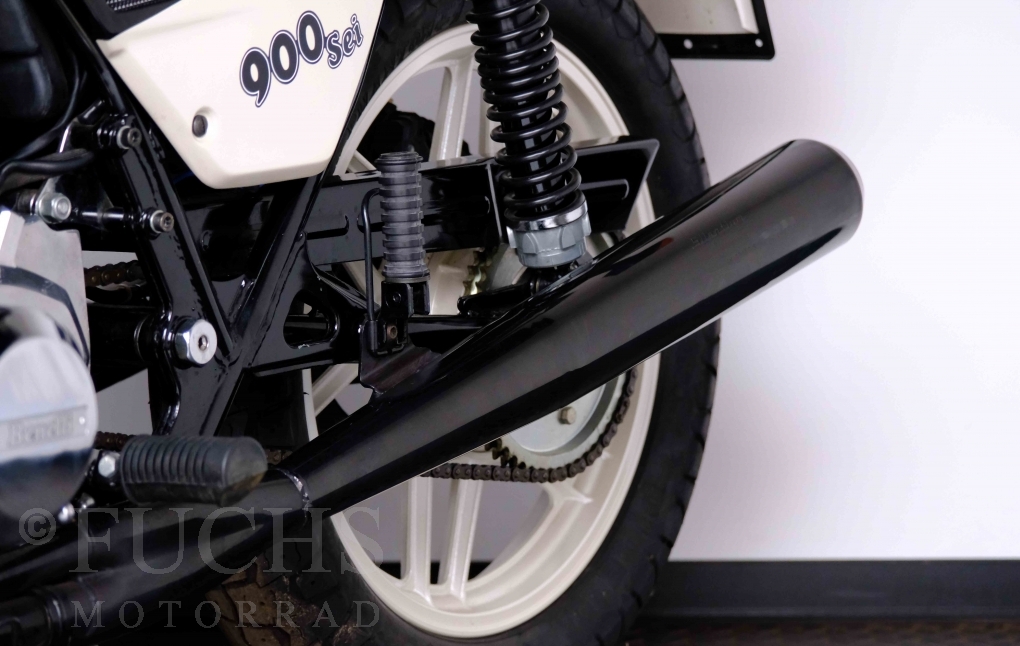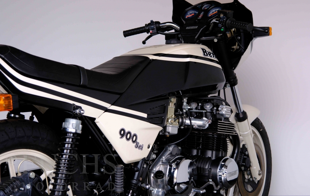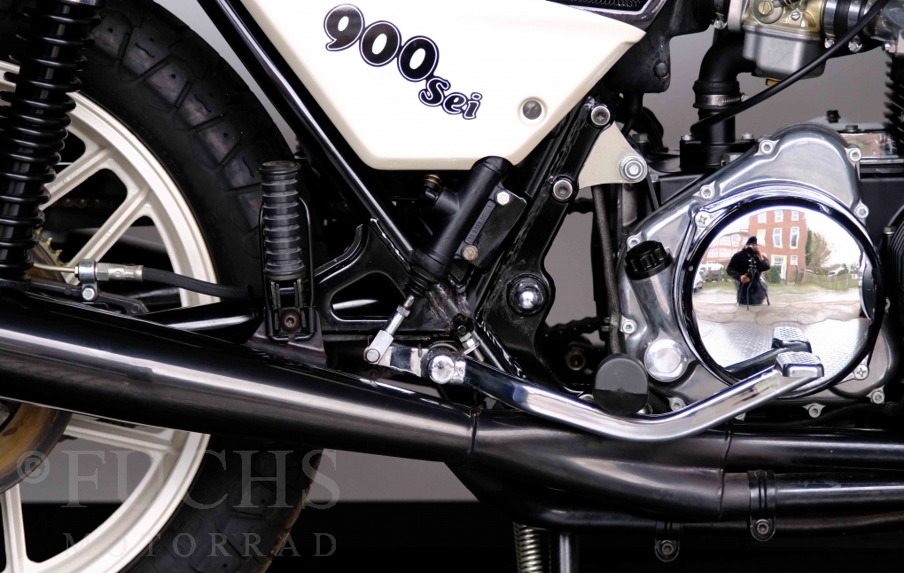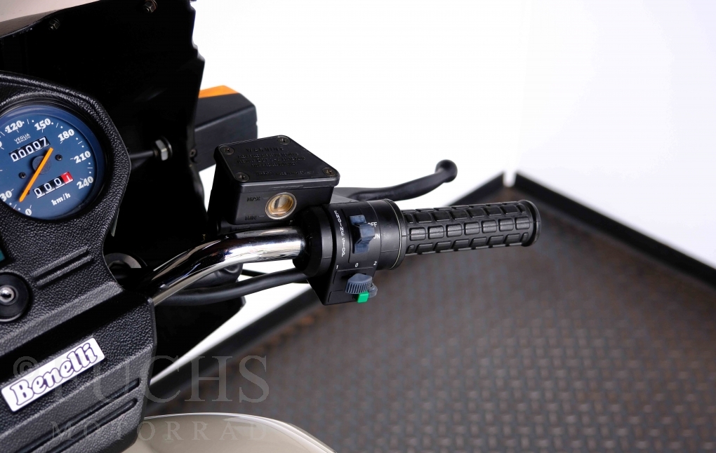 Only 1908 Benelli 900 Sei were built in 3 series. Our 900 Sei comes from the 3rd series. 373 vehicles were built in the 3rd series. Unlike the first two series, changes to the cockpit fairing with a rectangular headlight were now offered. A black exhaust system, two-tone paintwork and a grab handle at the rear rounded off the modernised design. Our Benelli 900 Sei is a special example because the 6-cylinder engine has never been driven. Fortunately, the original on-board tools are still there too. Of course, this Benelli 900 Sei has the special feature of a duplex chain.