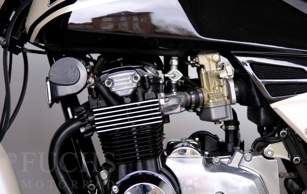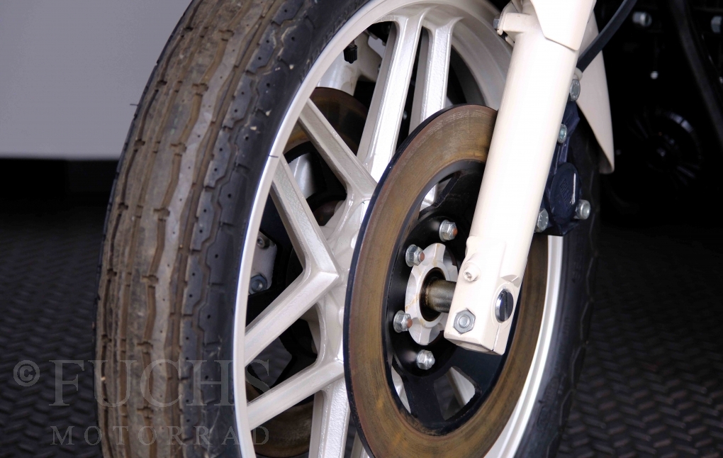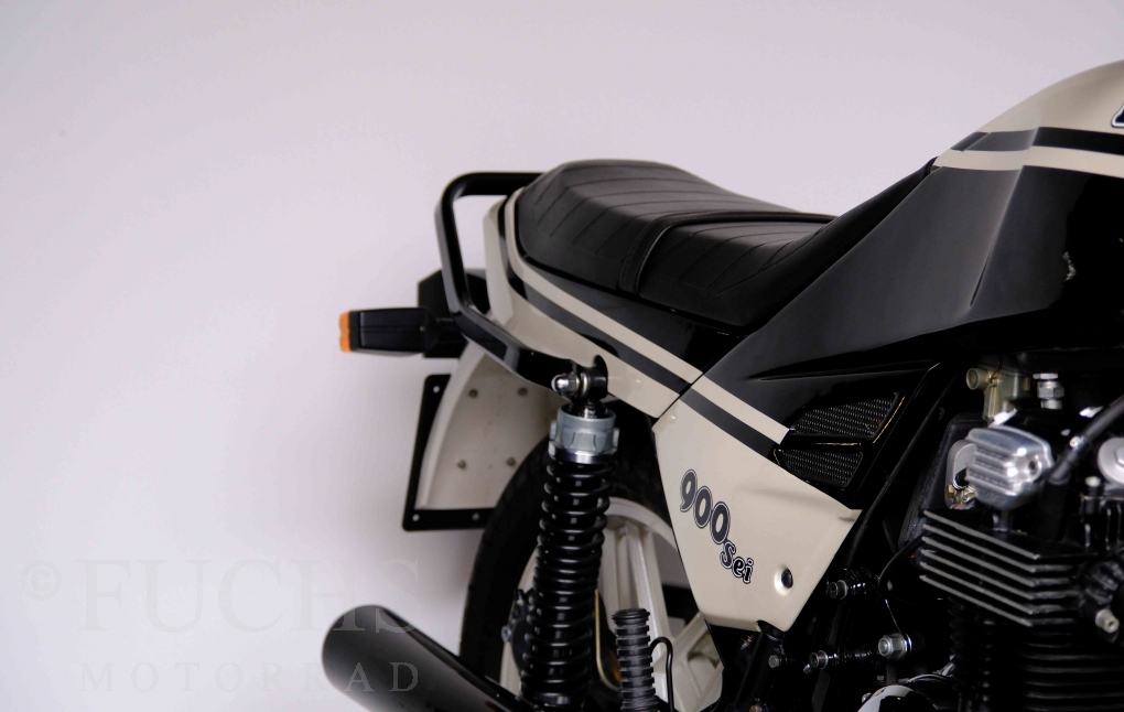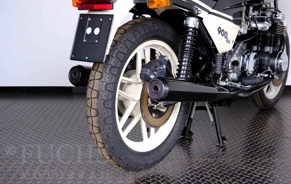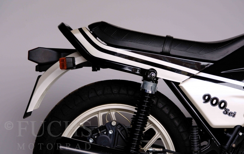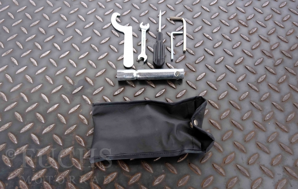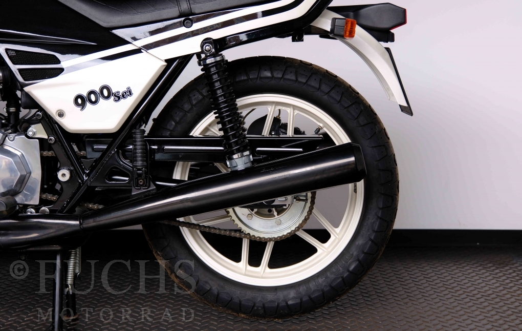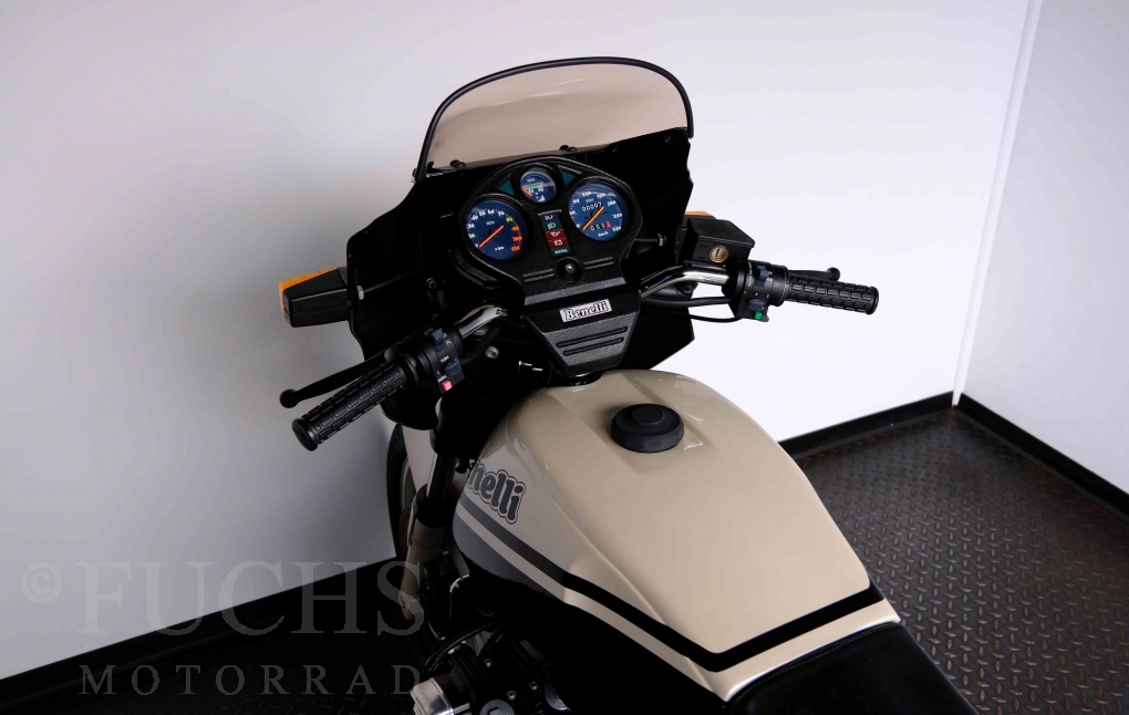 Only 1908 Benelli 900 Sei were built in 3 series. Our 900 Sei comes from the 3rd series. 373 vehicles were built in the 3rd series. Unlike the first two series, changes to the cockpit fairing with a rectangular headlight were now offered. A black exhaust system, two-tone paintwork and a grab handle at the rear rounded off the modernised design. Our Benelli 900 Sei is a special example because the 6-cylinder engine has never been driven. Fortunately, the original on-board tools are still there too. Of course, this Benelli 900 Sei has the special feature of a duplex chain.