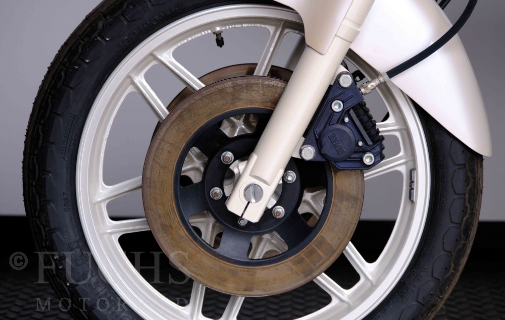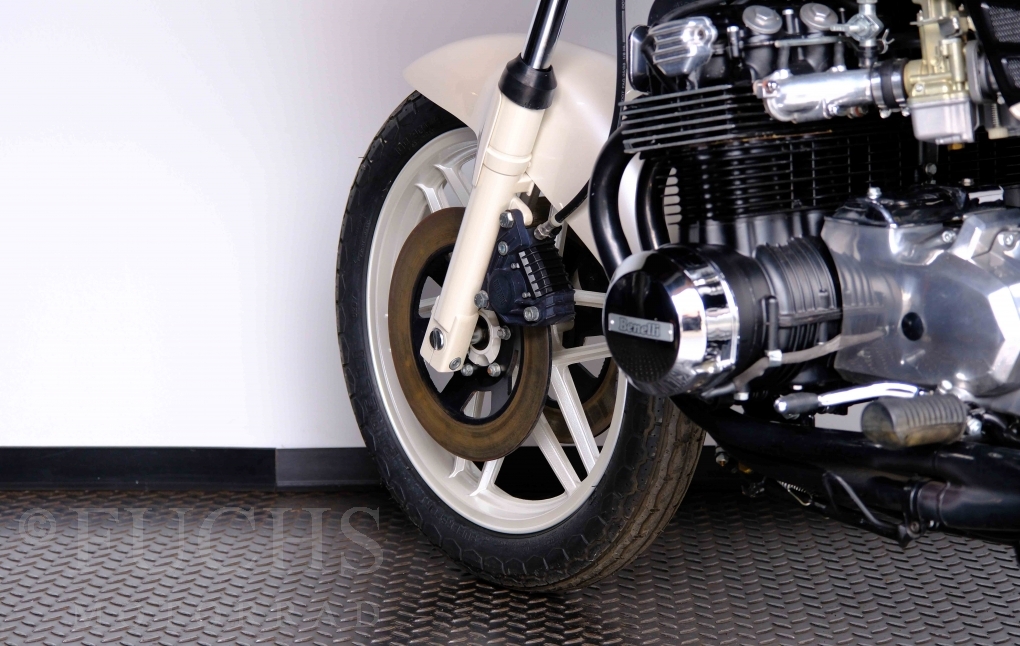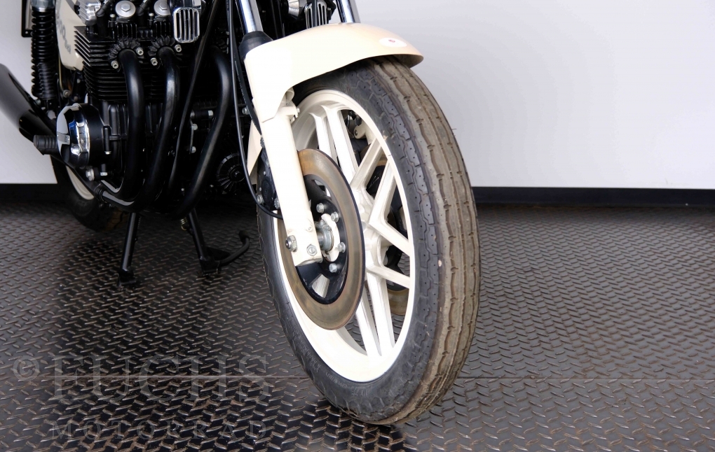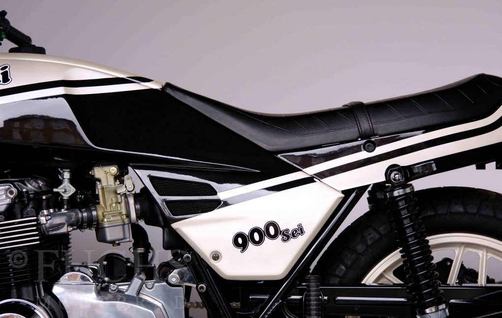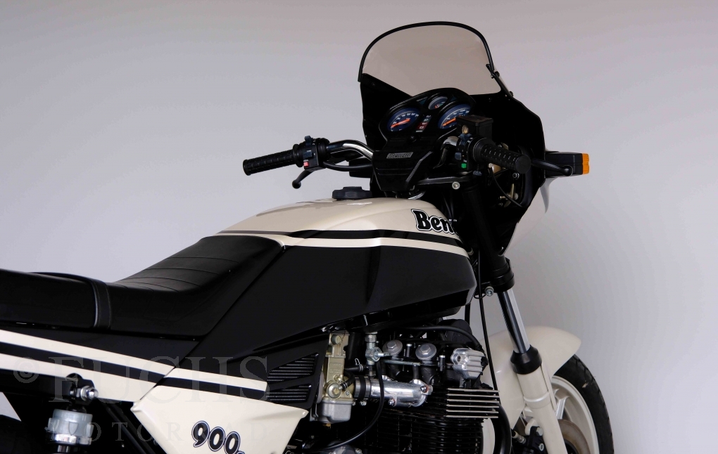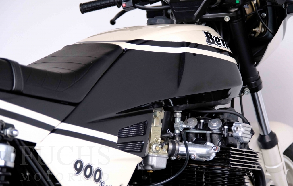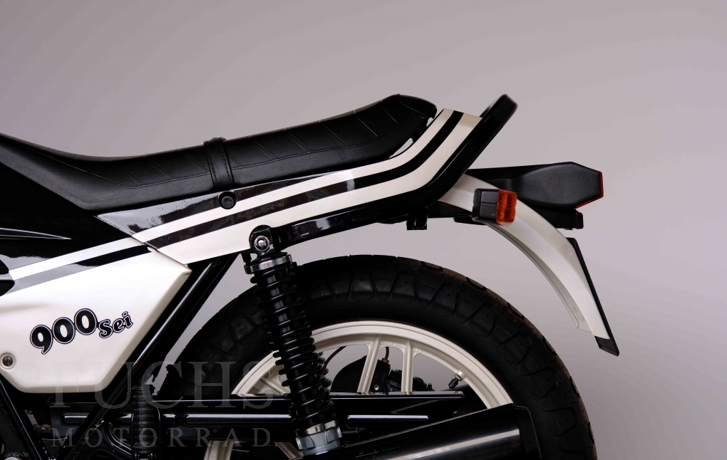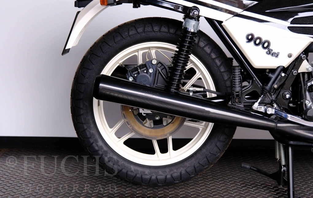 Only 1908 Benelli 900 Sei were built in 3 series. Our 900 Sei comes from the 3rd series. 373 vehicles were built in the 3rd series. Unlike the first two series, changes to the cockpit fairing with a rectangular headlight were now offered. A black exhaust system, two-tone paintwork and a grab handle at the rear rounded off the modernised design. Our Benelli 900 Sei is a special example because the 6-cylinder engine has never been driven. Fortunately, the original on-board tools are still there too. Of course, this Benelli 900 Sei has the special feature of a duplex chain.