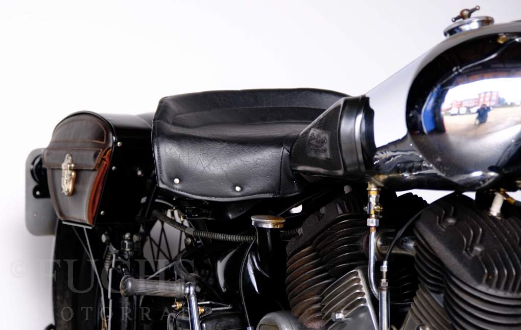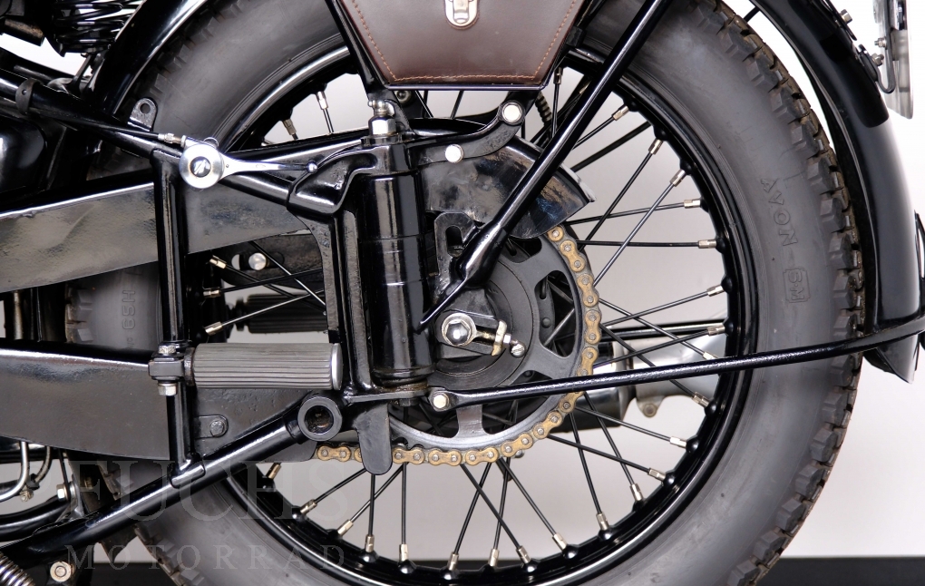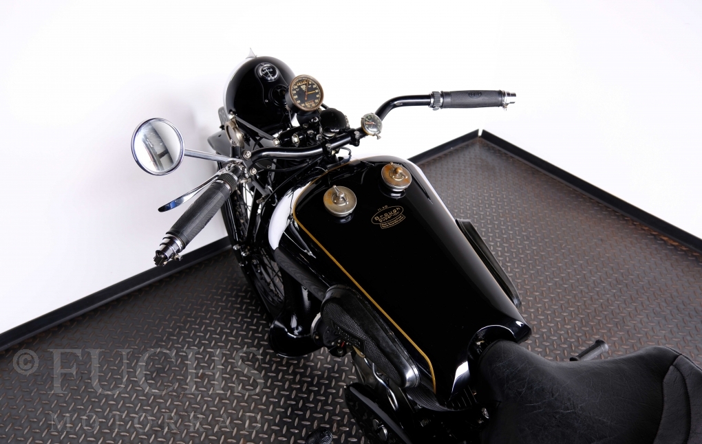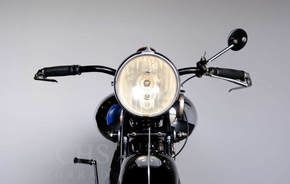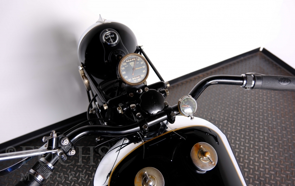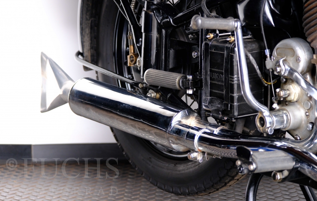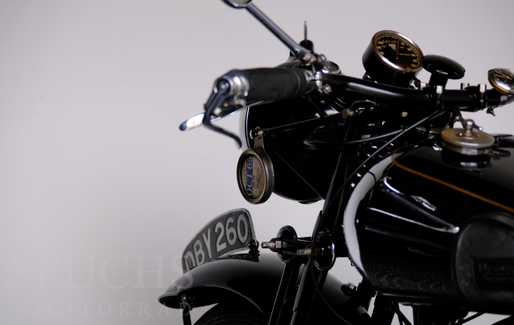 In 1938, Brough Superior completed the development of the plunger frame, and our 11-50 is one of the first motorcycles to have been delivered with this suspension system. A maximum of 10 Brough 11-50s were ever built with plunger suspension. The first-class quality of this Brough is complemented by a full restoration of the chassis and engine. A glance at the works record card confirms that we are dealing with matching numbers. This first-class collector’s item has been admired and awarded prizes at various events in recent years. We will deliver the Brough Superior ready to ride. We have german registration papers.