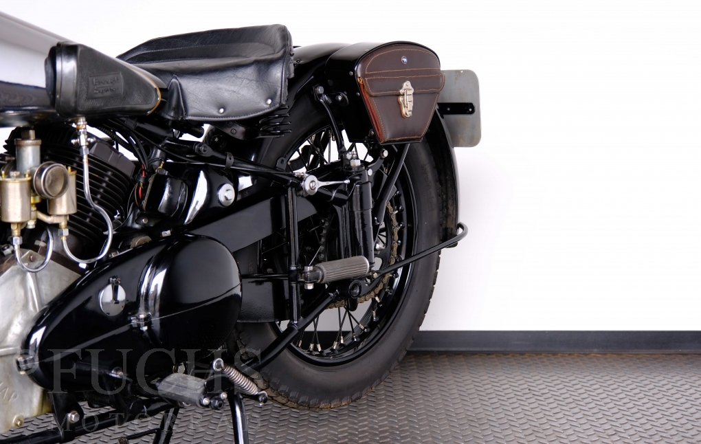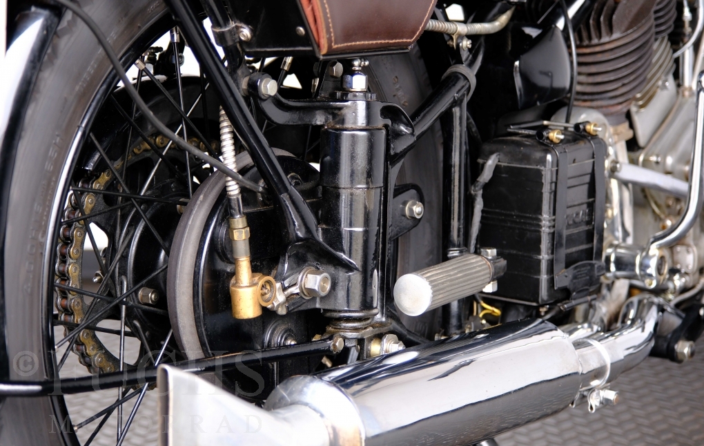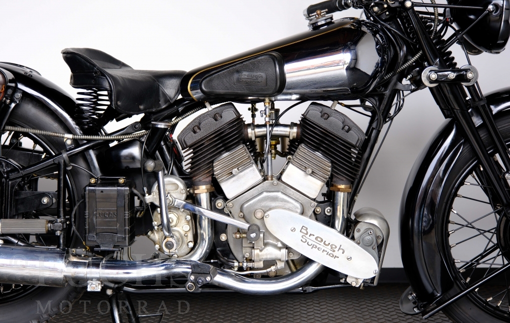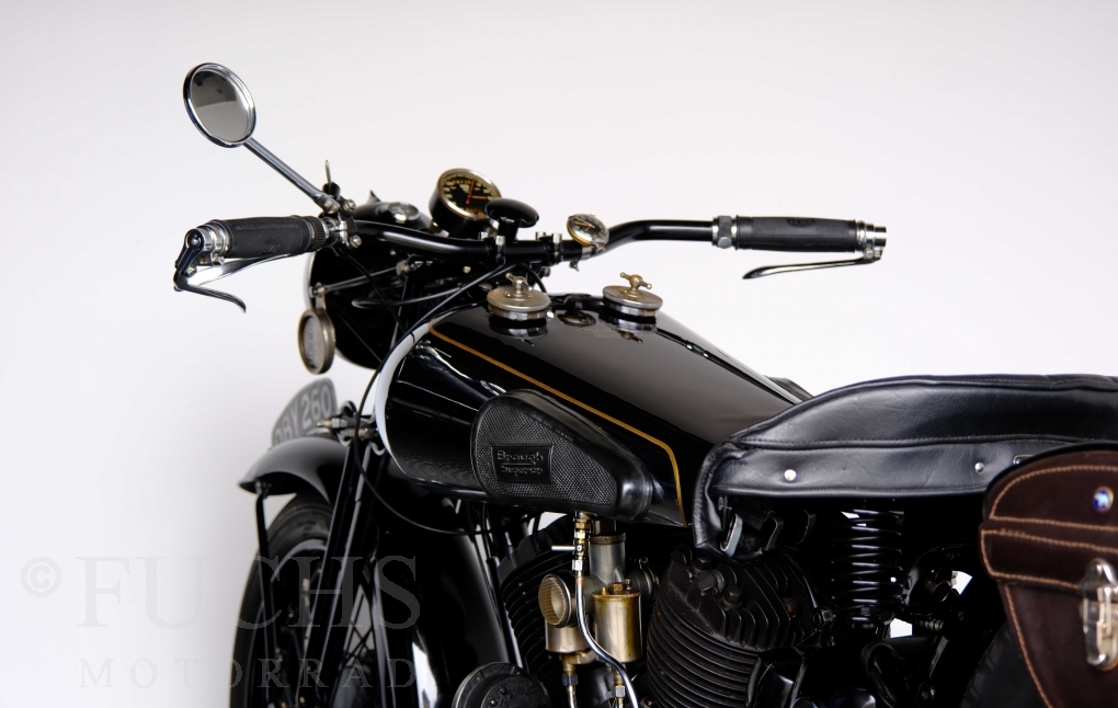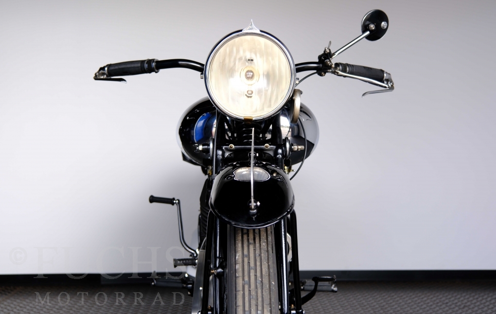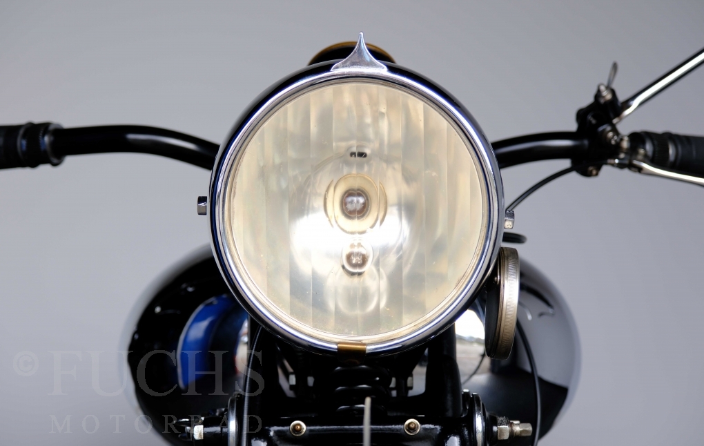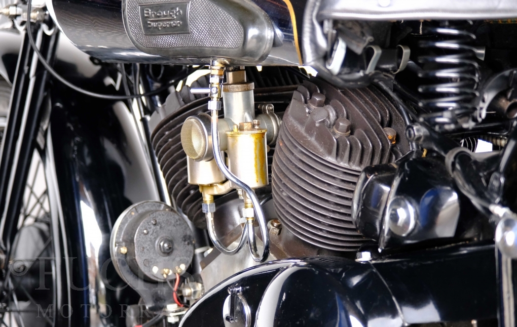 In 1938, Brough Superior completed the development of the plunger frame, and our 11-50 is one of the first motorcycles to have been delivered with this suspension system. A maximum of 10 Brough 11-50s were ever built with plunger suspension. The first-class quality of this Brough is complemented by a full restoration of the chassis and engine. A glance at the works record card confirms that we are dealing with matching numbers. This first-class collector’s item has been admired and awarded prizes at various events in recent years. We will deliver the Brough Superior ready to ride. We have german registration papers.