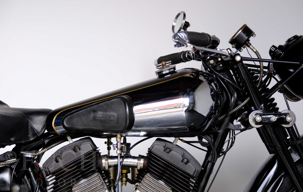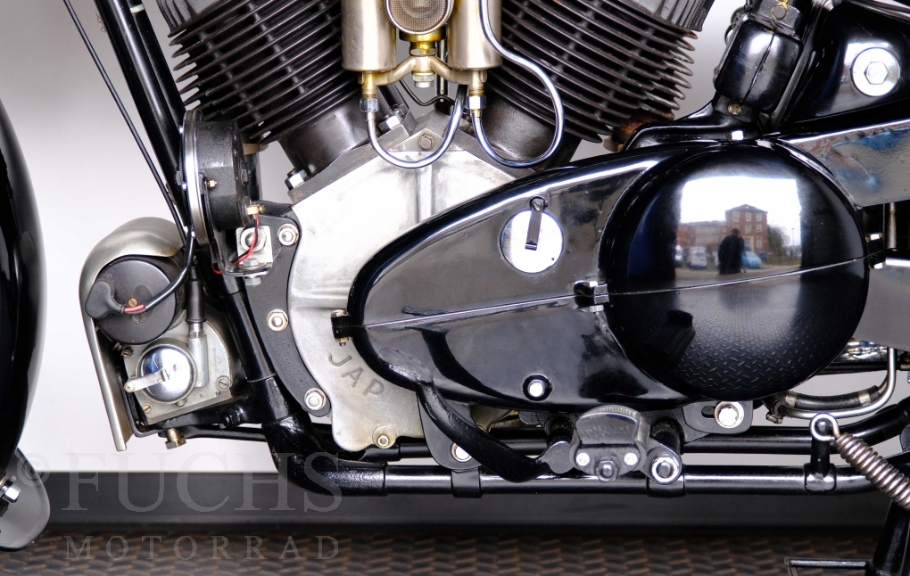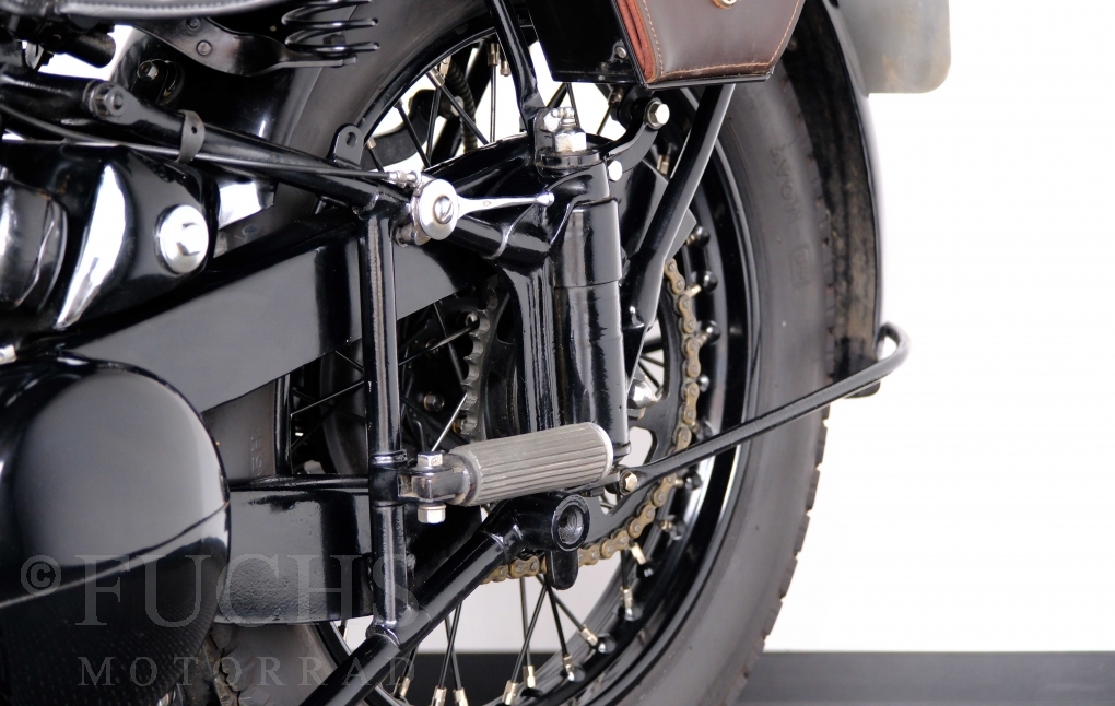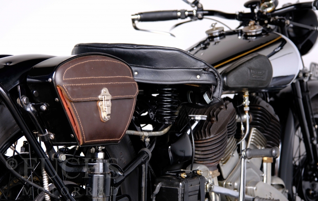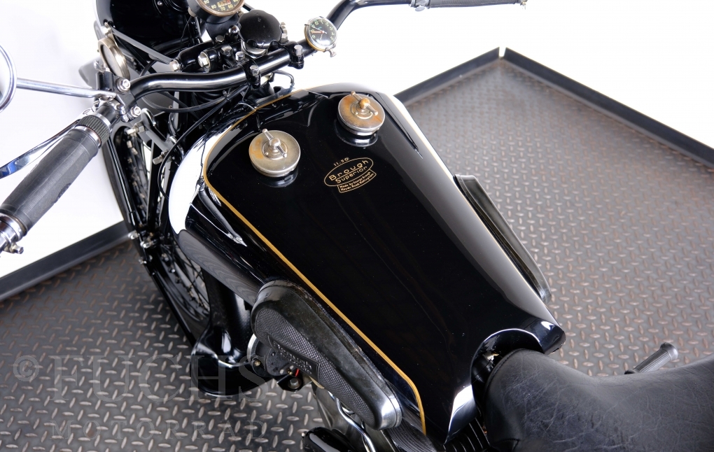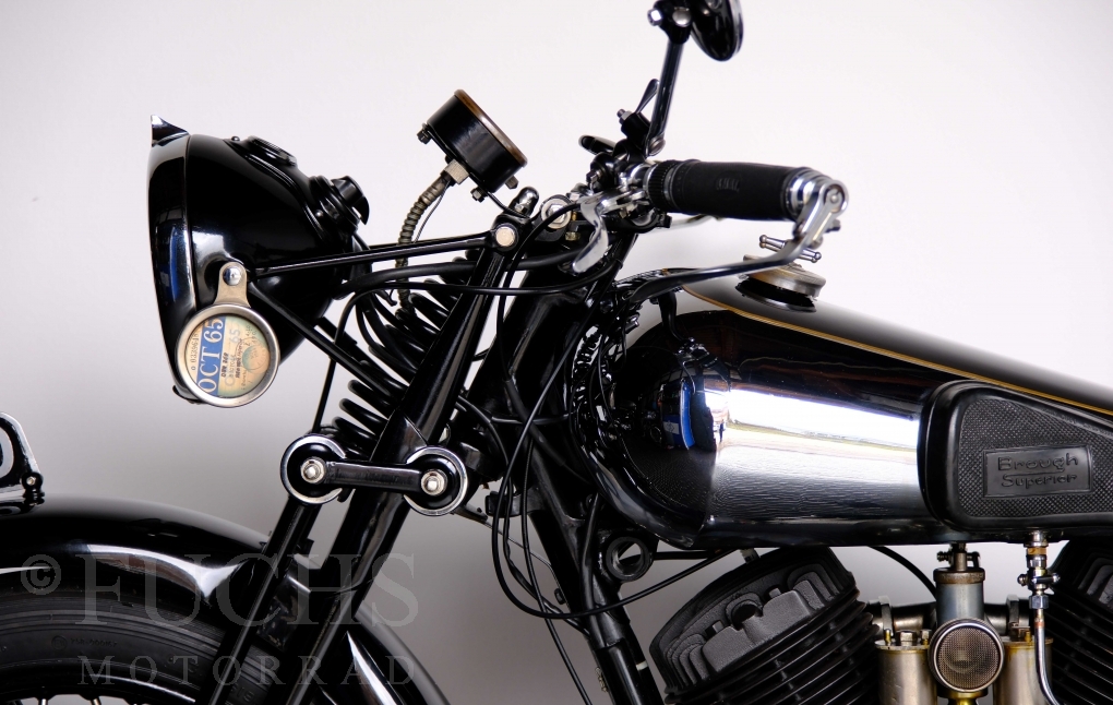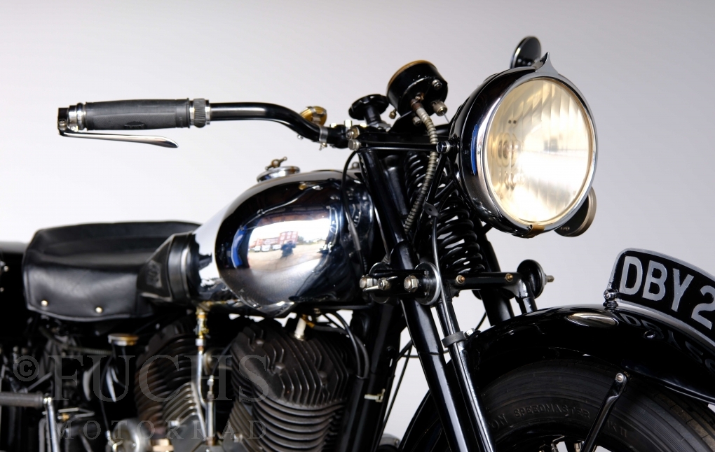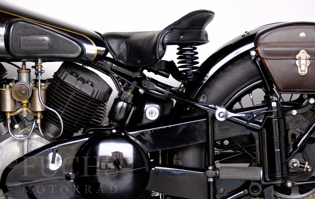In 1938, Brough Superior completed the development of the plunger frame, and our 11-50 is one of the first motorcycles to have been delivered with this suspension system. A maximum of 10 Brough 11-50s were ever built with plunger suspension. The first-class quality of this Brough is complemented by a full restoration of the chassis and engine. A glance at the works record card confirms that we are dealing with matching numbers. This first-class collector’s item has been admired and awarded prizes at various events in recent years. We will deliver the Brough Superior ready to ride. We have german registration papers.