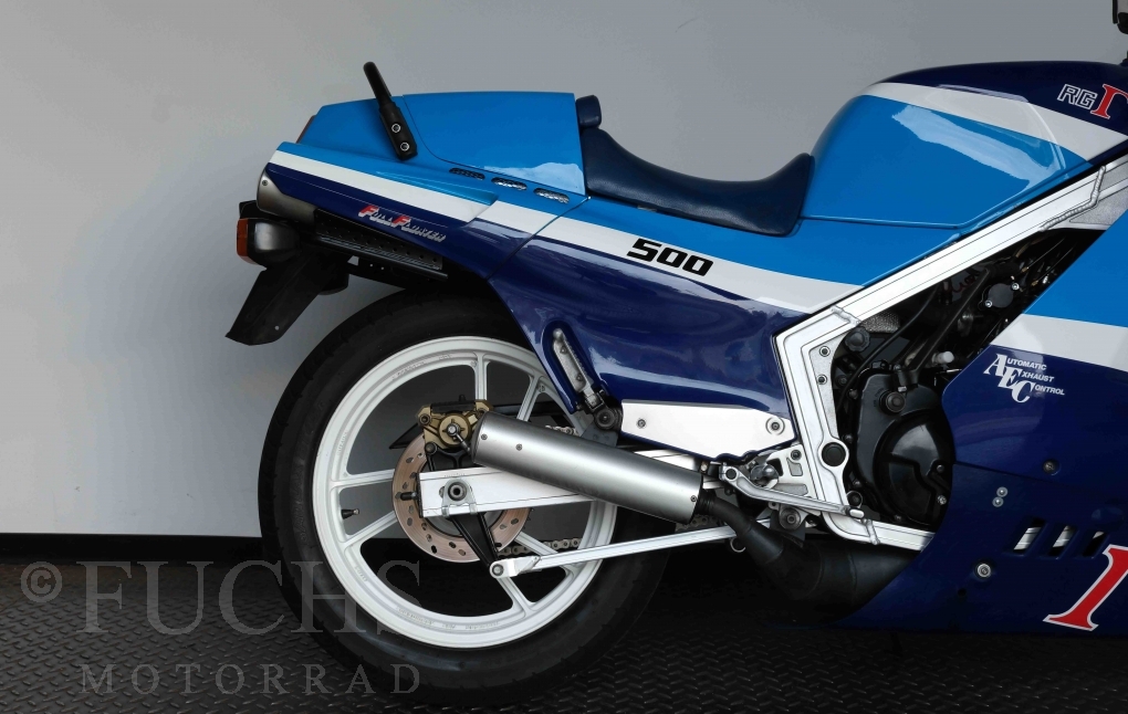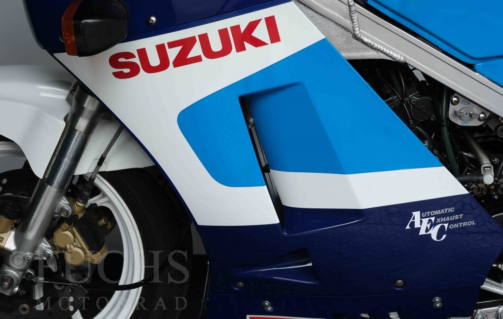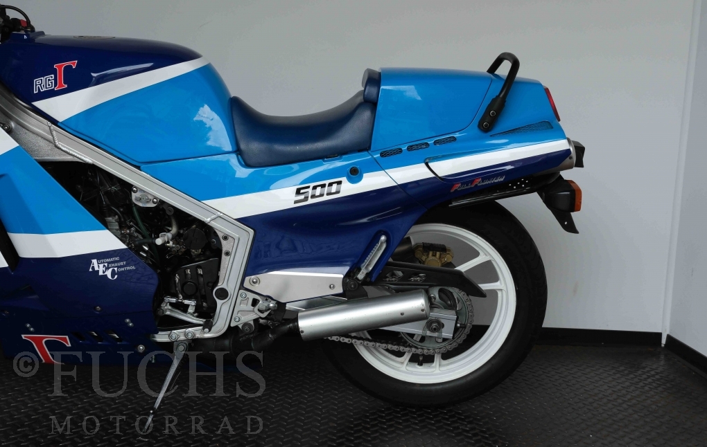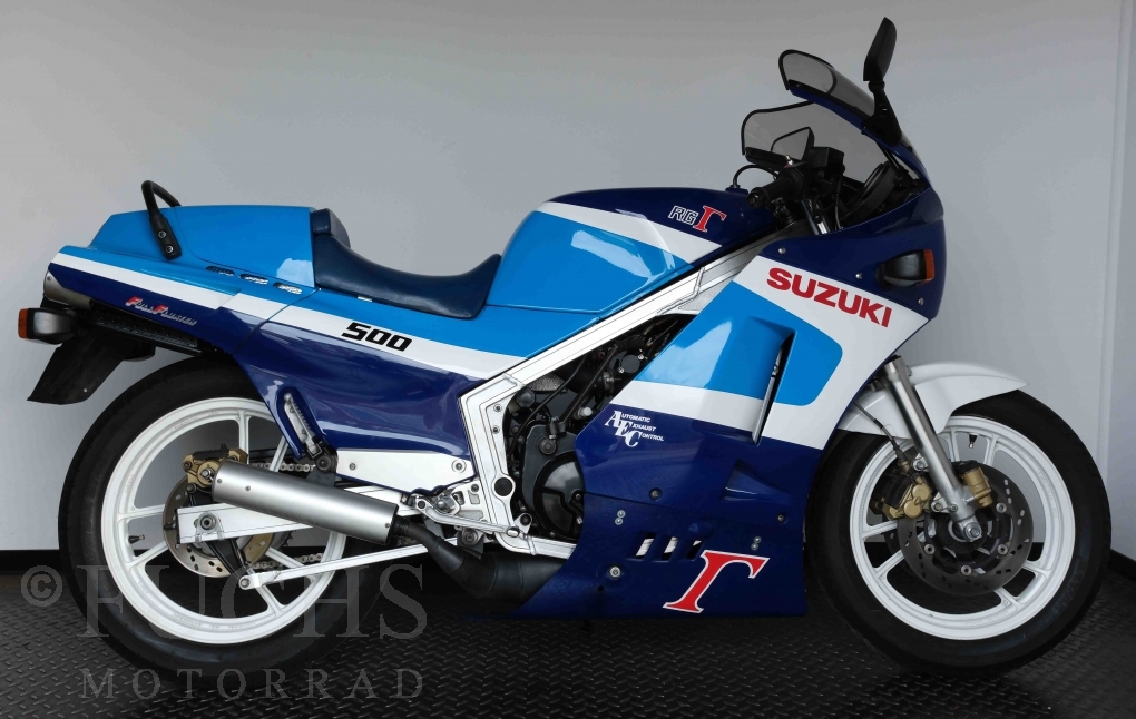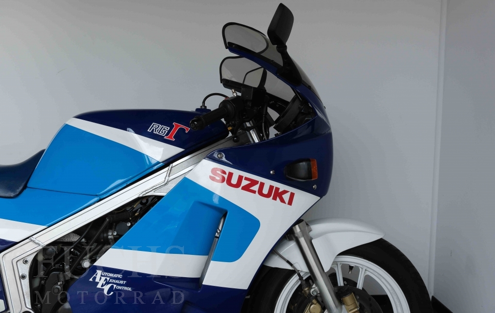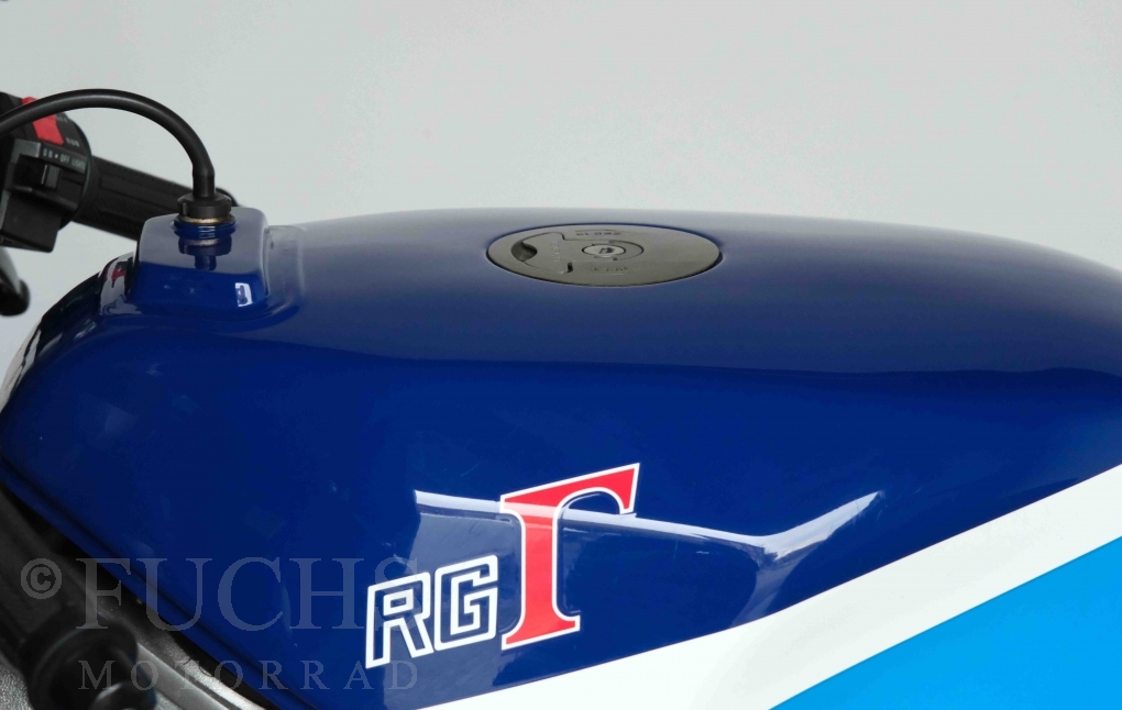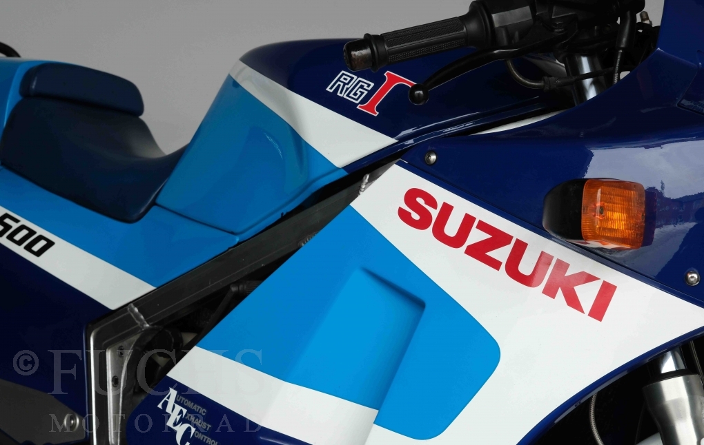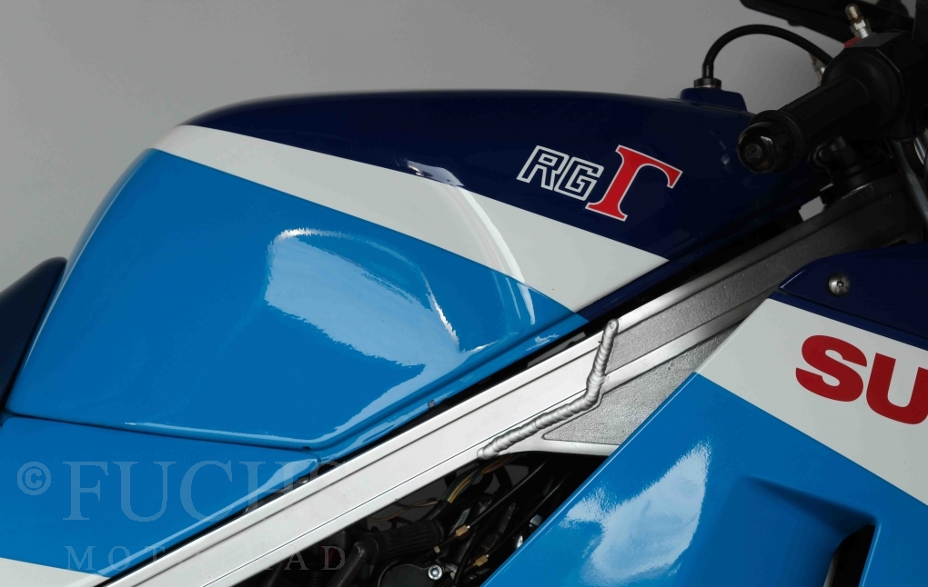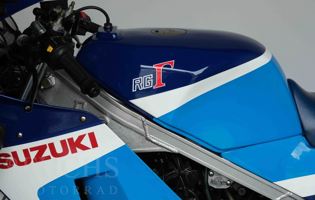 Im Jahr 1984 war die Weltpremiere der Suzuki RG 500. Unsere RG 500 entspricht dem Modelljahr 1987. Das sogenannte H-Modell hat die zweite Evolutionsstufe (Motor und Getriebe). Zu unserer RG 500 liegt eine Dokumentation zum technischen Zustand vor. Motor, Getriebe, Vergaser und Auslasssteuerung wurden komplett revidiert.