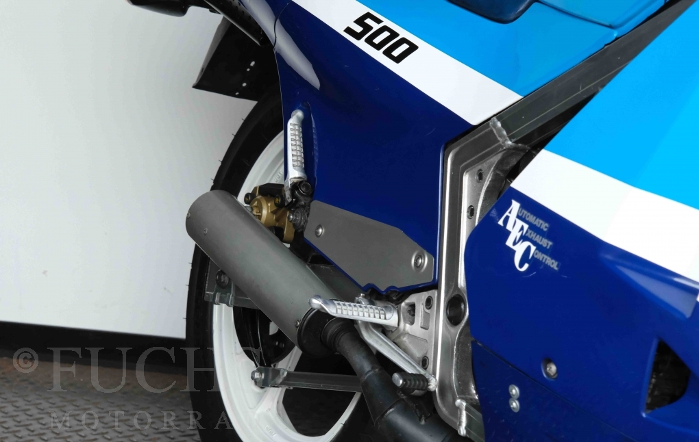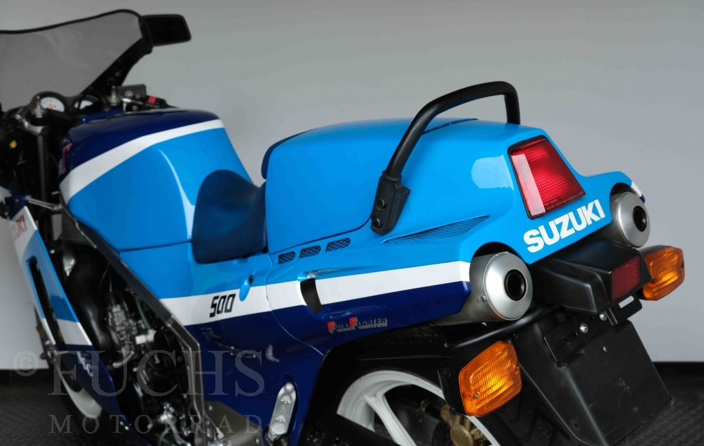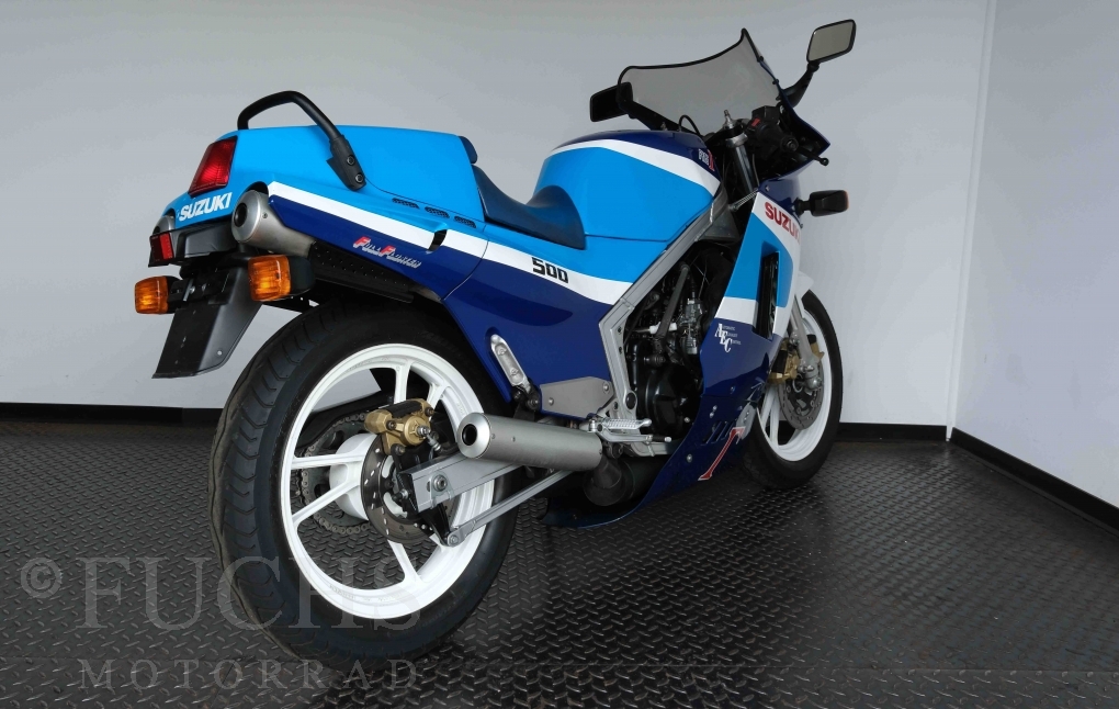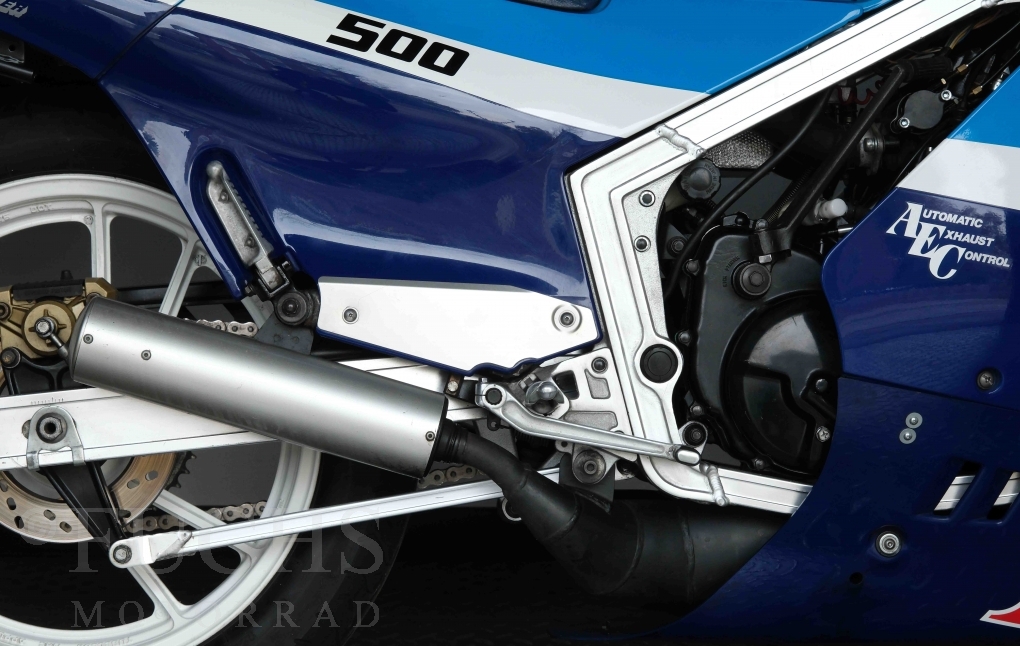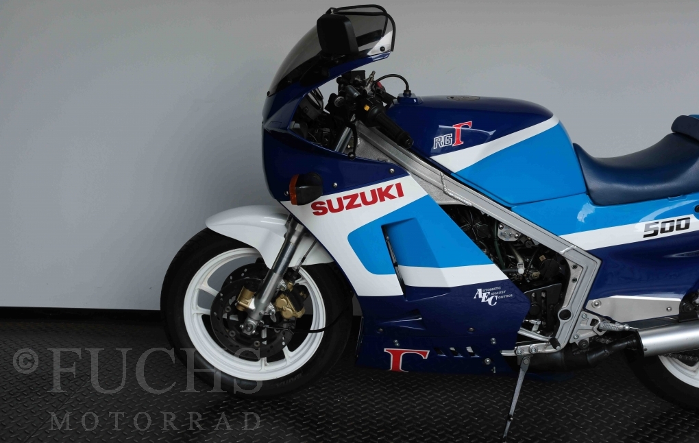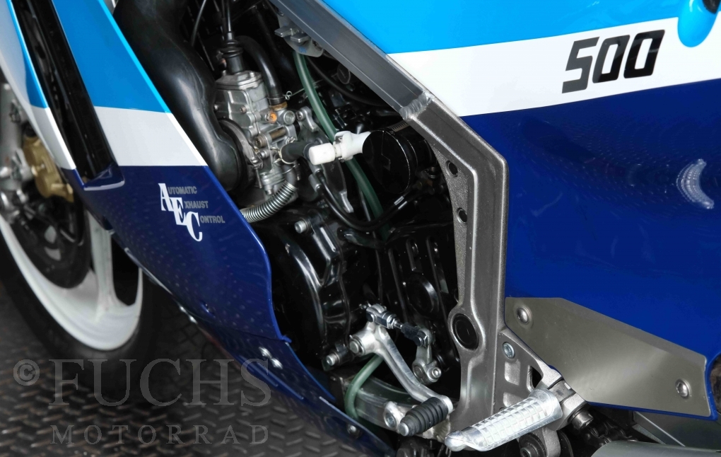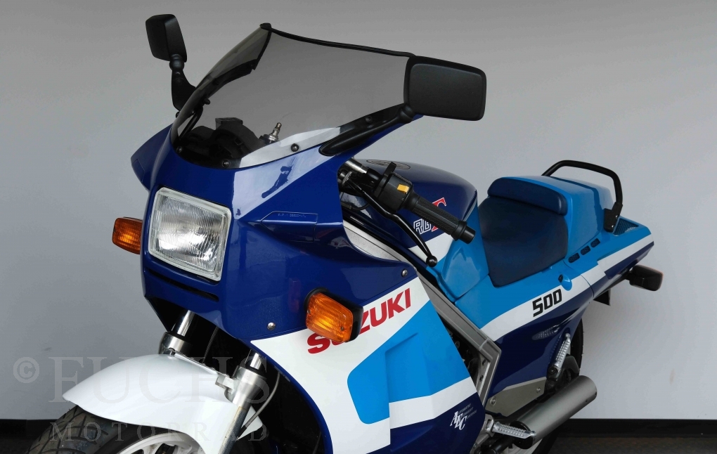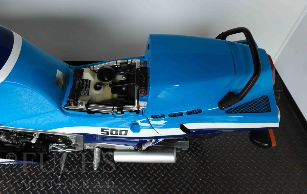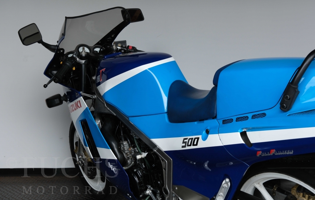 Im Jahr 1984 war die Weltpremiere der Suzuki RG 500. Unsere RG 500 entspricht dem Modelljahr 1987. Das sogenannte H-Modell hat die zweite Evolutionsstufe (Motor und Getriebe). Zu unserer RG 500 liegt eine Dokumentation zum technischen Zustand vor. Motor, Getriebe, Vergaser und Auslasssteuerung wurden komplett revidiert.