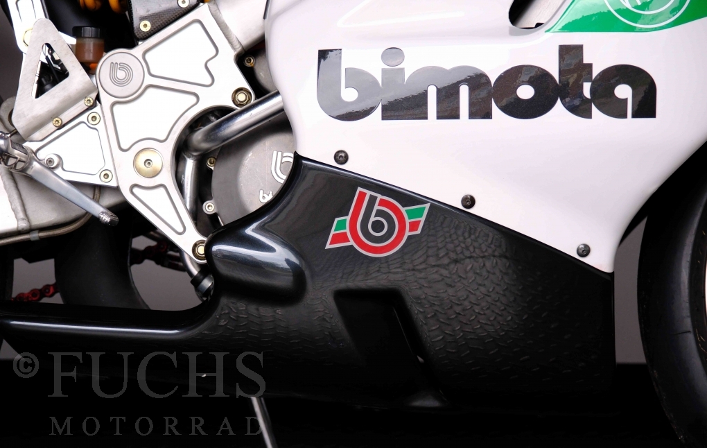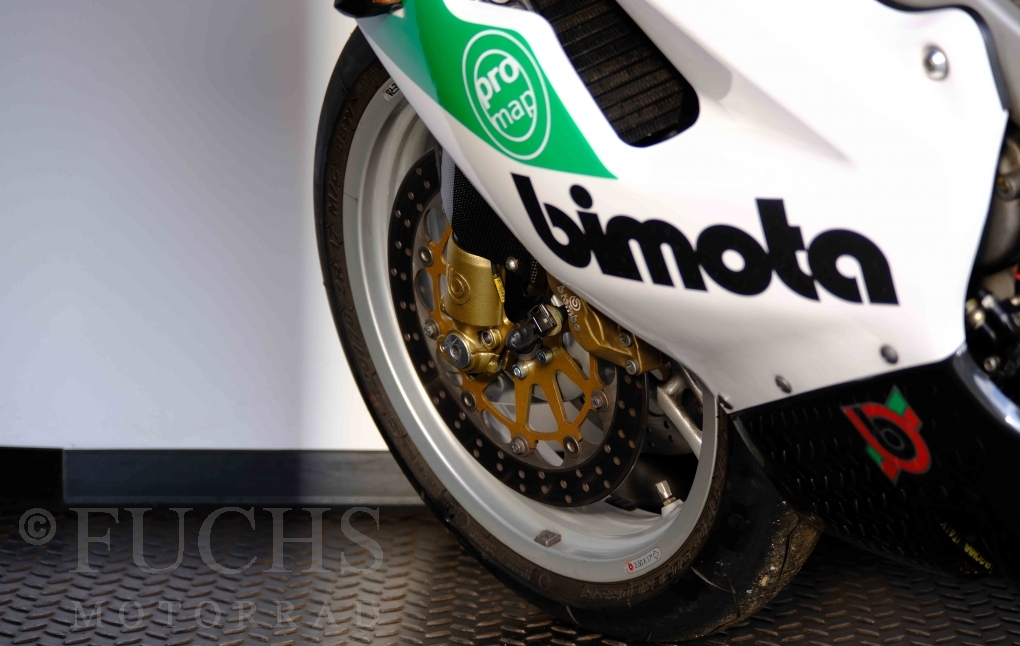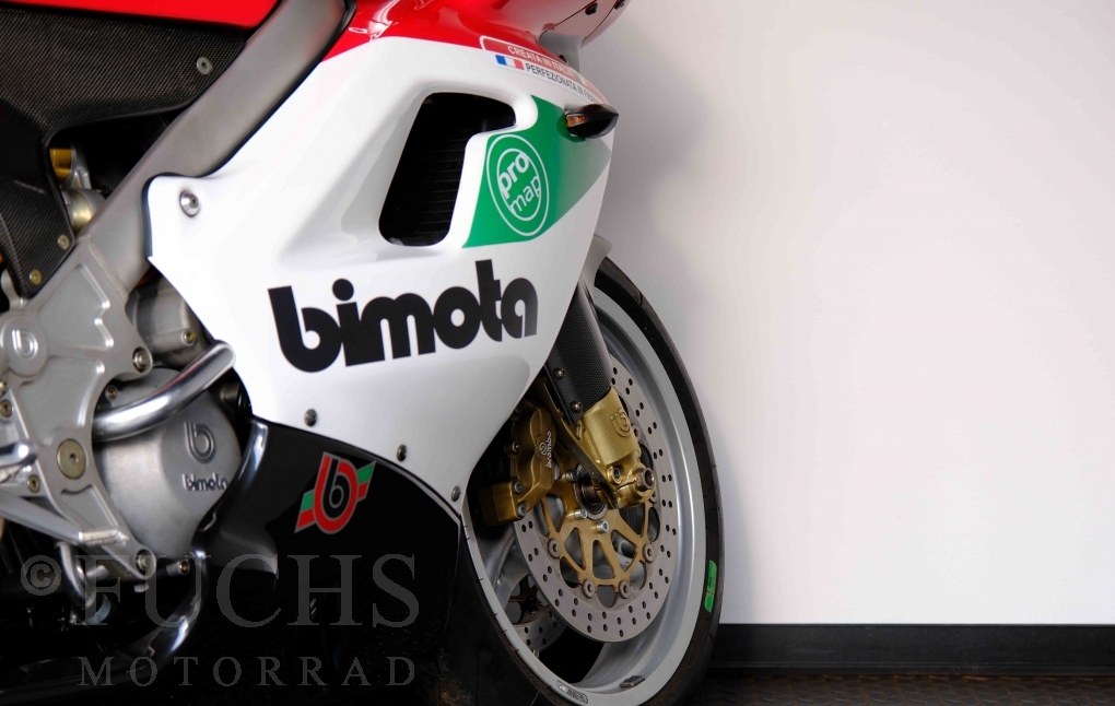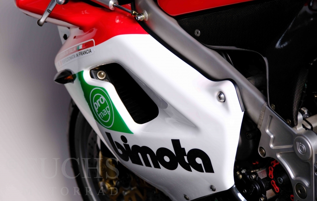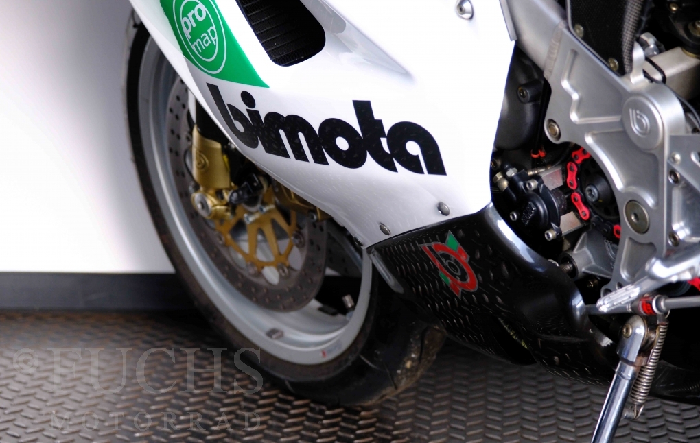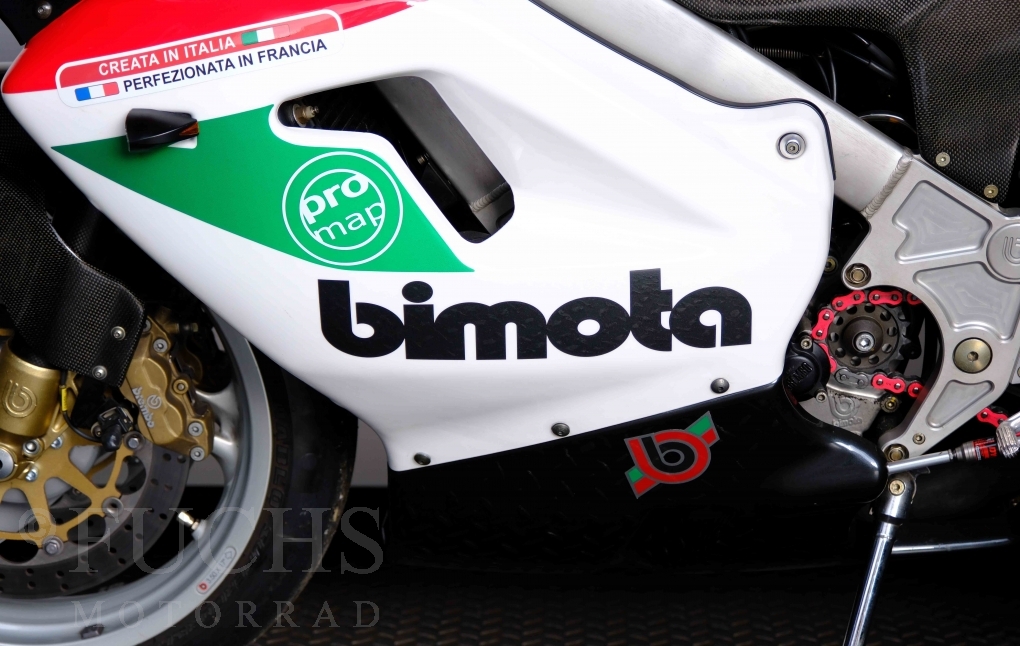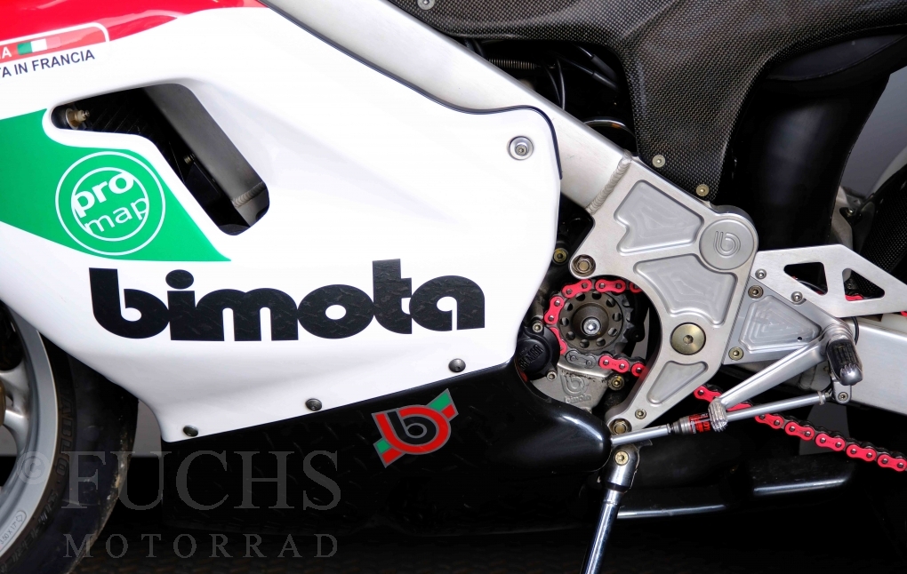 Nach mehr als 24 Jahren hat Bimota erstmals eine komplette Eigenentwicklung in den Markt gebracht. Die 500er Zweitaktmaschine war eine kleine Sensation, denn andere Hersteller hatten sich schon längst aus der Entwicklung von Zweitaktmotoren zurückgezogen. Promap mit Valerie Lecoeur setzte die Arbeit von Bimota fort und veränderte das Schmiersystem der Vdue und konstruierte eine indirekte Einspritzanlage. Ferner wurde die Kupplung und das Schaltwerk modifiziert. Ein modernisiertes Dashboard machen unsere VDue zu einem Zweitakter, der gefahren werden will. Wir haben französische Fahrzeugpapiere.