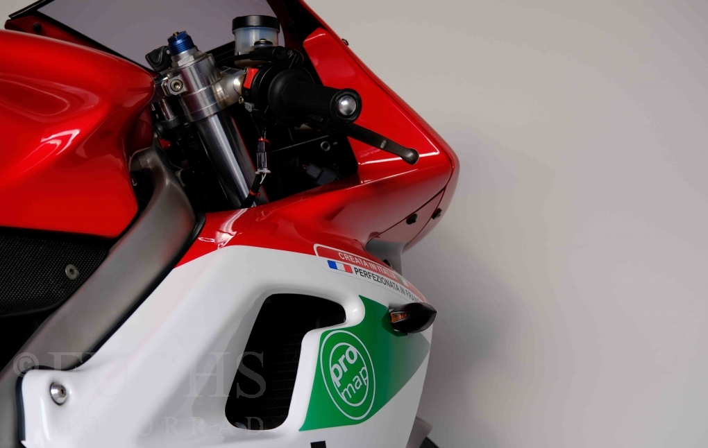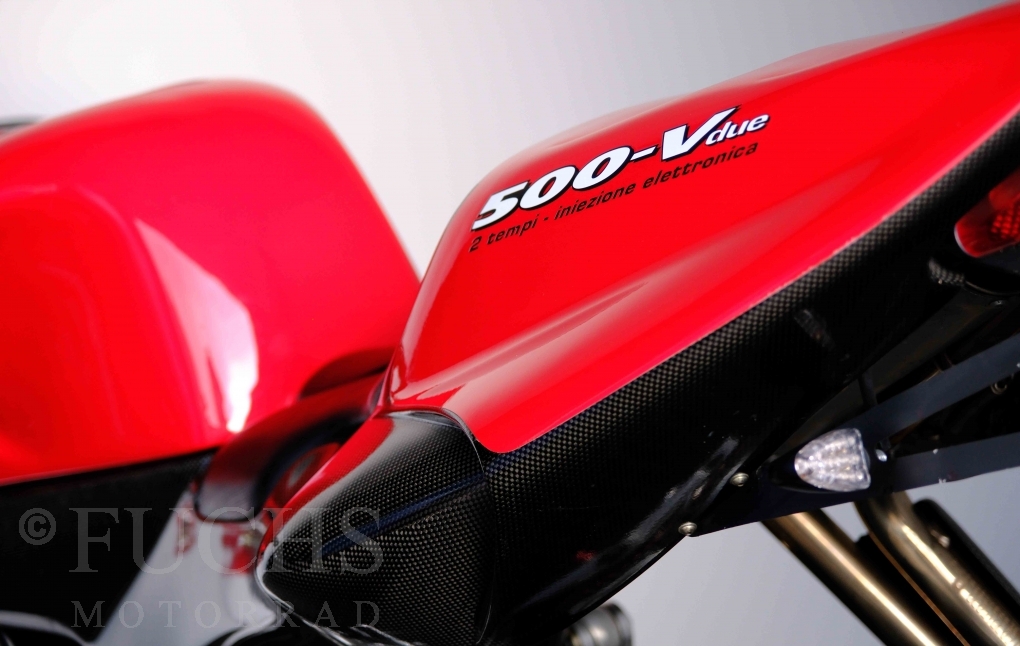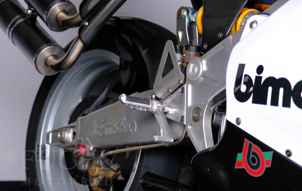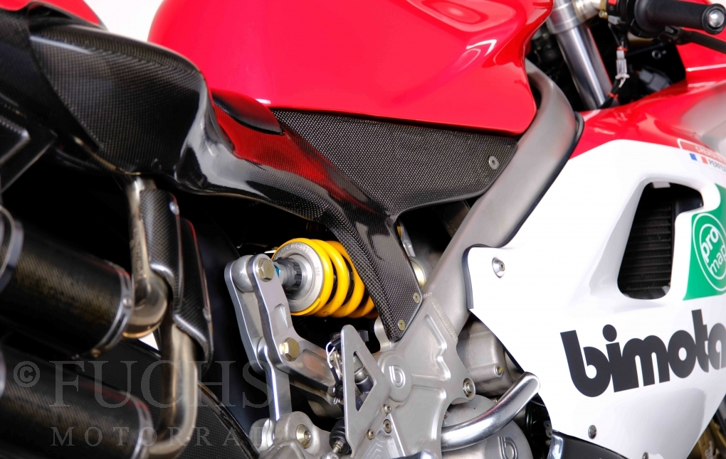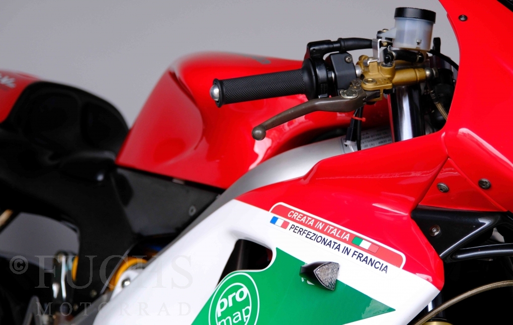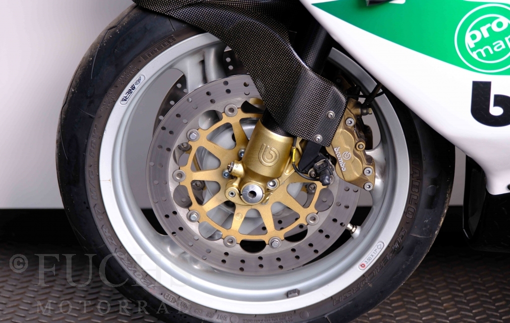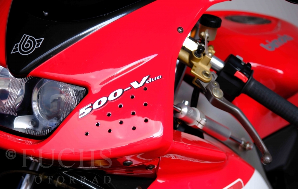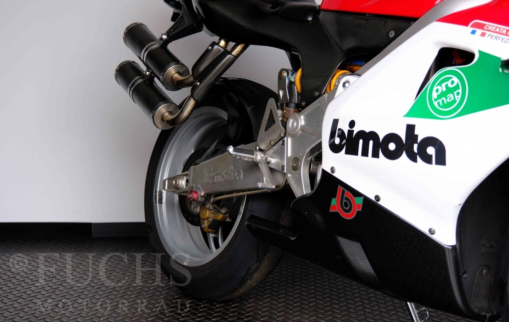 Nach mehr als 24 Jahren hat Bimota erstmals eine komplette Eigenentwicklung in den Markt gebracht. Die 500er Zweitaktmaschine war eine kleine Sensation, denn andere Hersteller hatten sich schon längst aus der Entwicklung von Zweitaktmotoren zurückgezogen. Promap mit Valerie Lecoeur setzte die Arbeit von Bimota fort und veränderte das Schmiersystem der Vdue und konstruierte eine indirekte Einspritzanlage. Ferner wurde die Kupplung und das Schaltwerk modifiziert. Ein modernisiertes Dashboard machen unsere VDue zu einem Zweitakter, der gefahren werden will. Wir haben französische Fahrzeugpapiere.