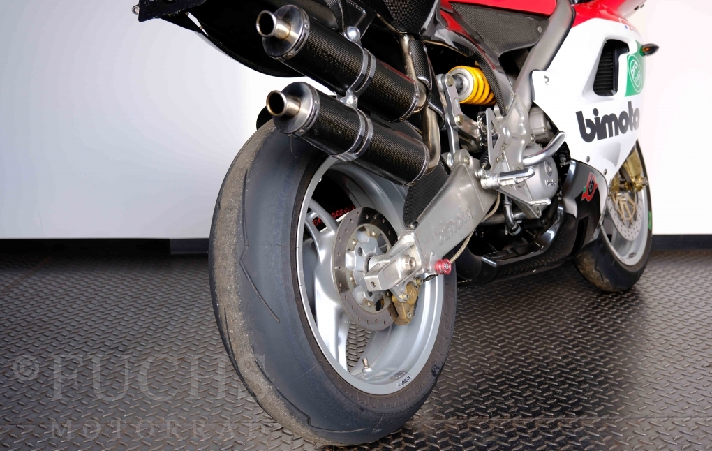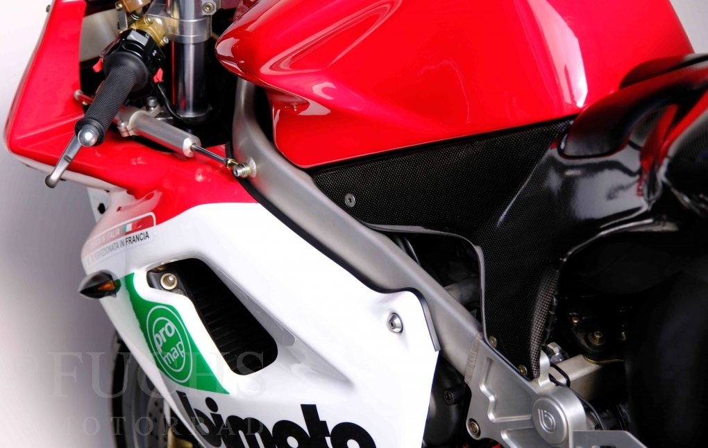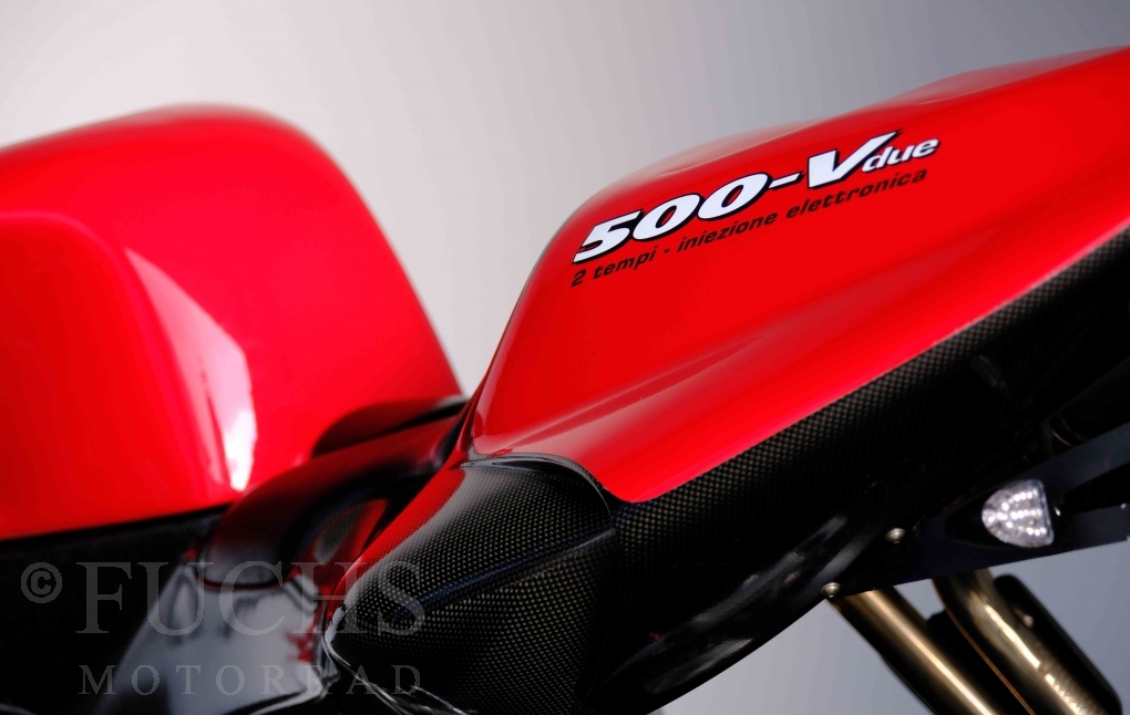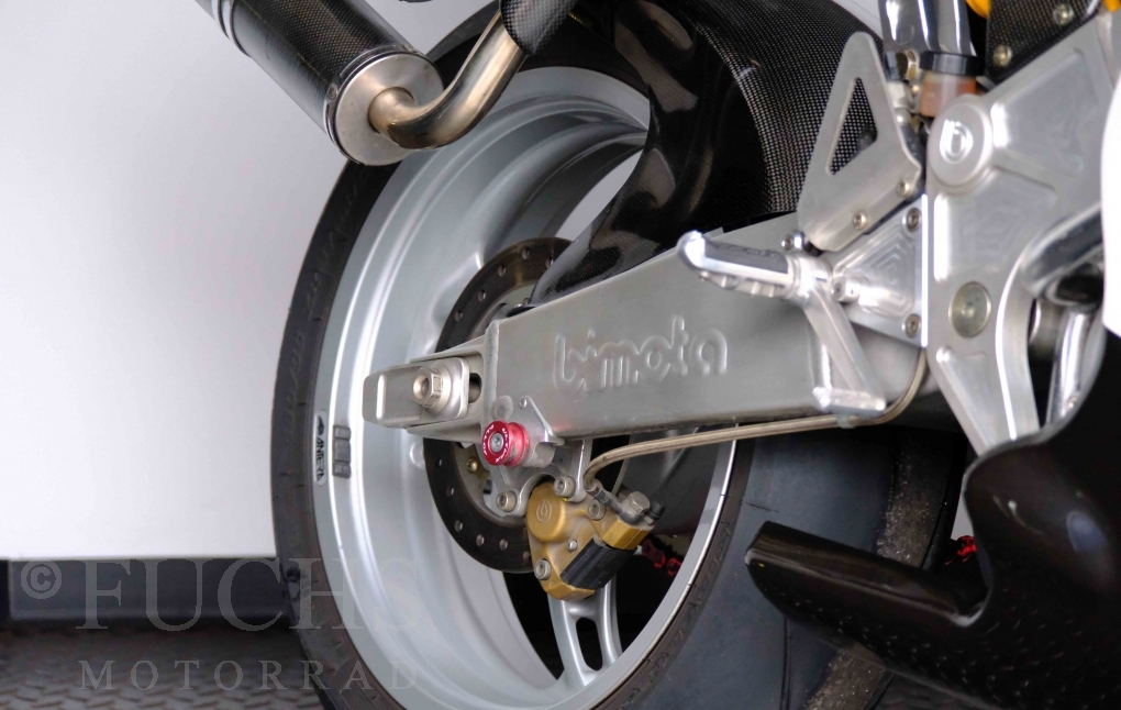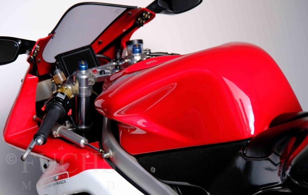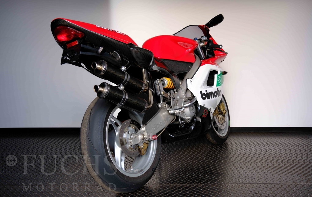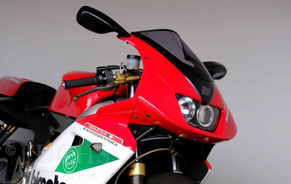 Nach mehr als 24 Jahren hat Bimota erstmals eine komplette Eigenentwicklung in den Markt gebracht. Die 500er Zweitaktmaschine war eine kleine Sensation, denn andere Hersteller hatten sich schon längst aus der Entwicklung von Zweitaktmotoren zurückgezogen. Promap mit Valerie Lecoeur setzte die Arbeit von Bimota fort und veränderte das Schmiersystem der Vdue und konstruierte eine indirekte Einspritzanlage. Ferner wurde die Kupplung und das Schaltwerk modifiziert. Ein modernisiertes Dashboard machen unsere VDue zu einem Zweitakter, der gefahren werden will. Wir haben französische Fahrzeugpapiere.