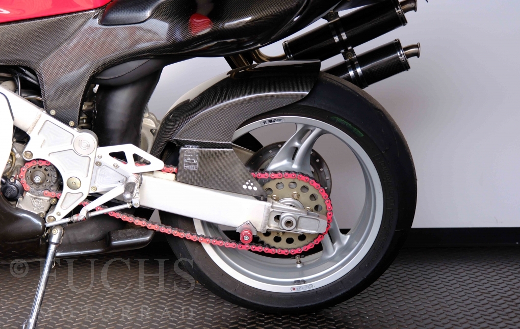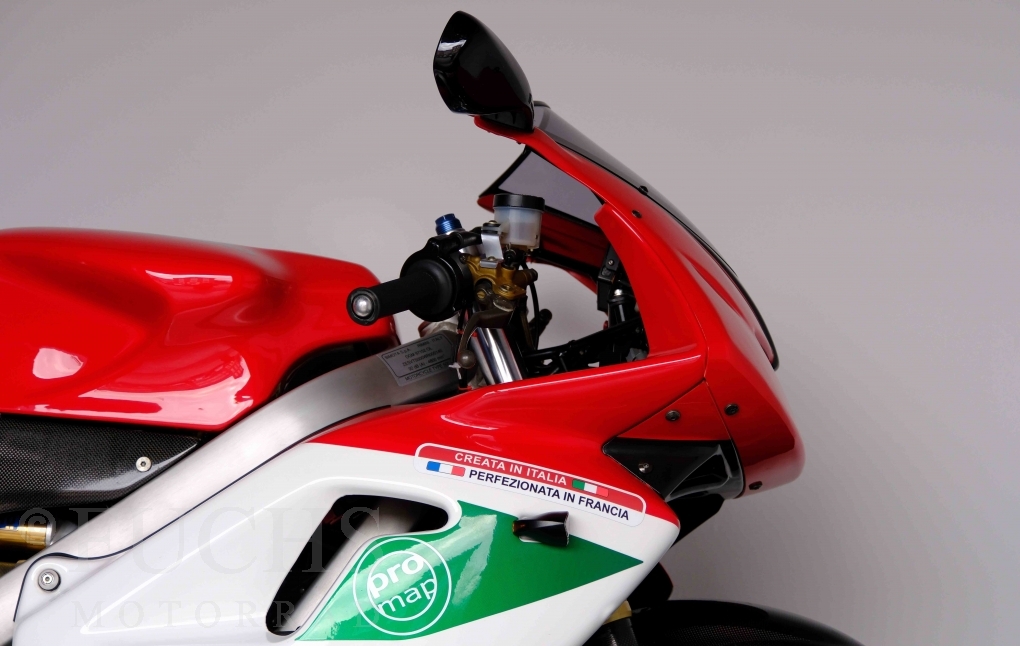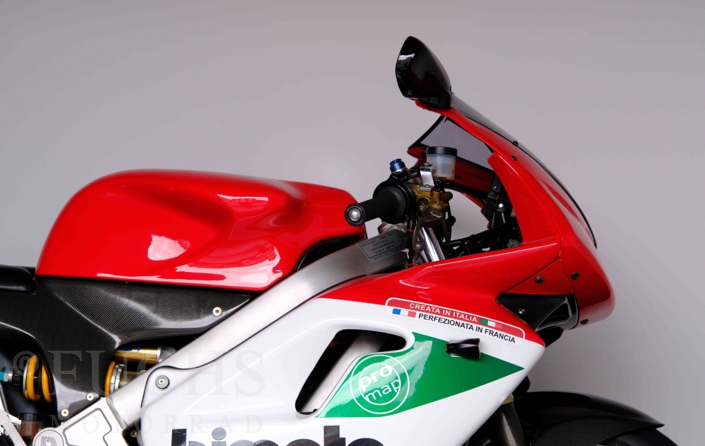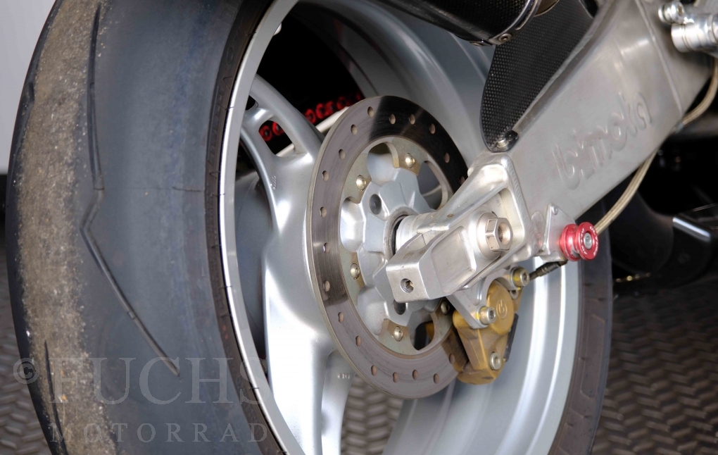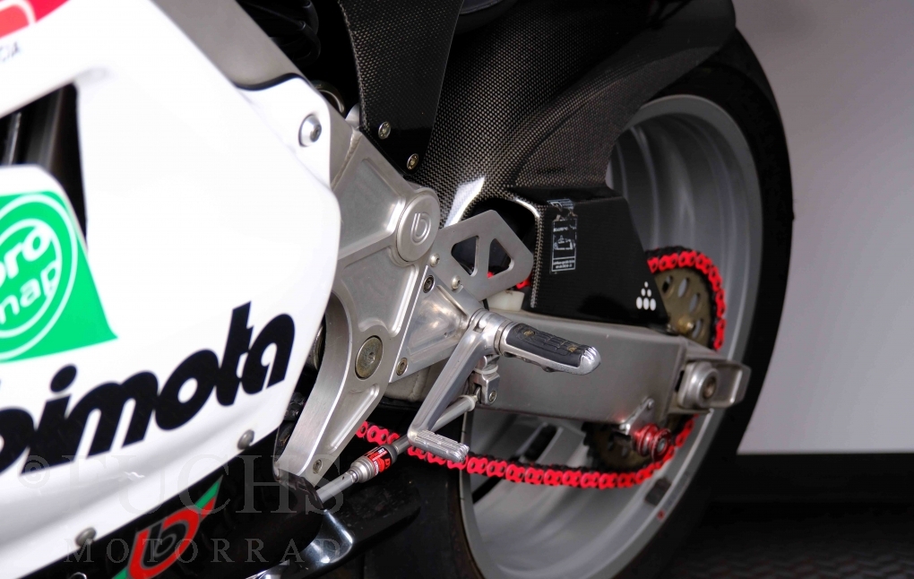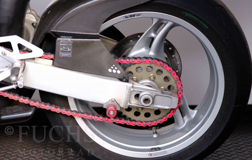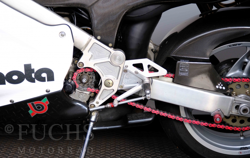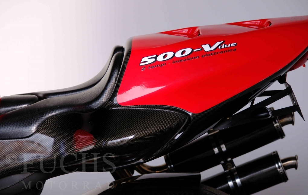 Nach mehr als 24 Jahren hat Bimota erstmals eine komplette Eigenentwicklung in den Markt gebracht. Die 500er Zweitaktmaschine war eine kleine Sensation, denn andere Hersteller hatten sich schon längst aus der Entwicklung von Zweitaktmotoren zurückgezogen. Promap mit Valerie Lecoeur setzte die Arbeit von Bimota fort und veränderte das Schmiersystem der Vdue und konstruierte eine indirekte Einspritzanlage. Ferner wurde die Kupplung und das Schaltwerk modifiziert. Ein modernisiertes Dashboard machen unsere VDue zu einem Zweitakter, der gefahren werden will. Wir haben französische Fahrzeugpapiere.