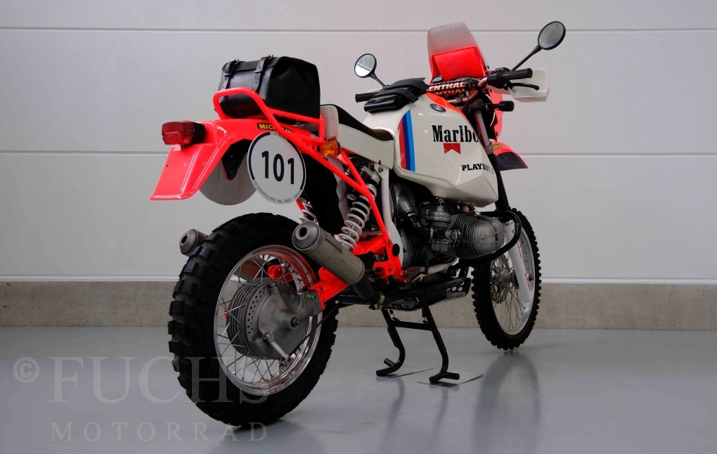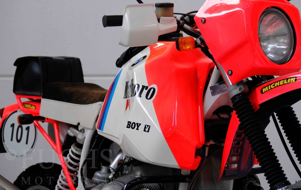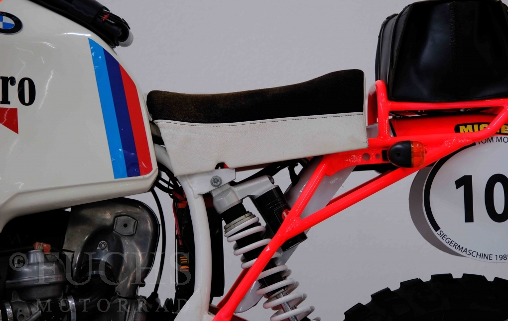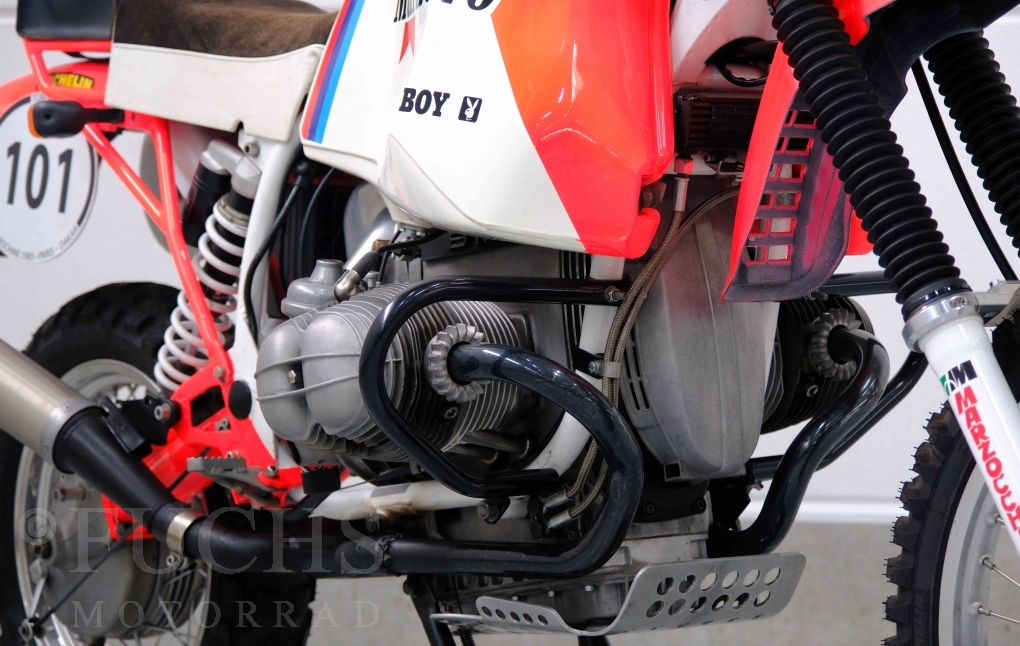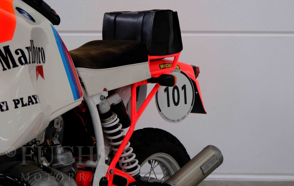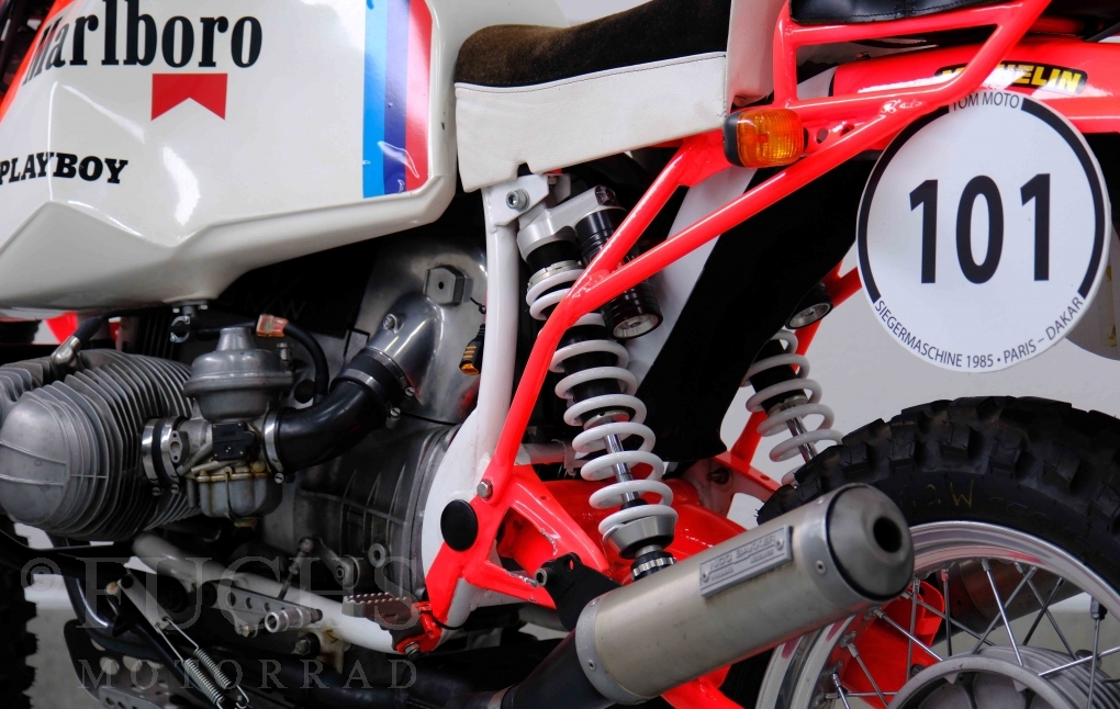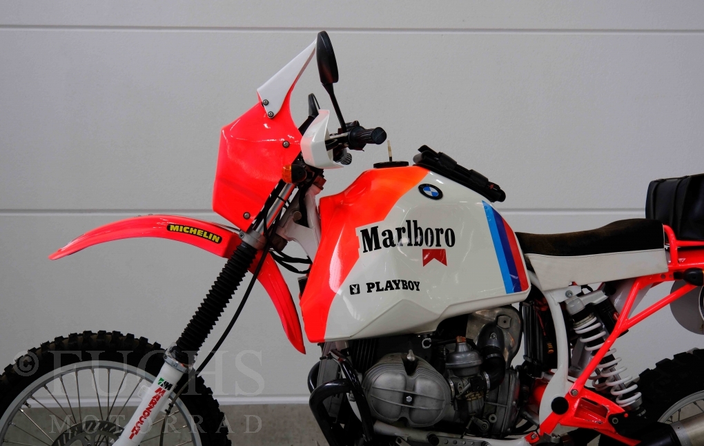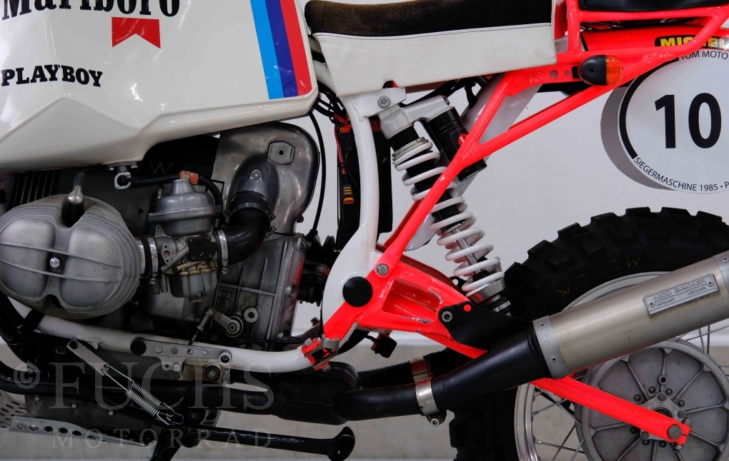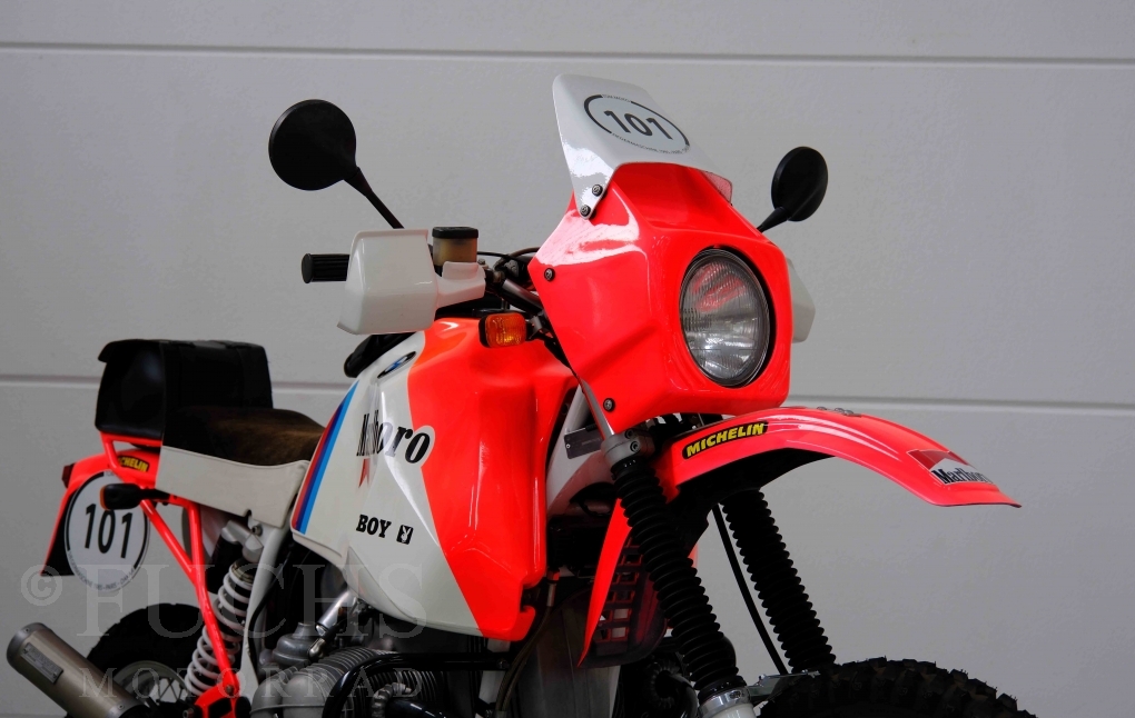 Im Jahr 1978 hat Thierry Sabine die Rallye Paris Dakar initiiert. Mit einer Distanz von 10.000 km war es mehr als nur ein Abendteuer für Mensch und Maschine. BMW hat mit der R 80 G/S erstmals 1981 teilgenommen und war sofort mit Hubert Auriol erfolgreich. Im Jahr 1985 hat Gaston Rahier die Rallye gewonnen. Wie häufig im Rennsport sind die entwickelten Fahrzeuge eine Augenweide und die R 80 G/S Paris-Dakar aus dem Jahr 1985 zählt auf jeden Fall dazu. Unsere BMW stammt aus einer kleinen Serie, die von einem findigen Mechaniker aufgebaut wurde. Der Neuaufbau umfasst die Überholung vom Motor und die Bearbeitung vom Fahrwerk und Einbau der Komponenten wie eine verlängerte Schwinge, Marzocchi Gabel, Brembo Bremsanlage, Excel Speichenräder und weiterer Details, die dazu dienen sollen, dass die Replica der originalen Wettbewerbsmaschine entspricht. Zu dieser Replica 1985 liegen deutsche Fahrzeugpapiere vor.