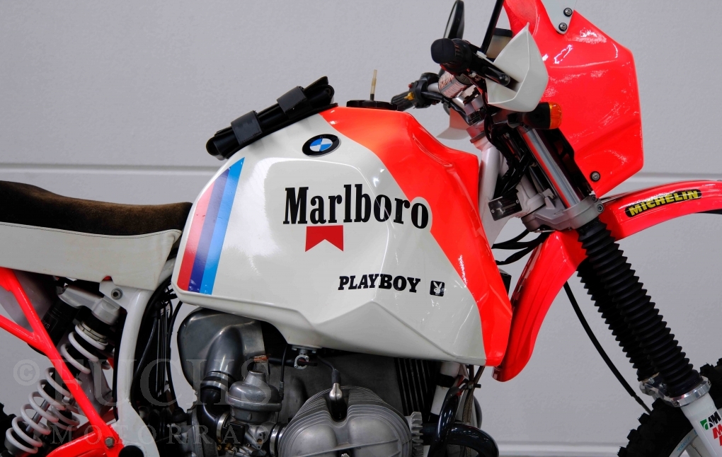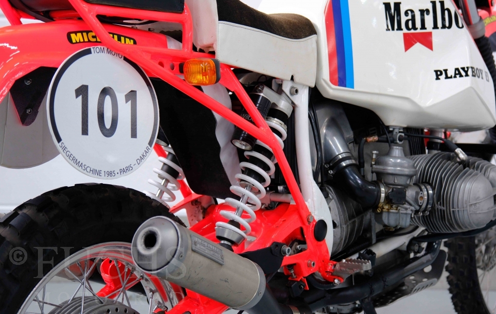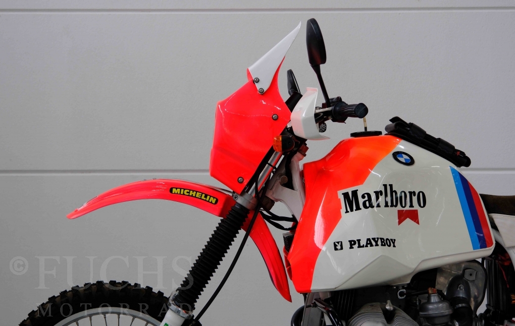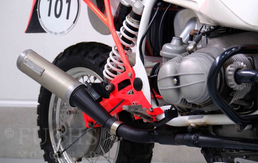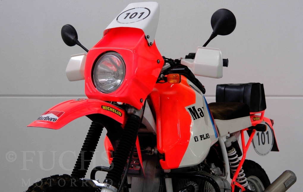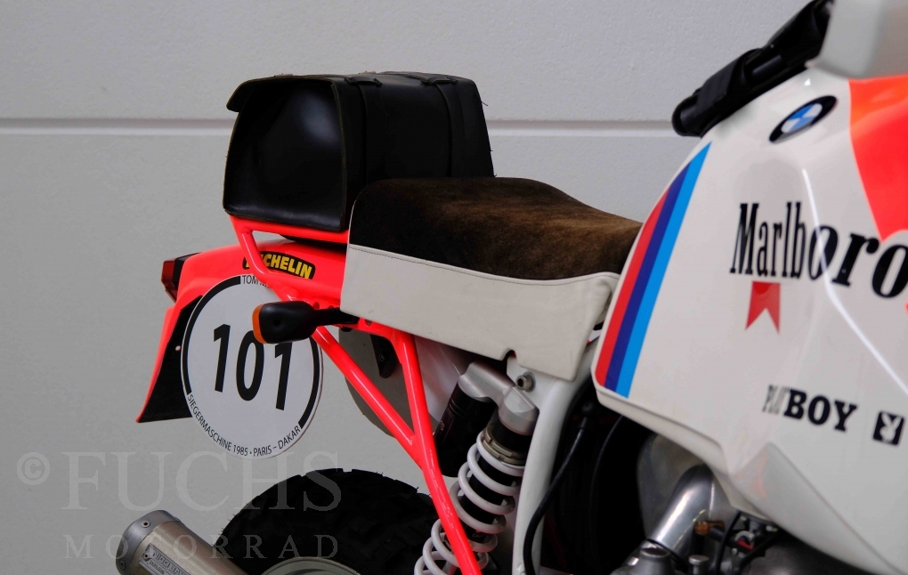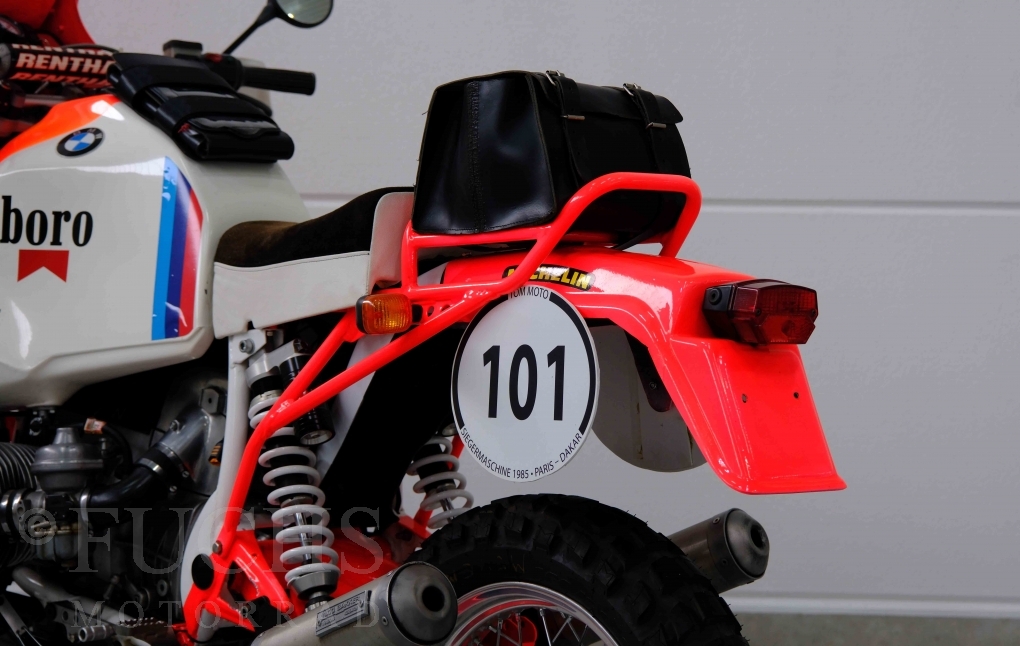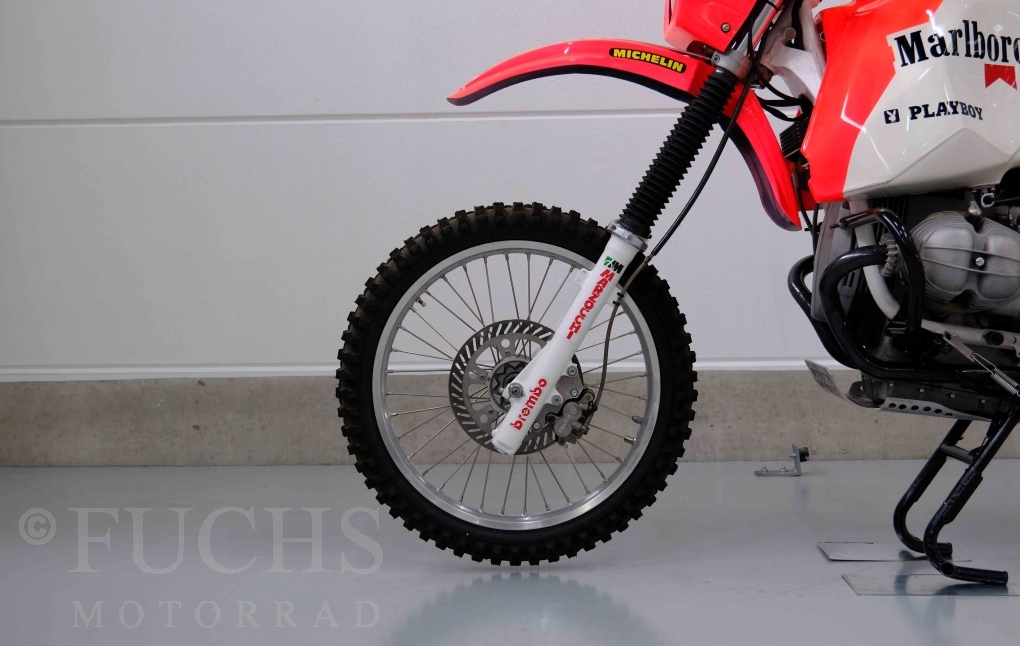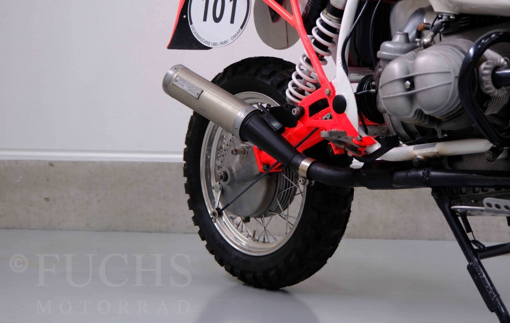 Im Jahr 1978 hat Thierry Sabine die Rallye Paris Dakar initiiert. Mit einer Distanz von 10.000 km war es mehr als nur ein Abendteuer für Mensch und Maschine. BMW hat mit der R 80 G/S erstmals 1981 teilgenommen und war sofort mit Hubert Auriol erfolgreich. Im Jahr 1985 hat Gaston Rahier die Rallye gewonnen. Wie häufig im Rennsport sind die entwickelten Fahrzeuge eine Augenweide und die R 80 G/S Paris-Dakar aus dem Jahr 1985 zählt auf jeden Fall dazu. Unsere BMW stammt aus einer kleinen Serie, die von einem findigen Mechaniker aufgebaut wurde. Der Neuaufbau umfasst die Überholung vom Motor und die Bearbeitung vom Fahrwerk und Einbau der Komponenten wie eine verlängerte Schwinge, Marzocchi Gabel, Brembo Bremsanlage, Excel Speichenräder und weiterer Details, die dazu dienen sollen, dass die Replica der originalen Wettbewerbsmaschine entspricht. Zu dieser Replica 1985 liegen deutsche Fahrzeugpapiere vor.