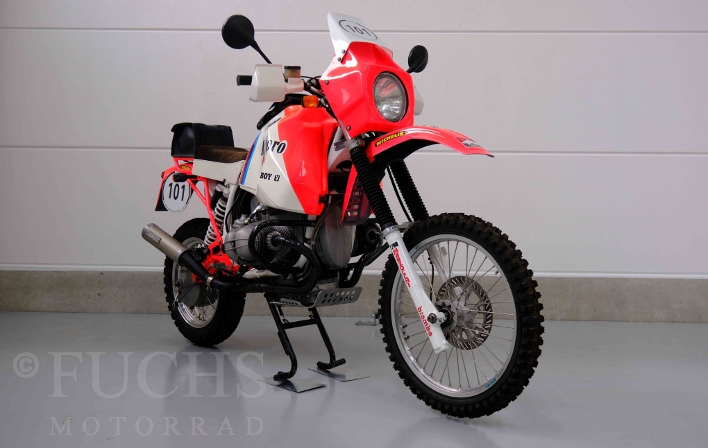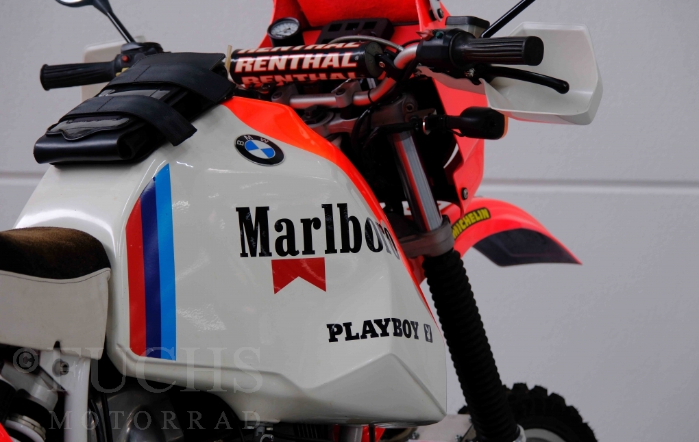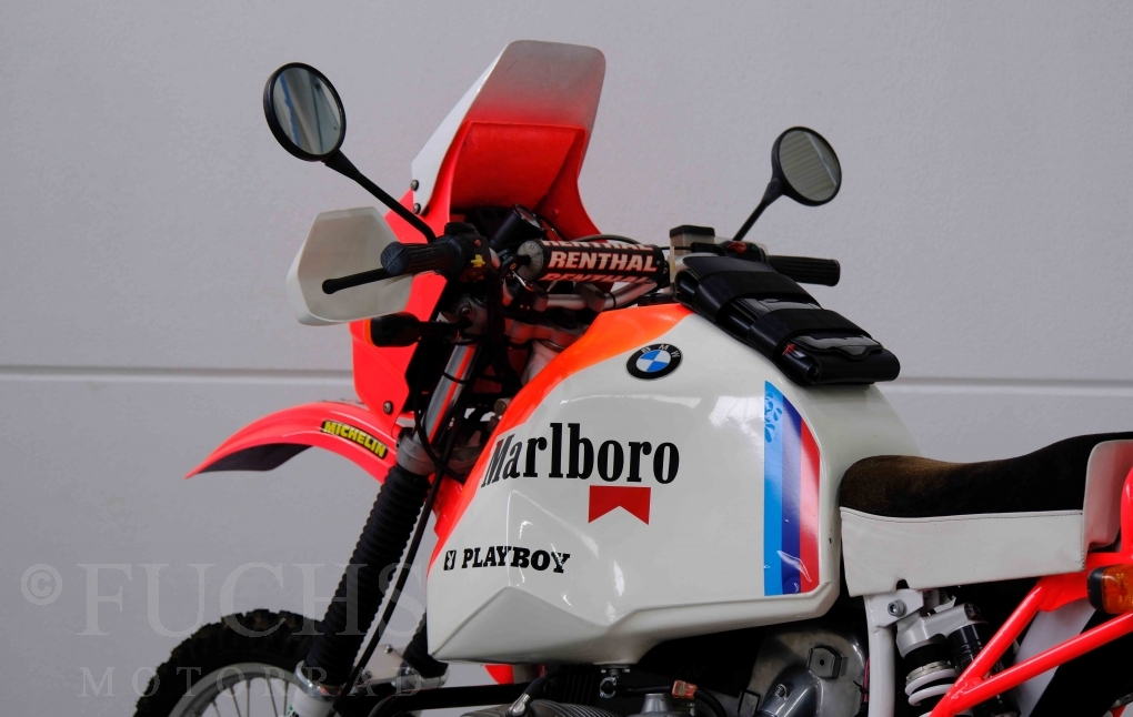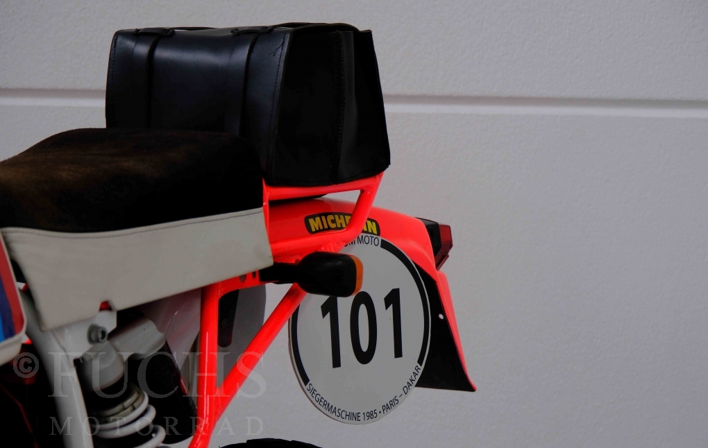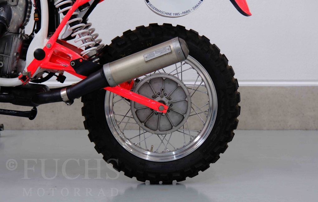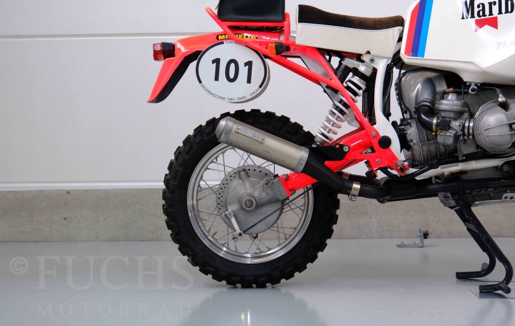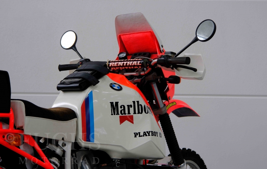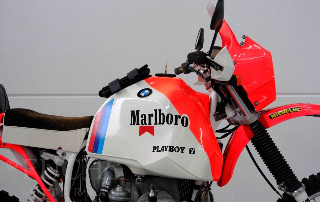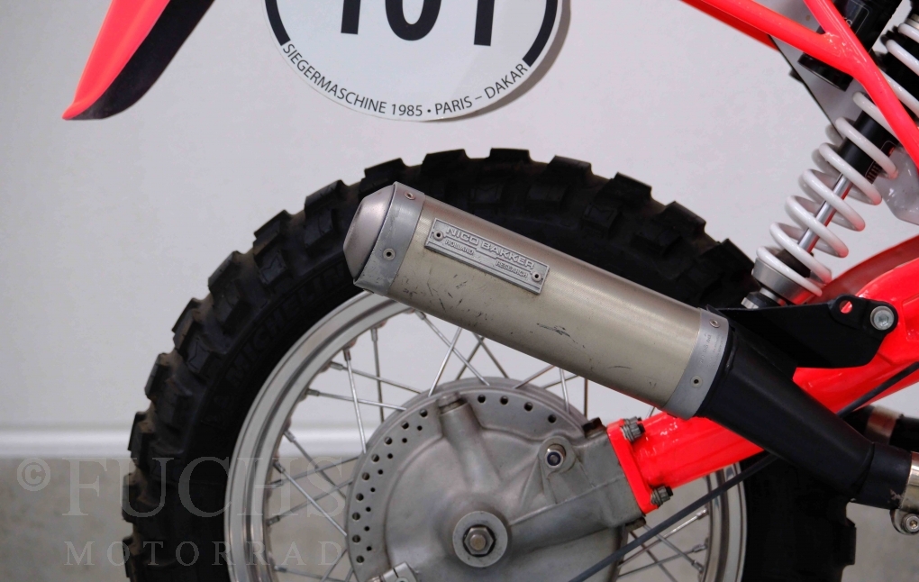 Im Jahr 1978 hat Thierry Sabine die Rallye Paris Dakar initiiert. Mit einer Distanz von 10.000 km war es mehr als nur ein Abendteuer für Mensch und Maschine. BMW hat mit der R 80 G/S erstmals 1981 teilgenommen und war sofort mit Hubert Auriol erfolgreich. Im Jahr 1985 hat Gaston Rahier die Rallye gewonnen. Wie häufig im Rennsport sind die entwickelten Fahrzeuge eine Augenweide und die R 80 G/S Paris-Dakar aus dem Jahr 1985 zählt auf jeden Fall dazu. Unsere BMW stammt aus einer kleinen Serie, die von einem findigen Mechaniker aufgebaut wurde. Der Neuaufbau umfasst die Überholung vom Motor und die Bearbeitung vom Fahrwerk und Einbau der Komponenten wie eine verlängerte Schwinge, Marzocchi Gabel, Brembo Bremsanlage, Excel Speichenräder und weiterer Details, die dazu dienen sollen, dass die Replica der originalen Wettbewerbsmaschine entspricht. Zu dieser Replica 1985 liegen deutsche Fahrzeugpapiere vor.