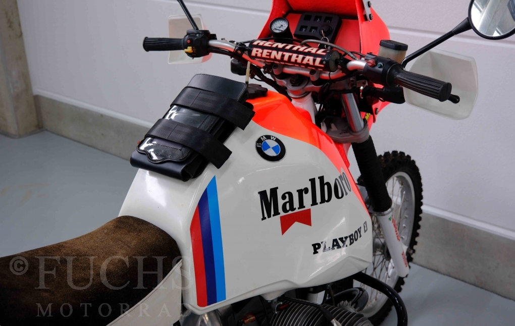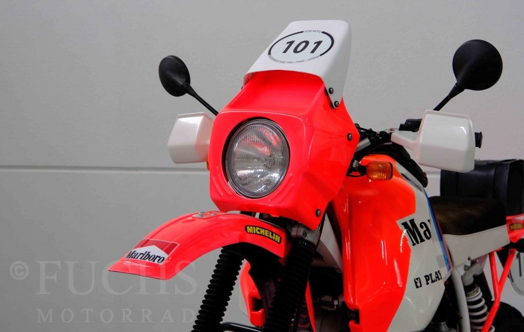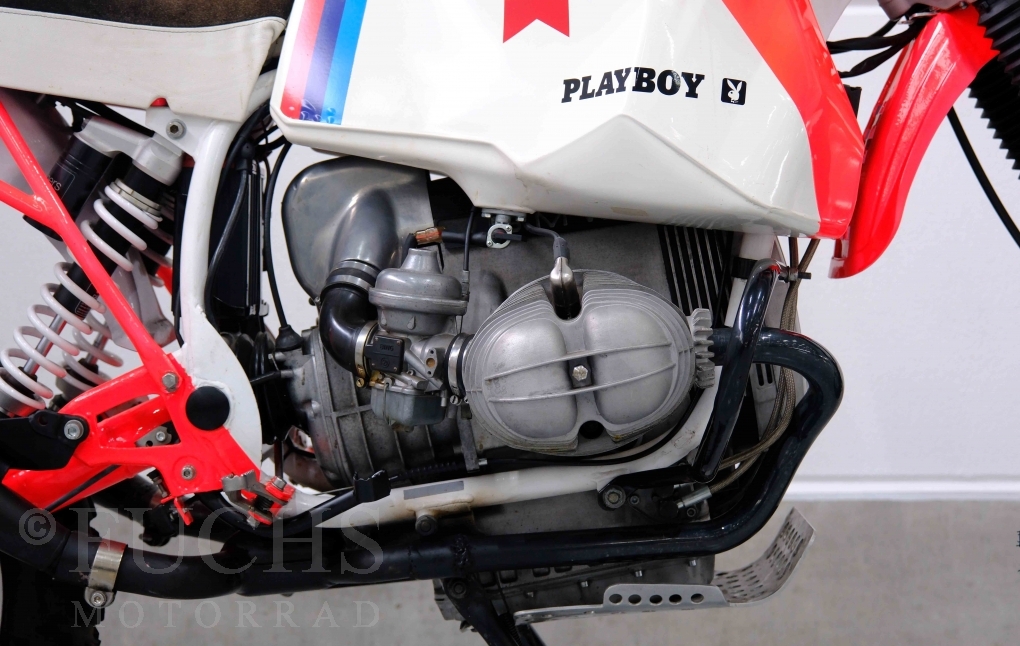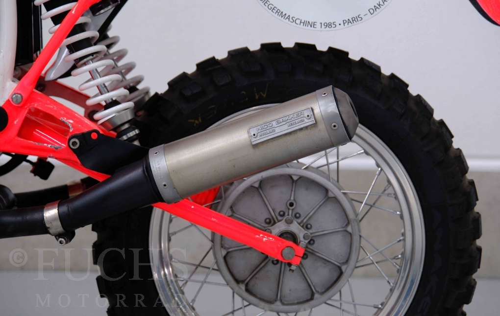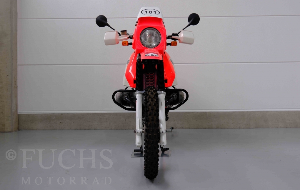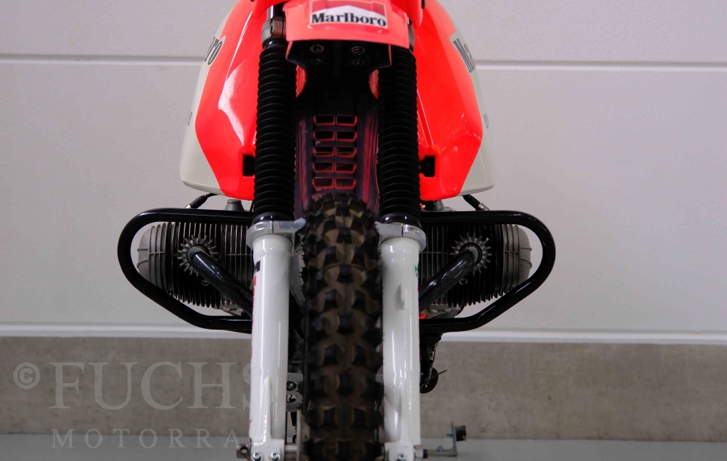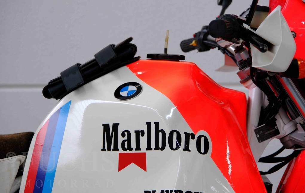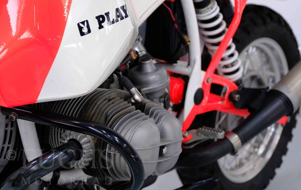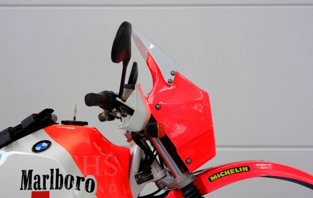 Im Jahr 1978 hat Thierry Sabine die Rallye Paris Dakar initiiert. Mit einer Distanz von 10.000 km war es mehr als nur ein Abendteuer für Mensch und Maschine. BMW hat mit der R 80 G/S erstmals 1981 teilgenommen und war sofort mit Hubert Auriol erfolgreich. Im Jahr 1985 hat Gaston Rahier die Rallye gewonnen. Wie häufig im Rennsport sind die entwickelten Fahrzeuge eine Augenweide und die R 80 G/S Paris-Dakar aus dem Jahr 1985 zählt auf jeden Fall dazu. Unsere BMW stammt aus einer kleinen Serie, die von einem findigen Mechaniker aufgebaut wurde. Der Neuaufbau umfasst die Überholung vom Motor und die Bearbeitung vom Fahrwerk und Einbau der Komponenten wie eine verlängerte Schwinge, Marzocchi Gabel, Brembo Bremsanlage, Excel Speichenräder und weiterer Details, die dazu dienen sollen, dass die Replica der originalen Wettbewerbsmaschine entspricht. Zu dieser Replica 1985 liegen deutsche Fahrzeugpapiere vor.