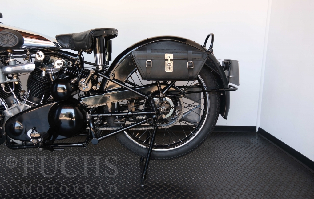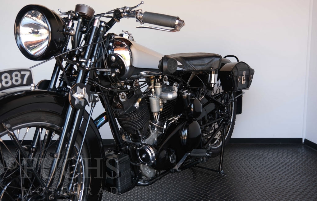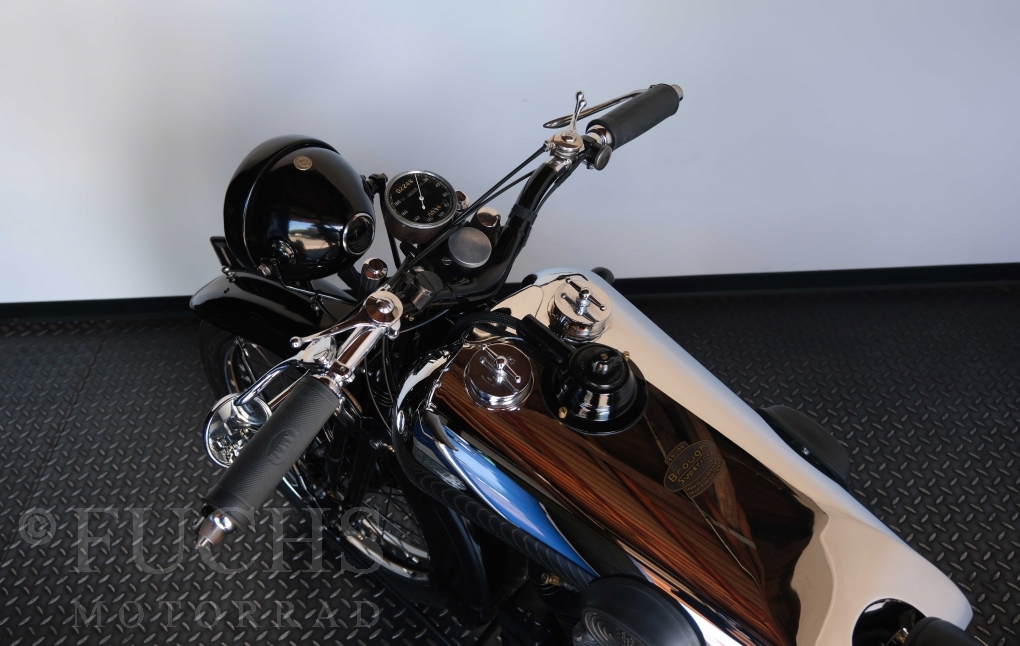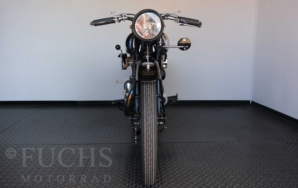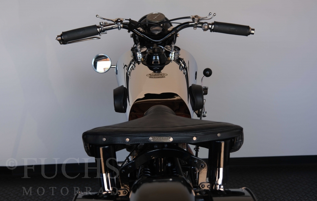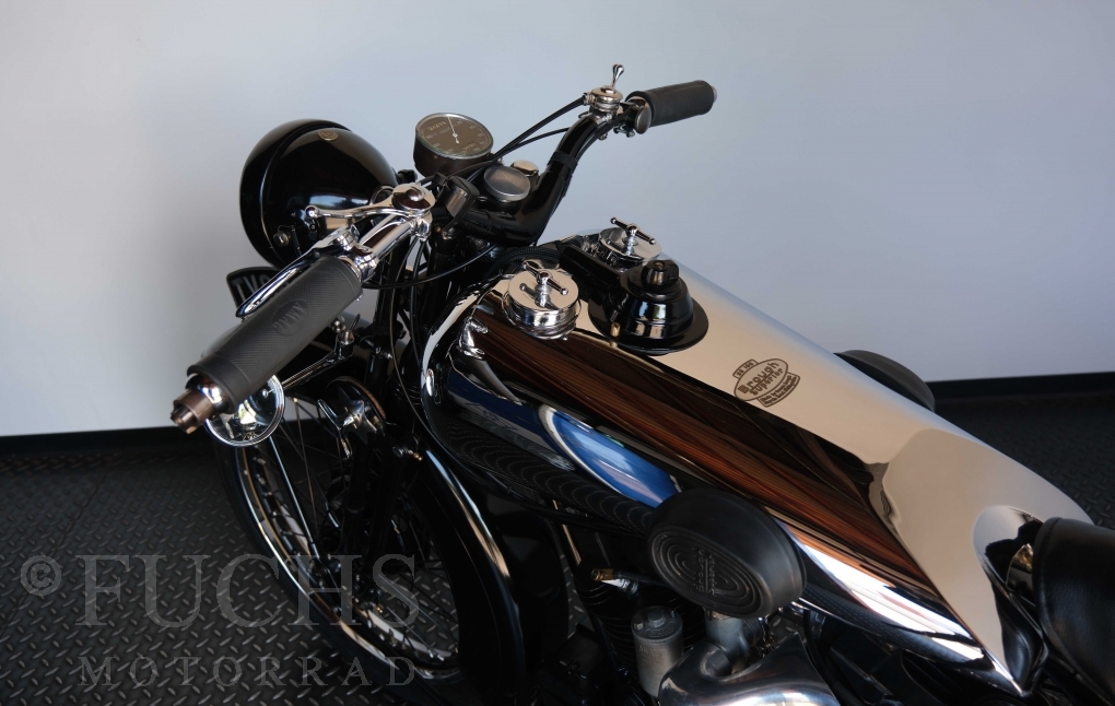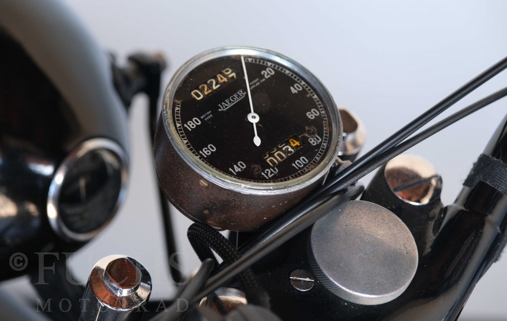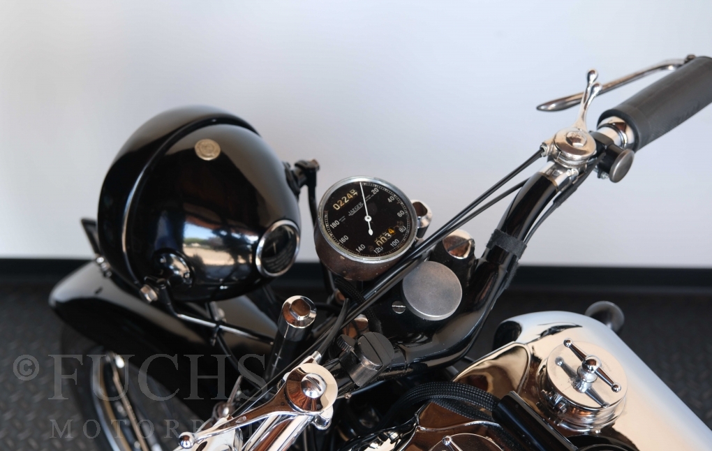 Die SS100 ist ein erstklassiges Exemplar. Zunächst ist es eine Offerte für anspruchsvolle Motorradsammler. Die Motornummer, Fahrgestellnummer und Getriebenummer entsprechen der Works Record card oder einfach formuliert die Brough hat matching numbers. Von eminenter Bedeutung ist der Motor, denn diese SS100 wurde noch serienmäßig mit einem JAP Motor ausgeliefert. Bei unserer SS100 ist der originale JTO/Z Motor verbaut. Im weiteren Sinne ist die Brough in einem erstklassigen optischen und technischen Zustand und selbstverständlich fahrfertig. Deutsche Fahrzeugpapiere liegen vor.
