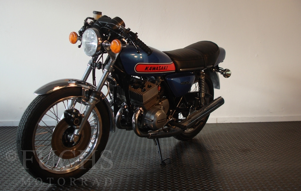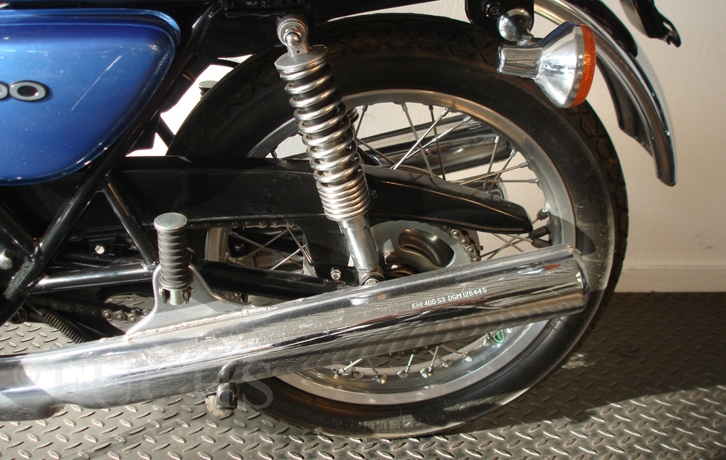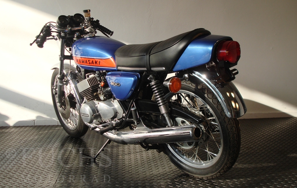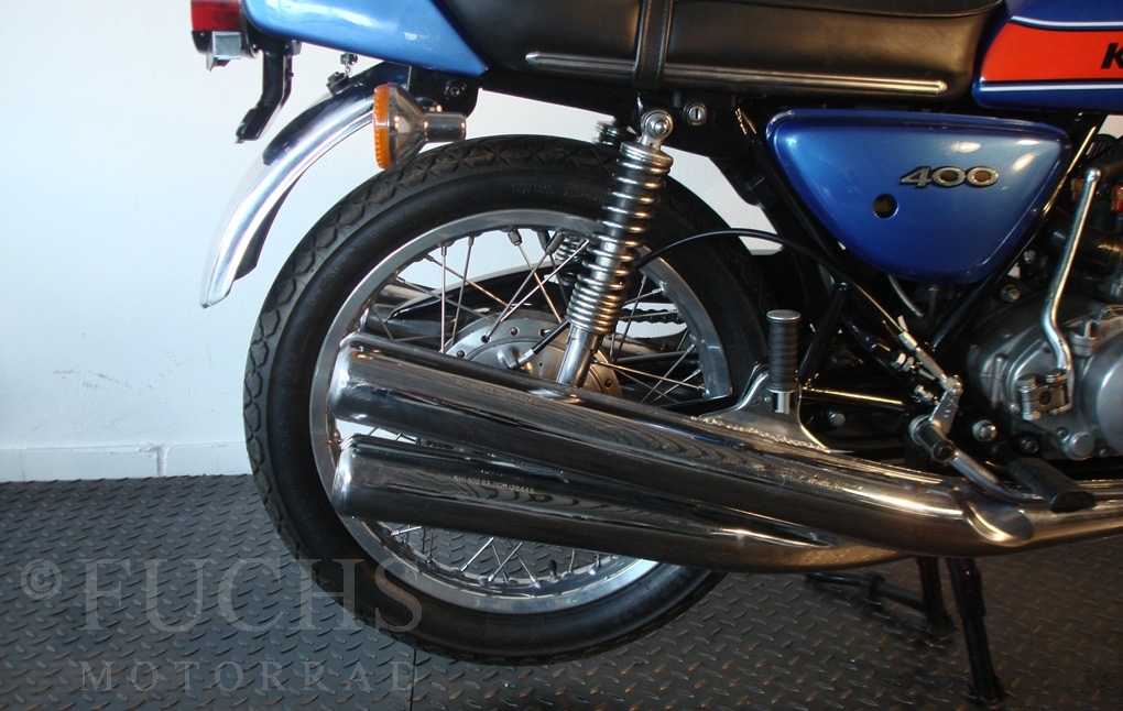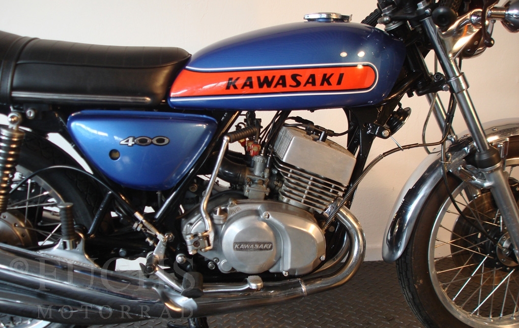 The model KH 400 S3 was produced between 1973 and 1976. In 2003 our Kawasaki was restored. Then it runs 3.500 km. The KH 400 S3 is in optical and technical good conditions.