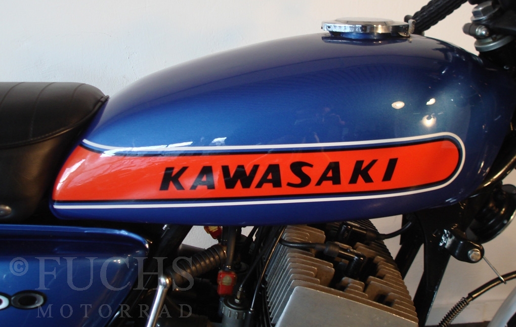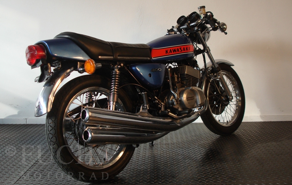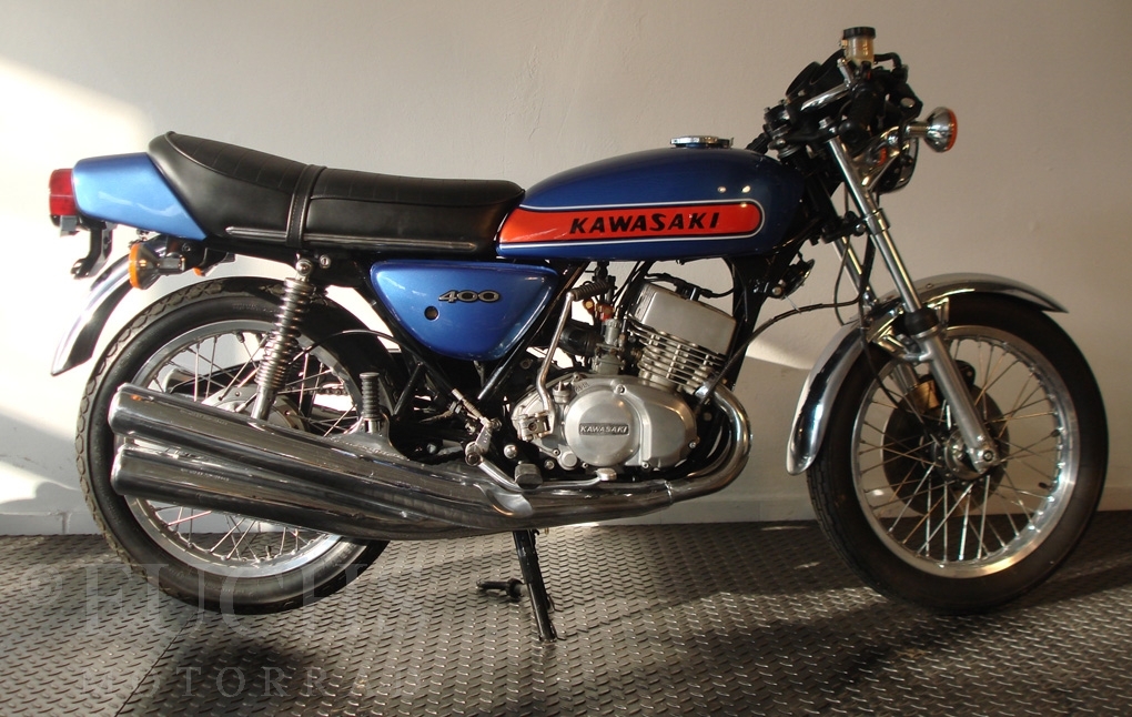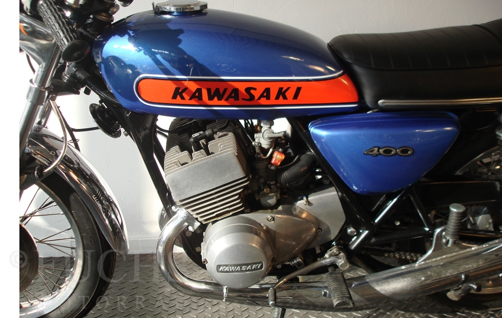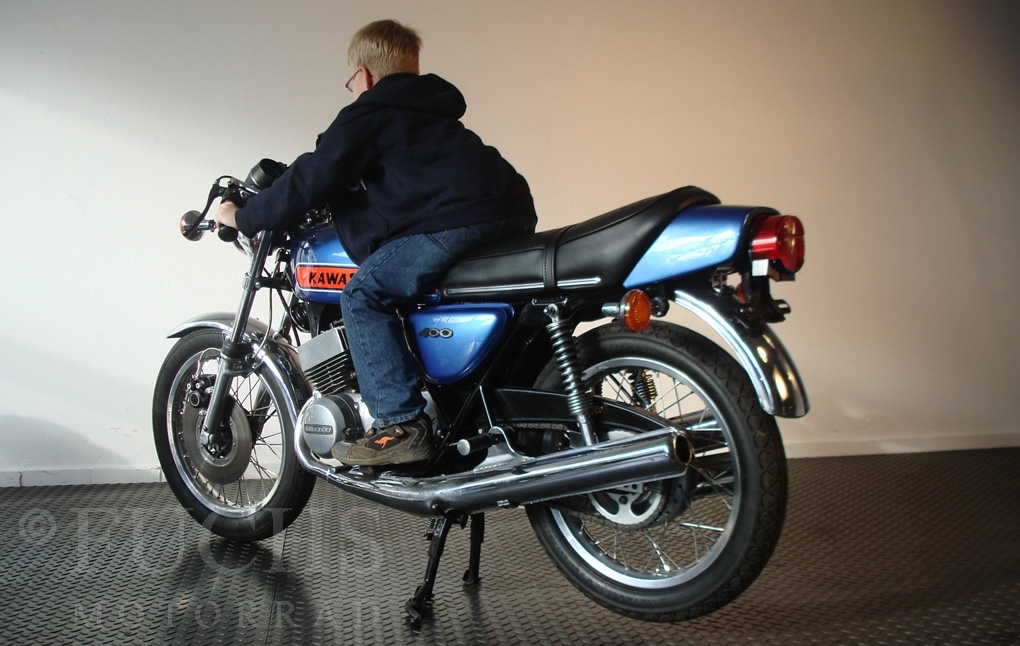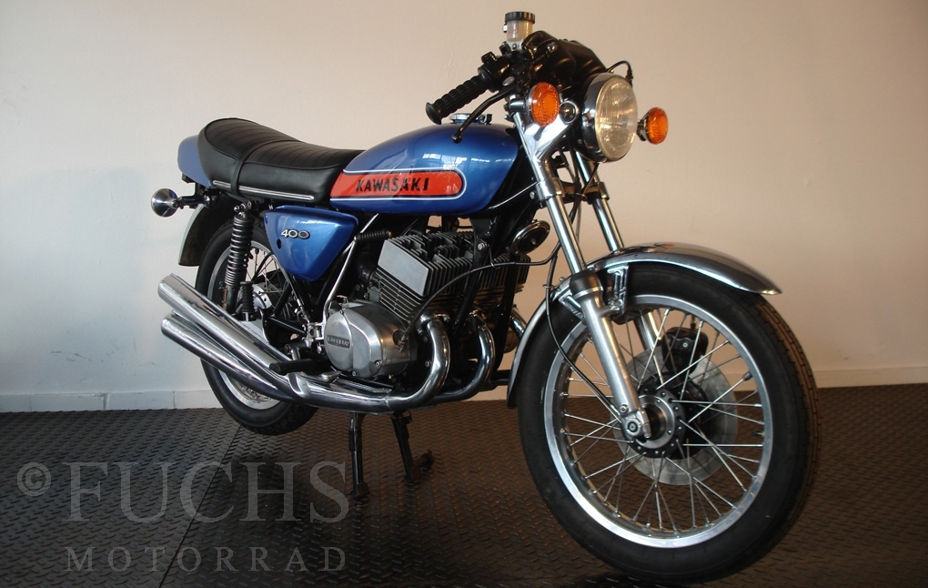 The model KH 400 S3 was produced between 1973 and 1976. In 2003 our Kawasaki was restored. Then it runs 3.500 km. The KH 400 S3 is in optical and technical good conditions.