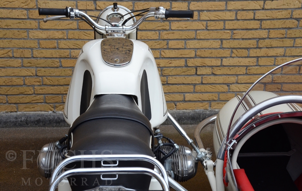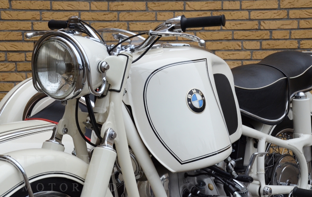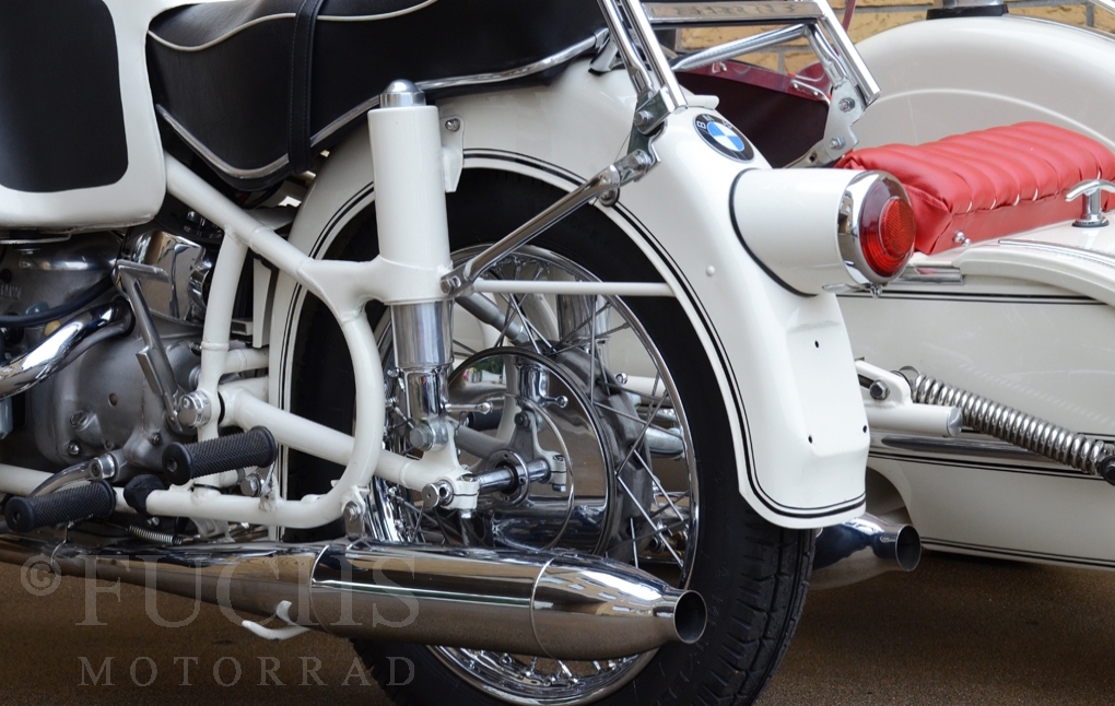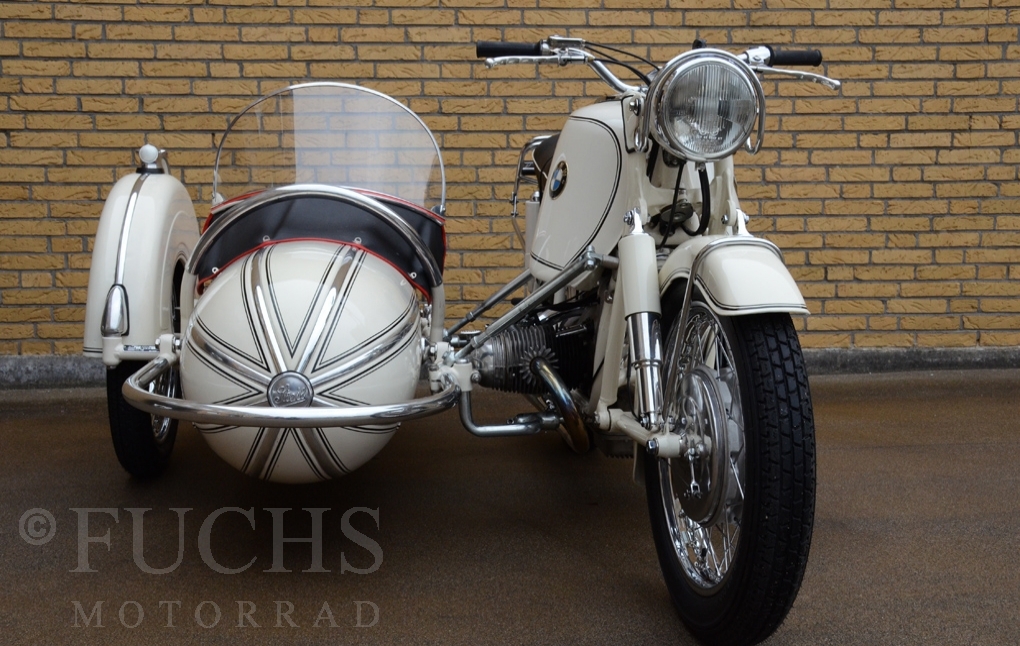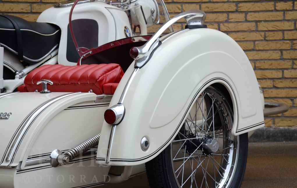 Our BMW sidecar with the white colour is one of the most beautiful BMW Sidecar we could offer in the past years. Together with the mighty Heinrich tank and the attractive sidecar, a special BMW Sidecar was built. After we were not happy about the technical performance at first, the construction has been modified, so that now not only the appearance is right, also to drive makes a lot of fun. But there is a downside to accept, BMW has no matching numbers.