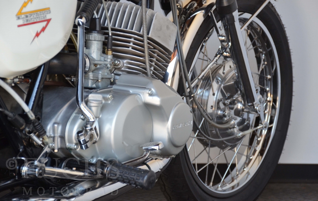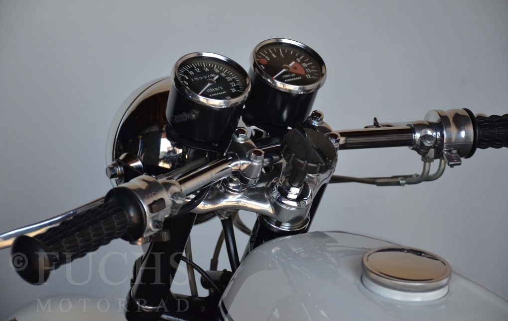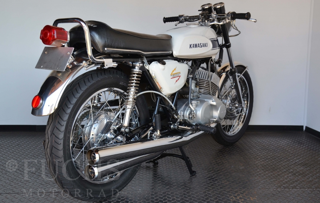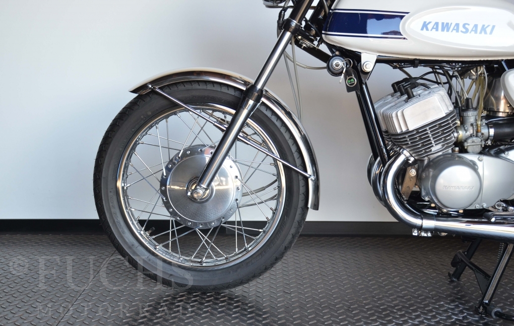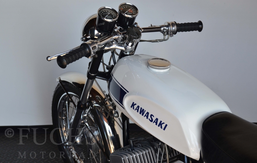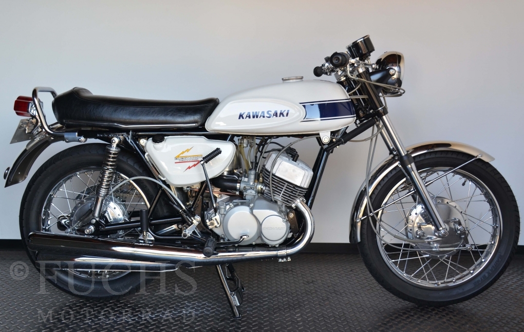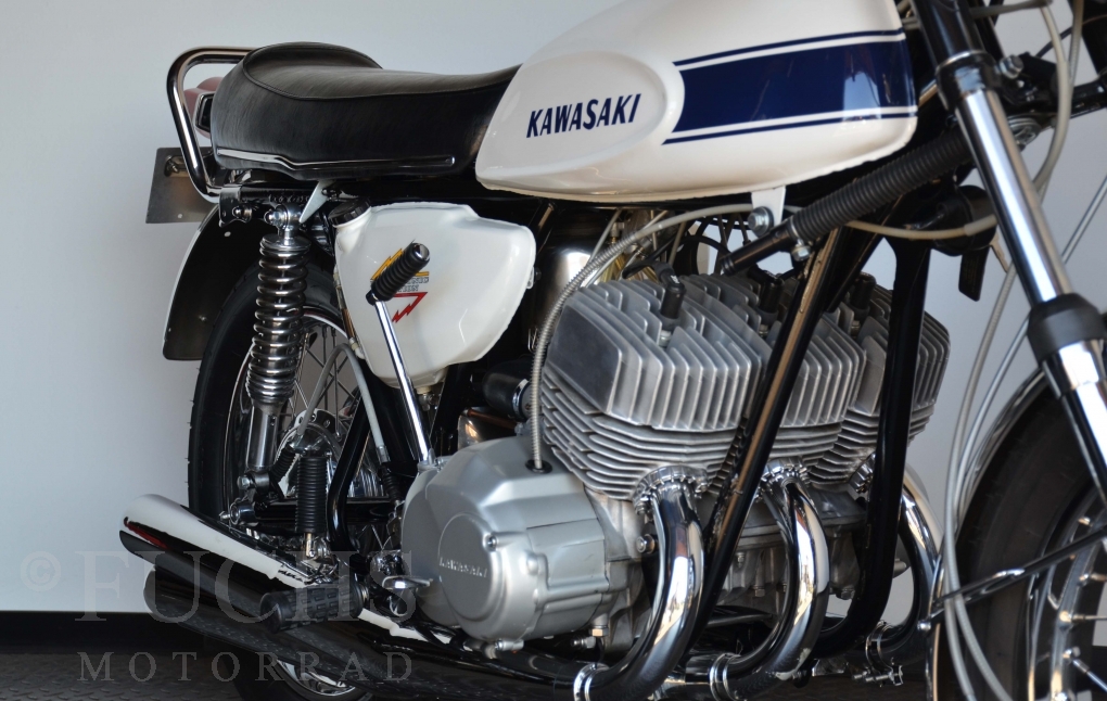 The H1 has been completely restored and is in almost perfect condition. The engine was overhauled as part of the restoration. With the midnight white paint and drum brakes, the H1 is one of the most beautiful two-stroke engines ever built.