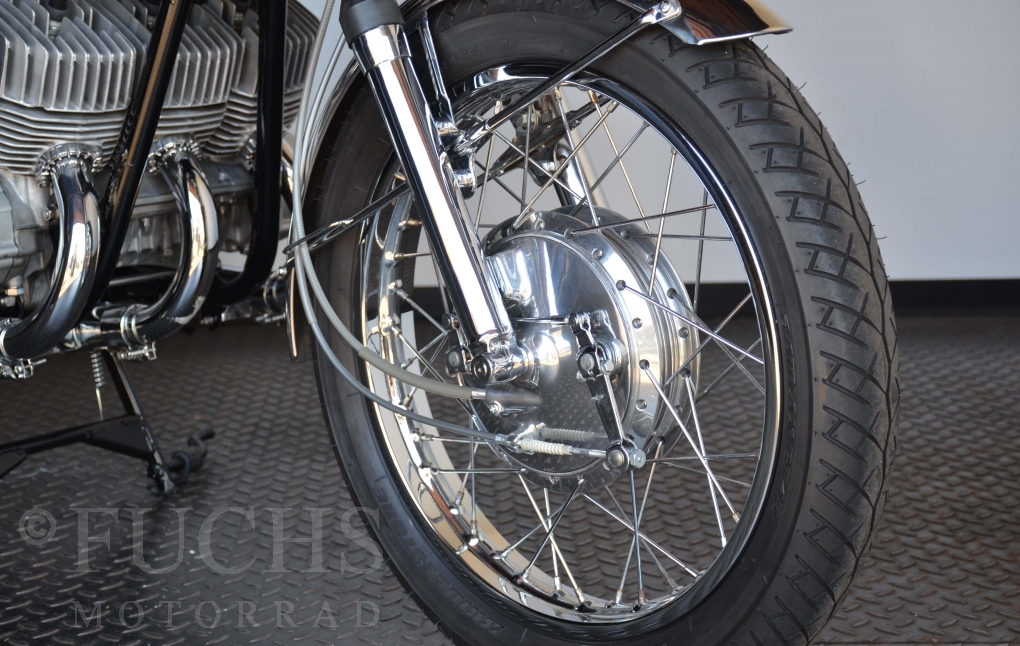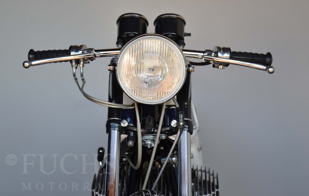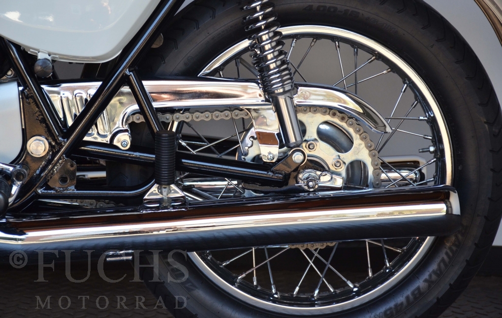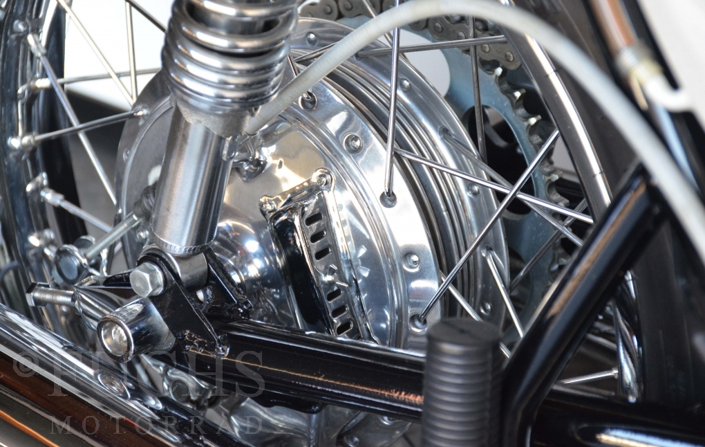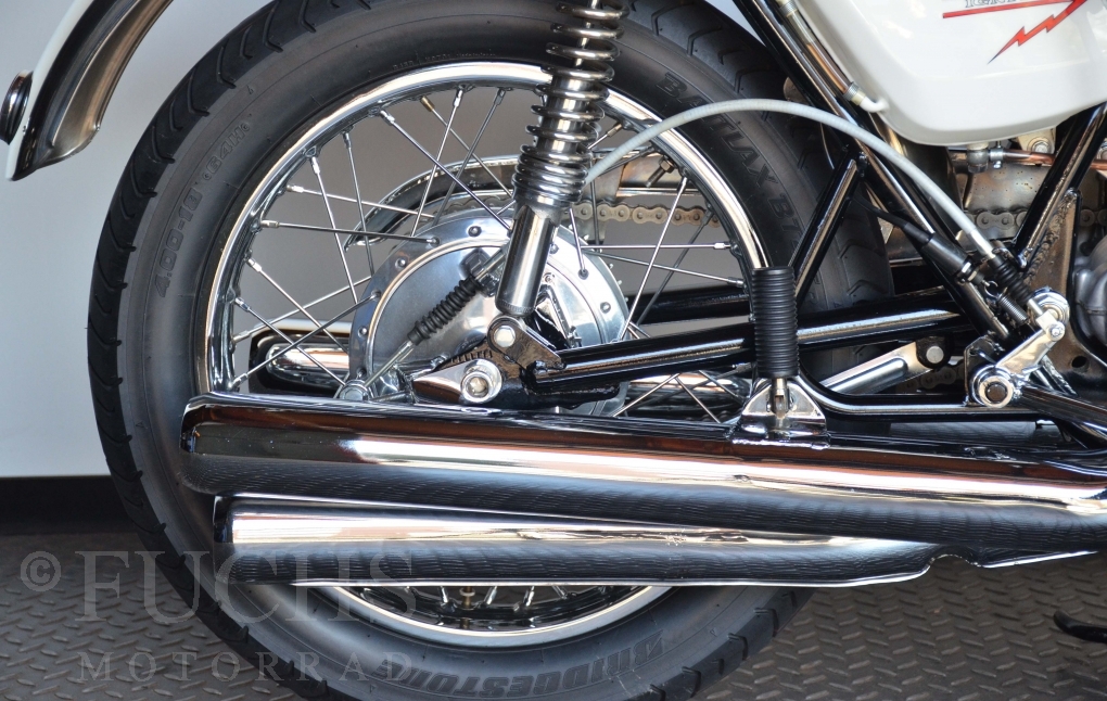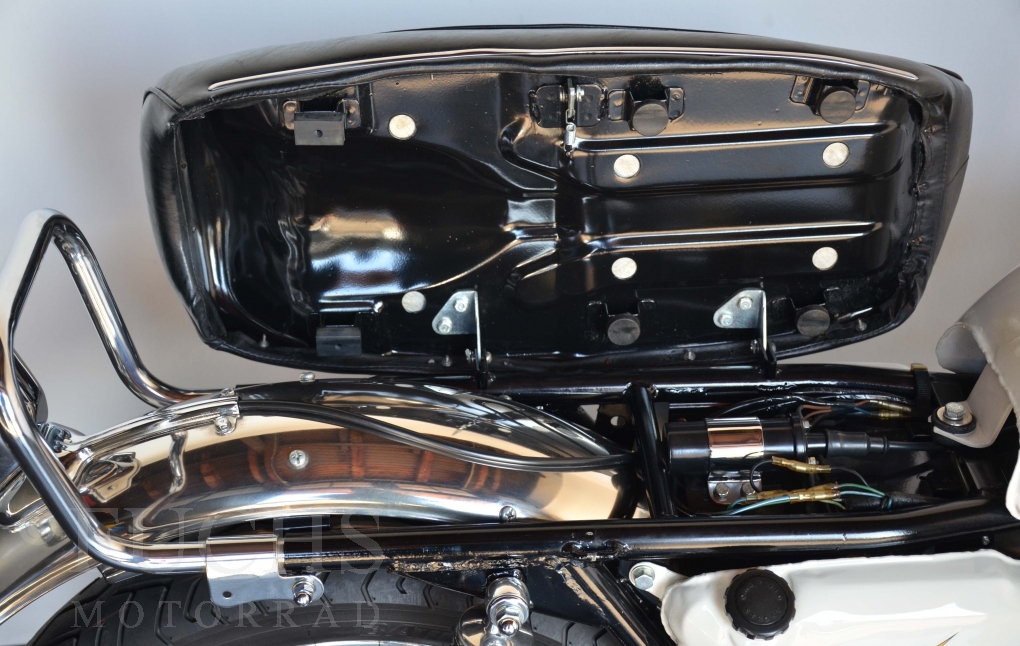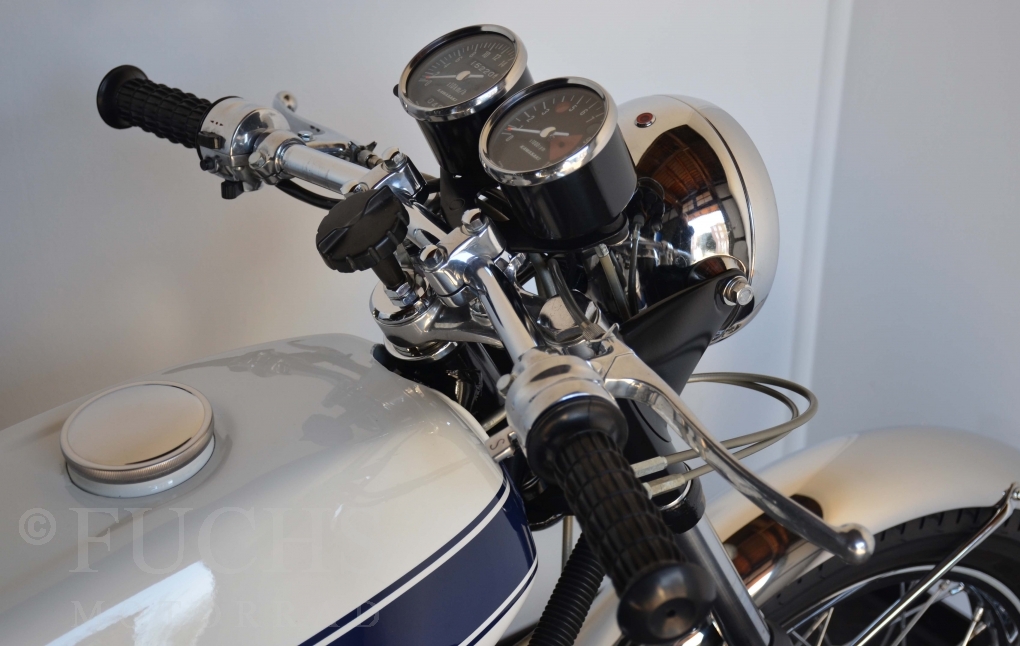 The H1 has been completely restored and is in almost perfect condition. The engine was overhauled as part of the restoration. With the midnight white paint and drum brakes, the H1 is one of the most beautiful two-stroke engines ever built.