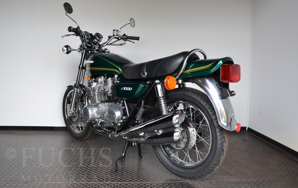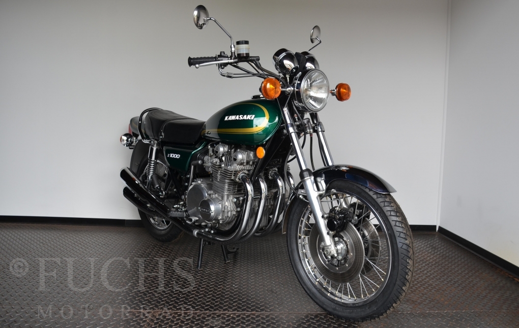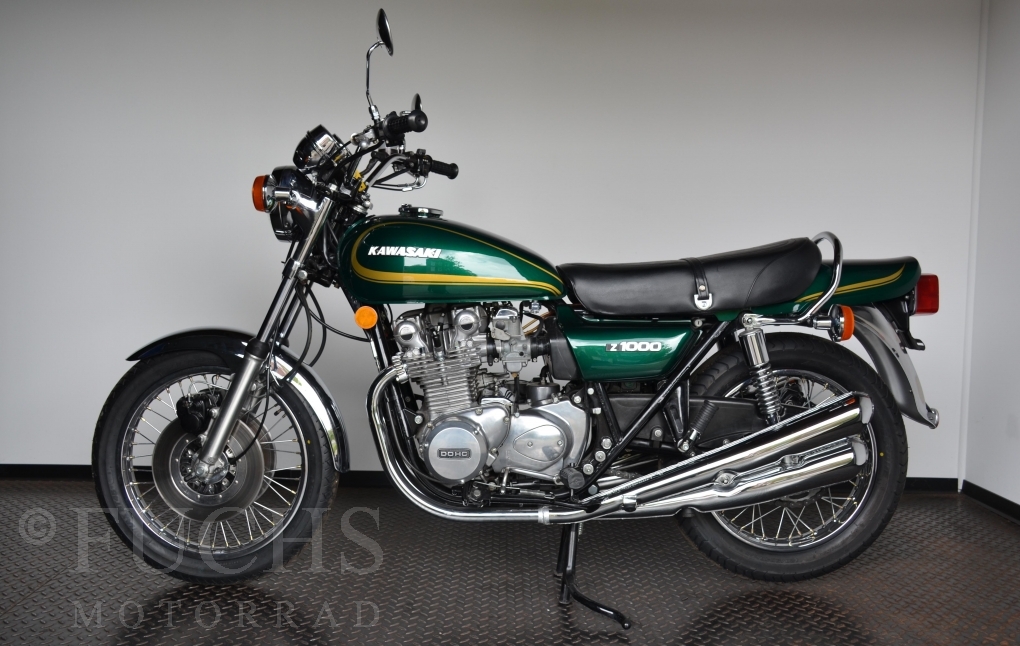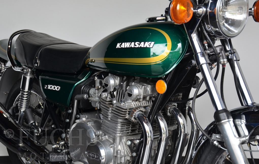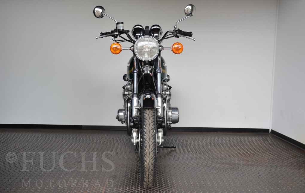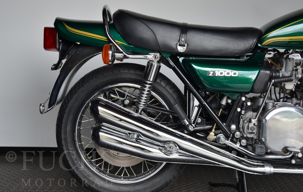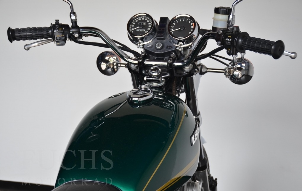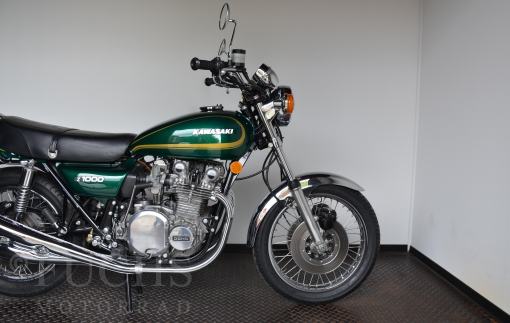 In the mid-1970s, the Kawasaki also and offered a 1000ccm motorcycle. The brake system was supplemented with a rear disc brake. The engine running became a bit more sophisticated and engine power rose to 63 KW. Our offered machine is a beautiful Z1000 in a restored, first-class condition.